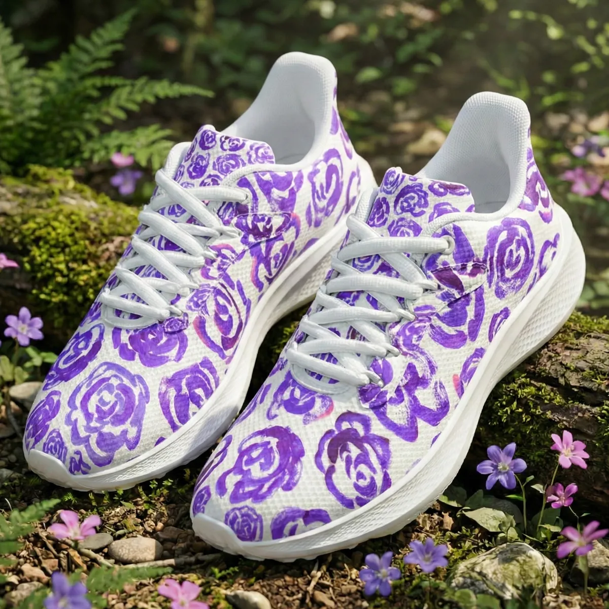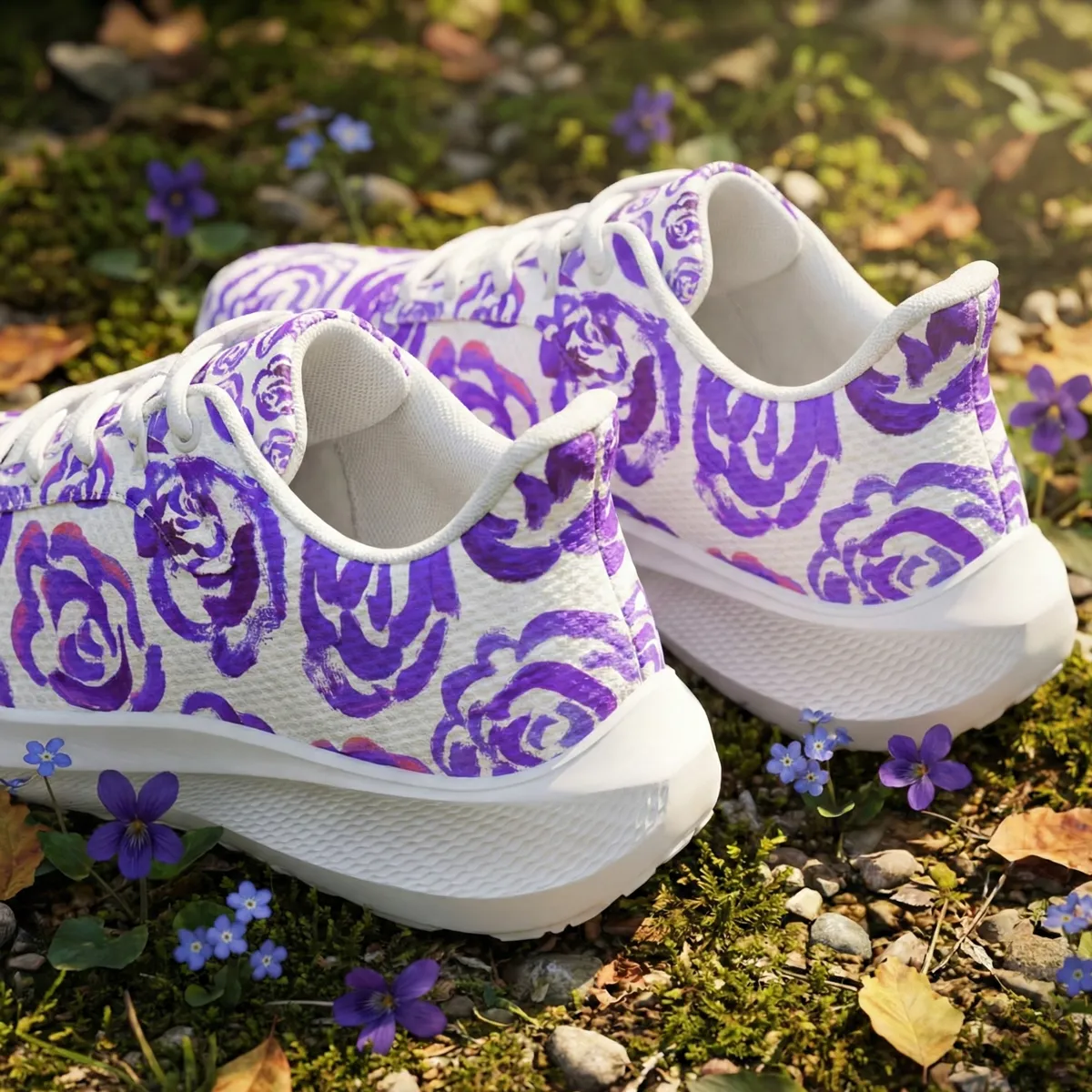 Running shoes with dark purple flower blossoms