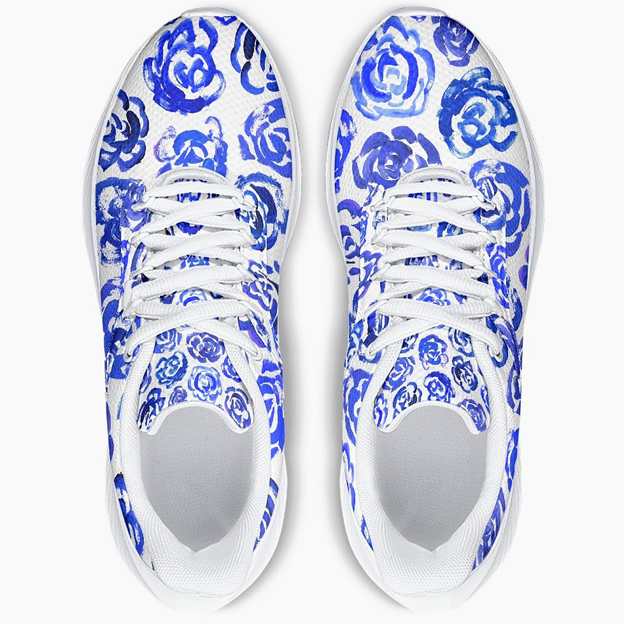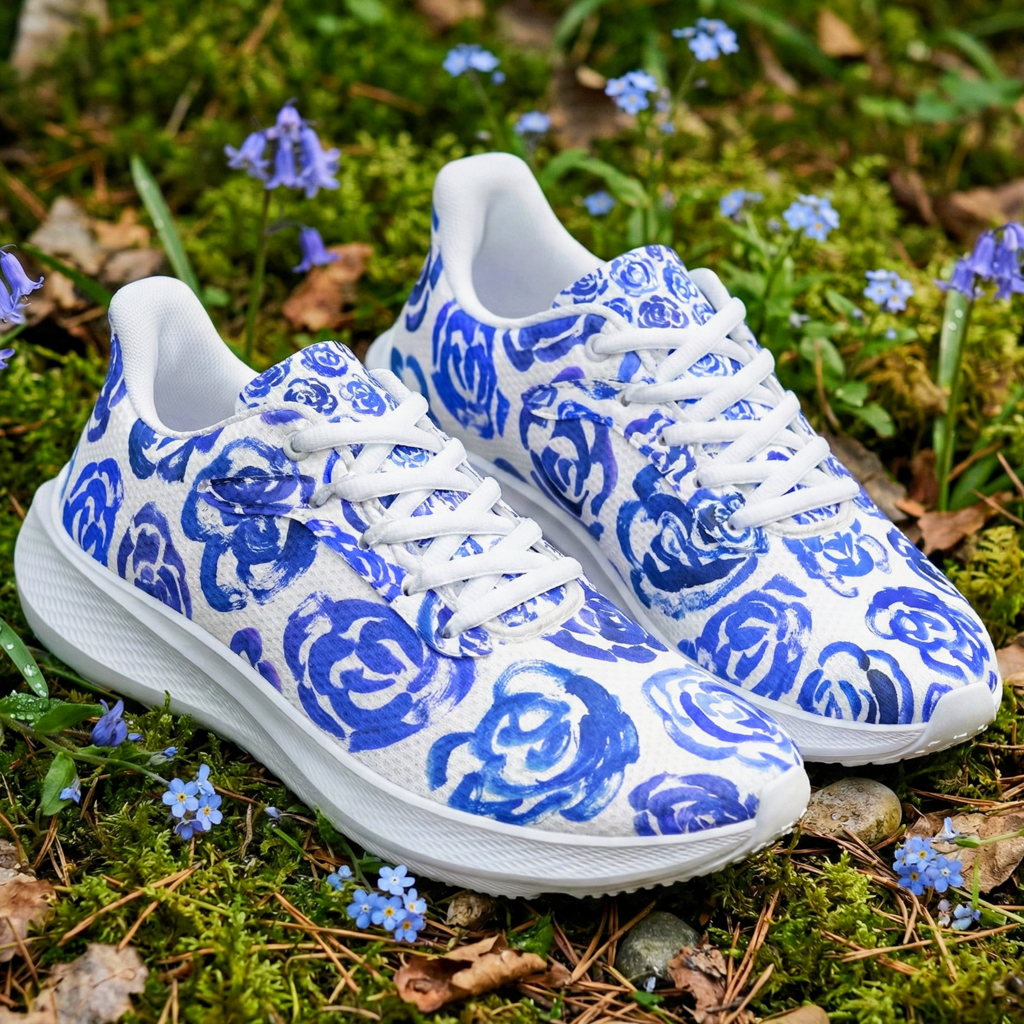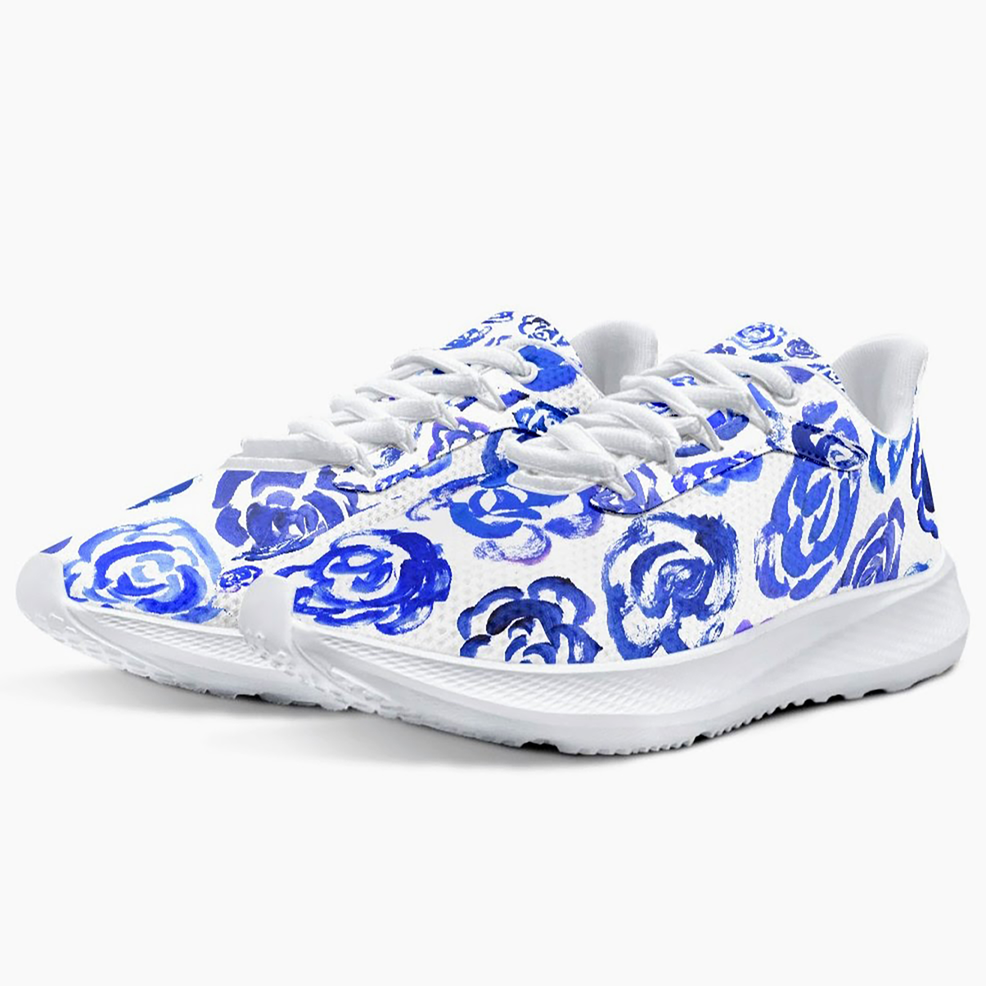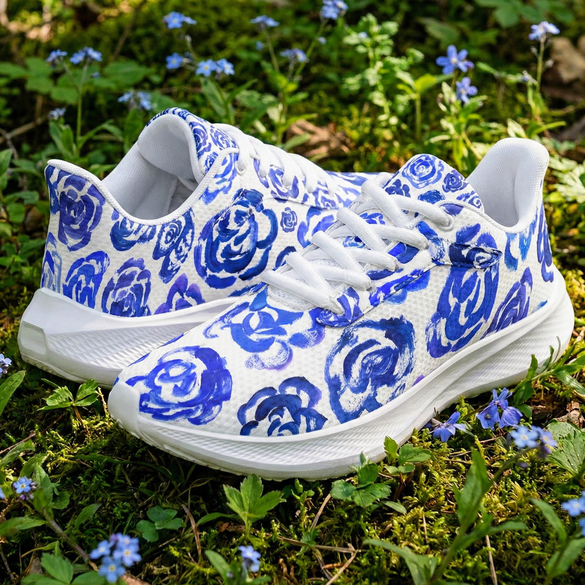 Unisex running shoes with dark blue flower blossoms. Women's & men's lightweight sports shoes.