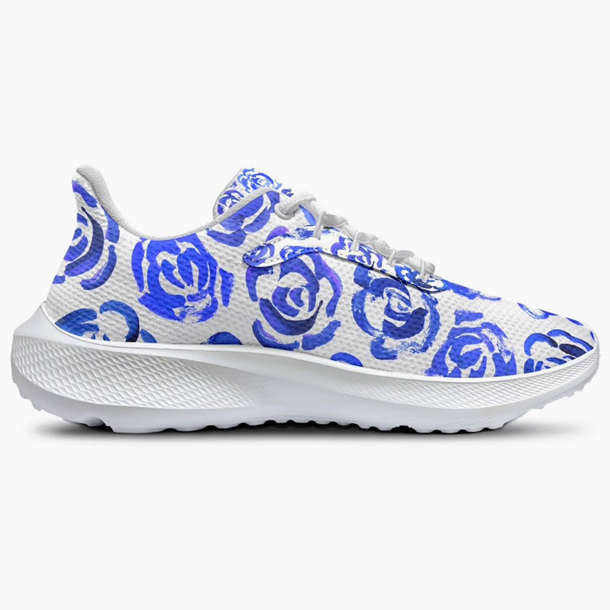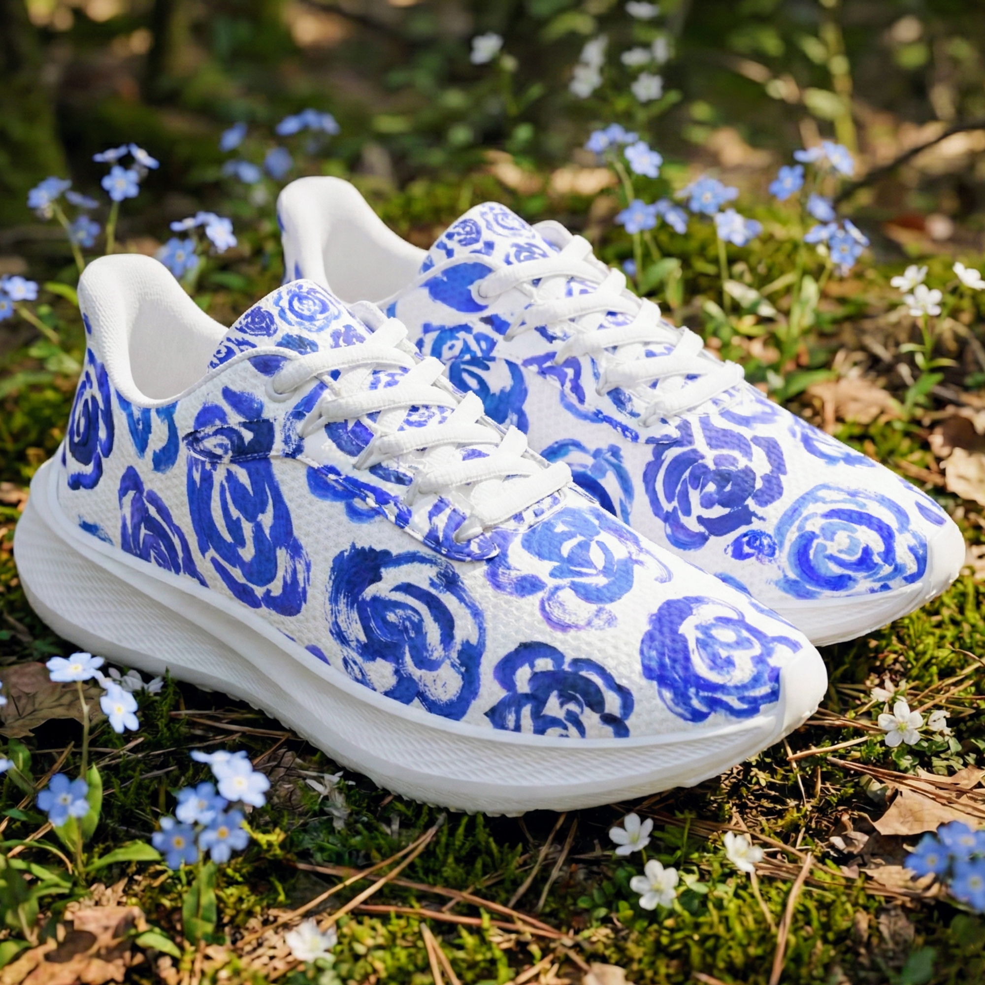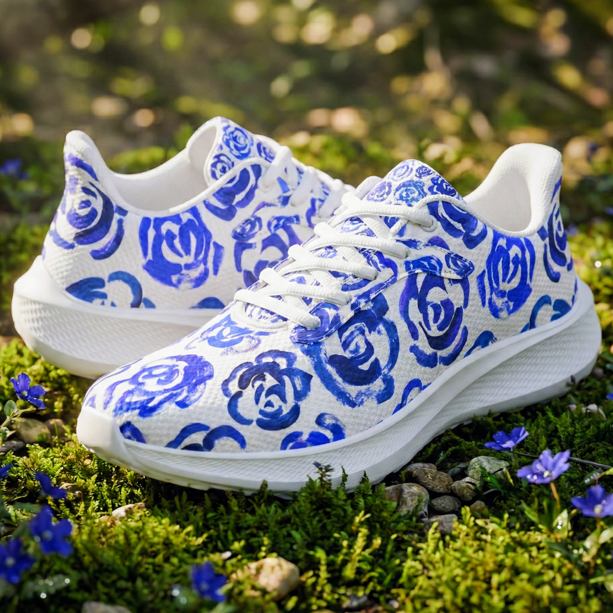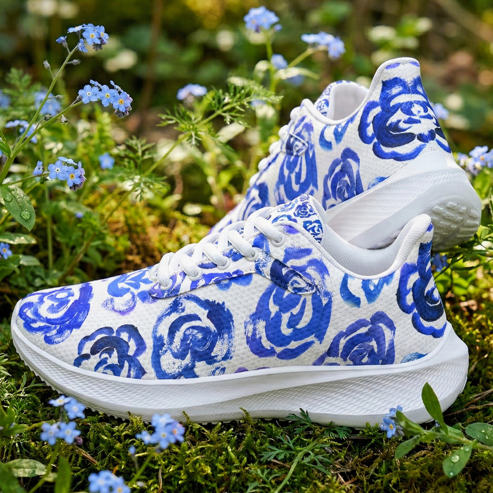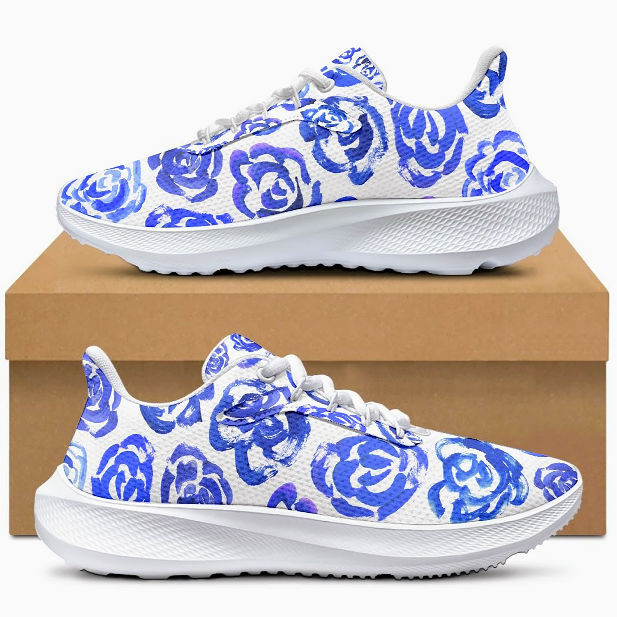 Unisex running shoes with dark blue flower blossoms. Women's & men's lightweight sports shoes.