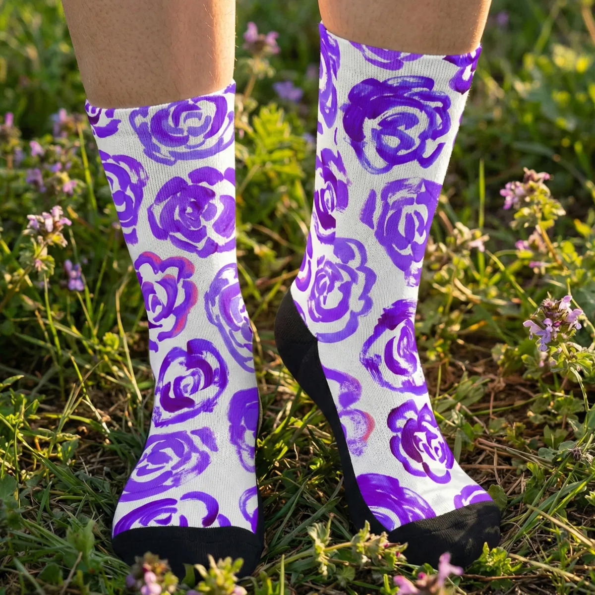 🌿 Style: from cottagecore to streetwear These unisex socks bridge the gap between men’s floral socks and women’s patterned crew socks. The purple floral design fits perfectly into current trends like dopamine dressing or Harajuku style.