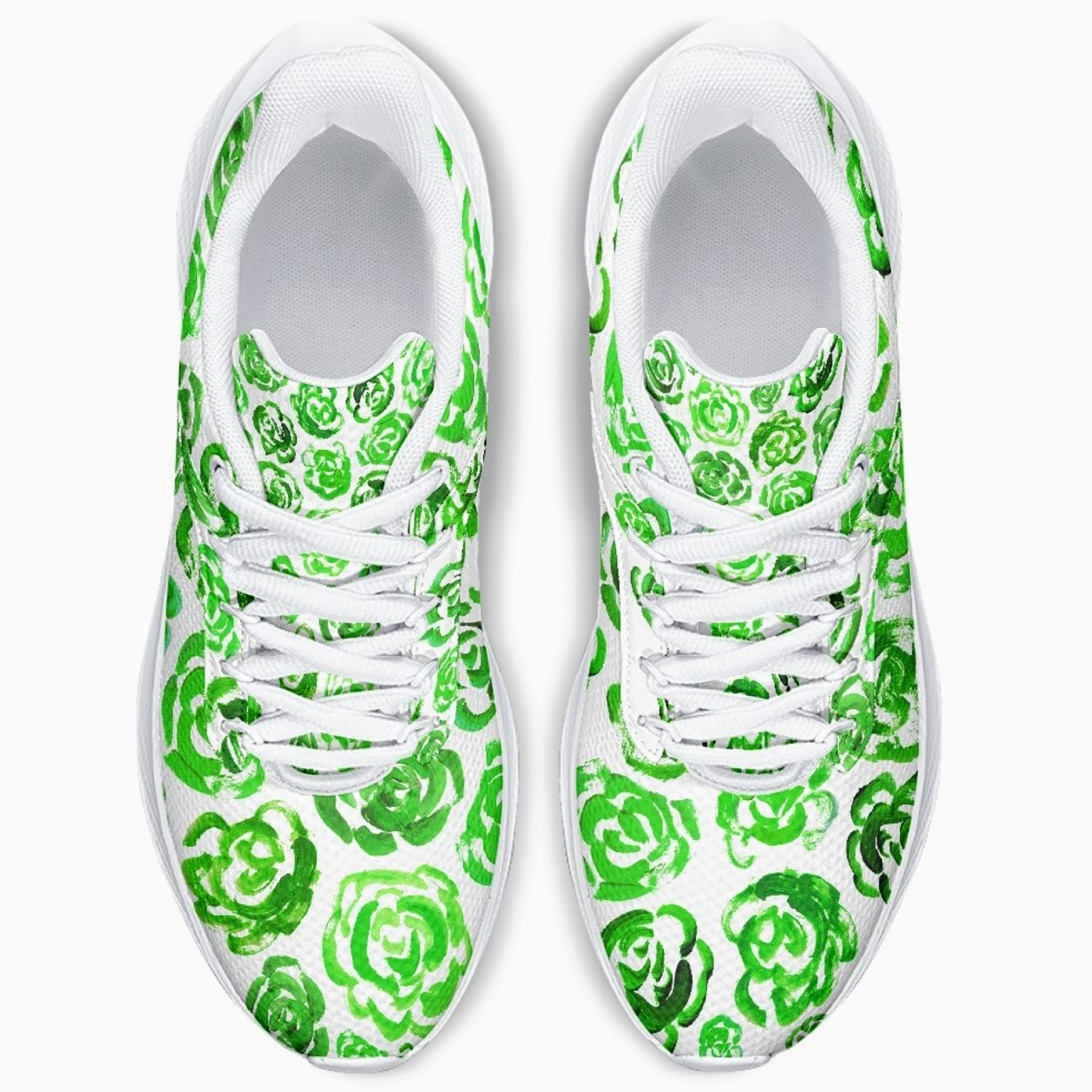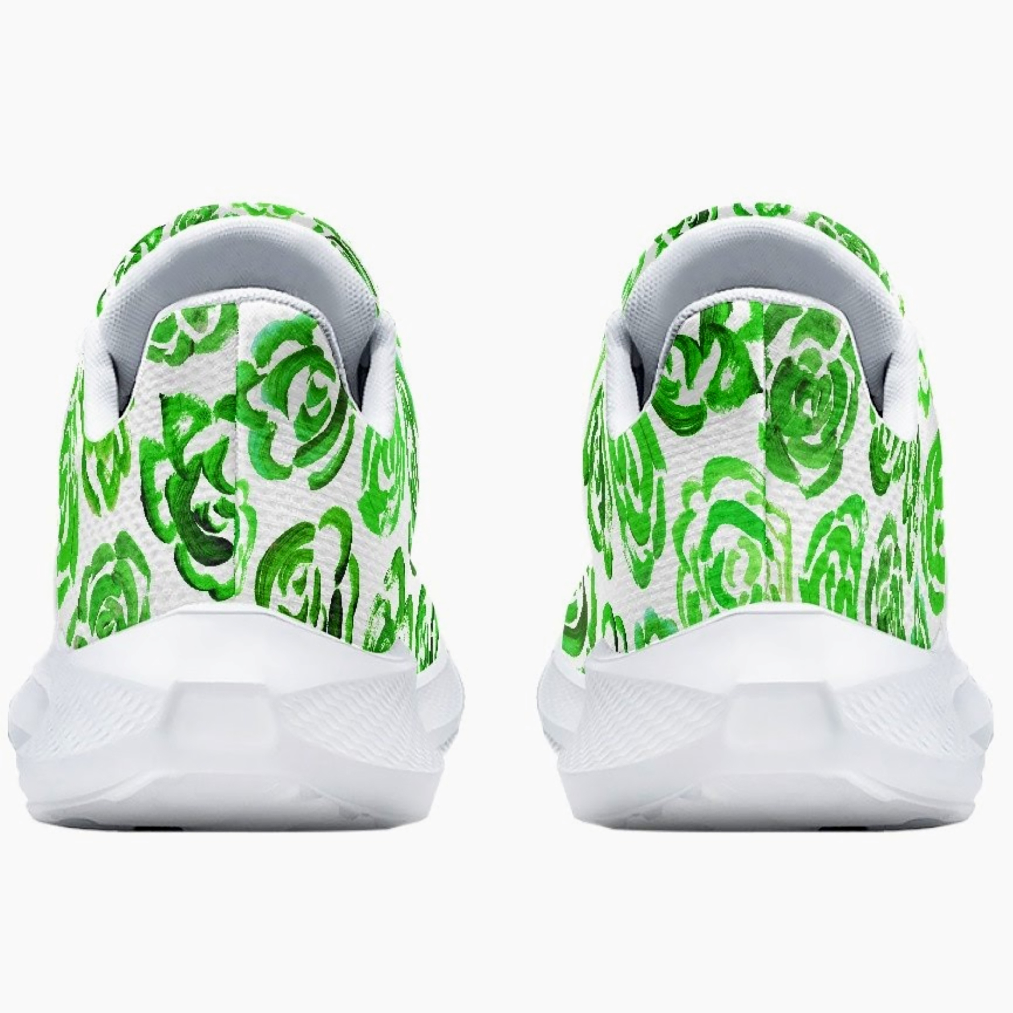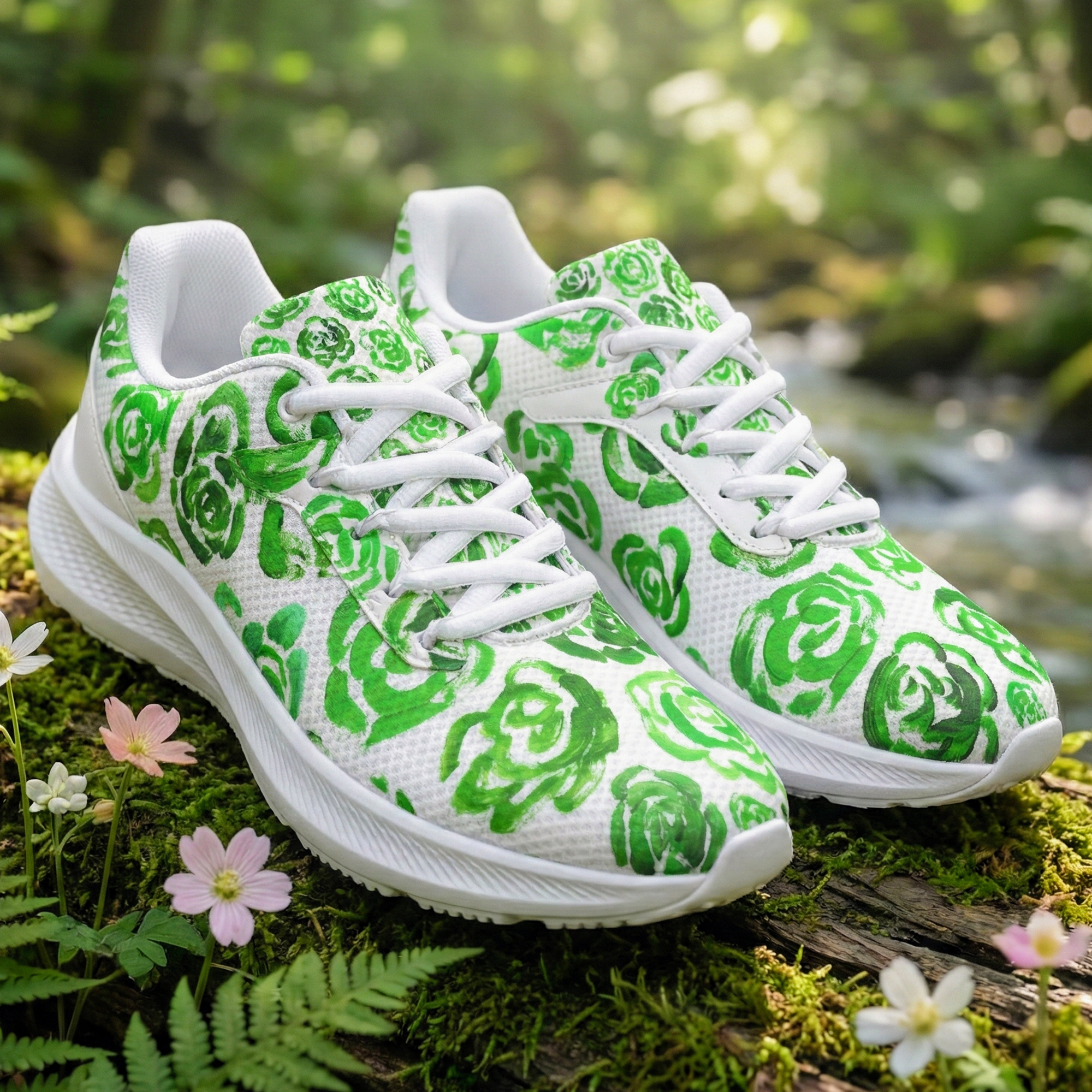 Green Flower Shoes | Unisex Running Shoes with Dark Green Flower Blossoms | Floral Pattern Sneakers