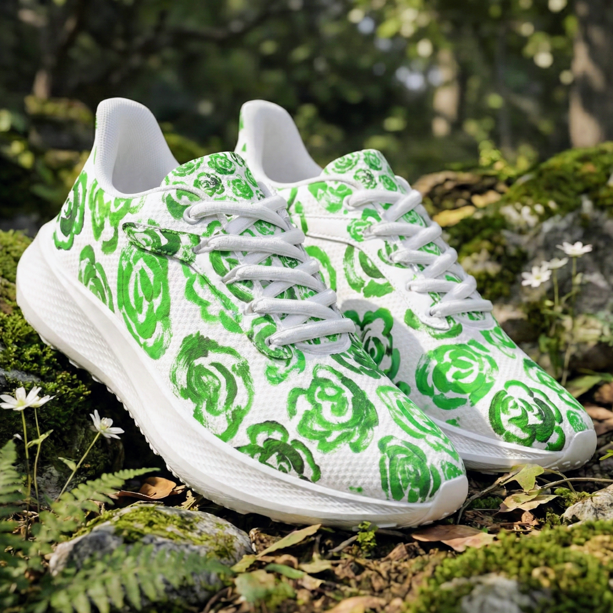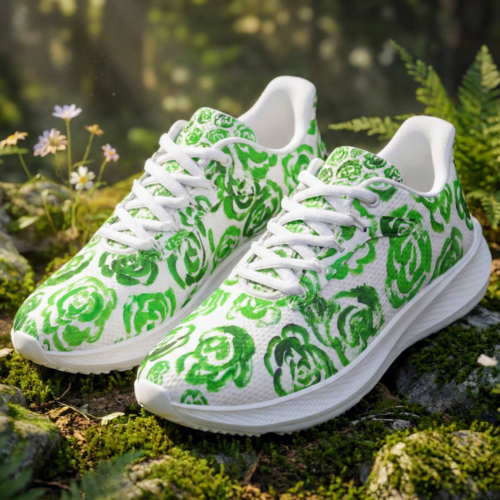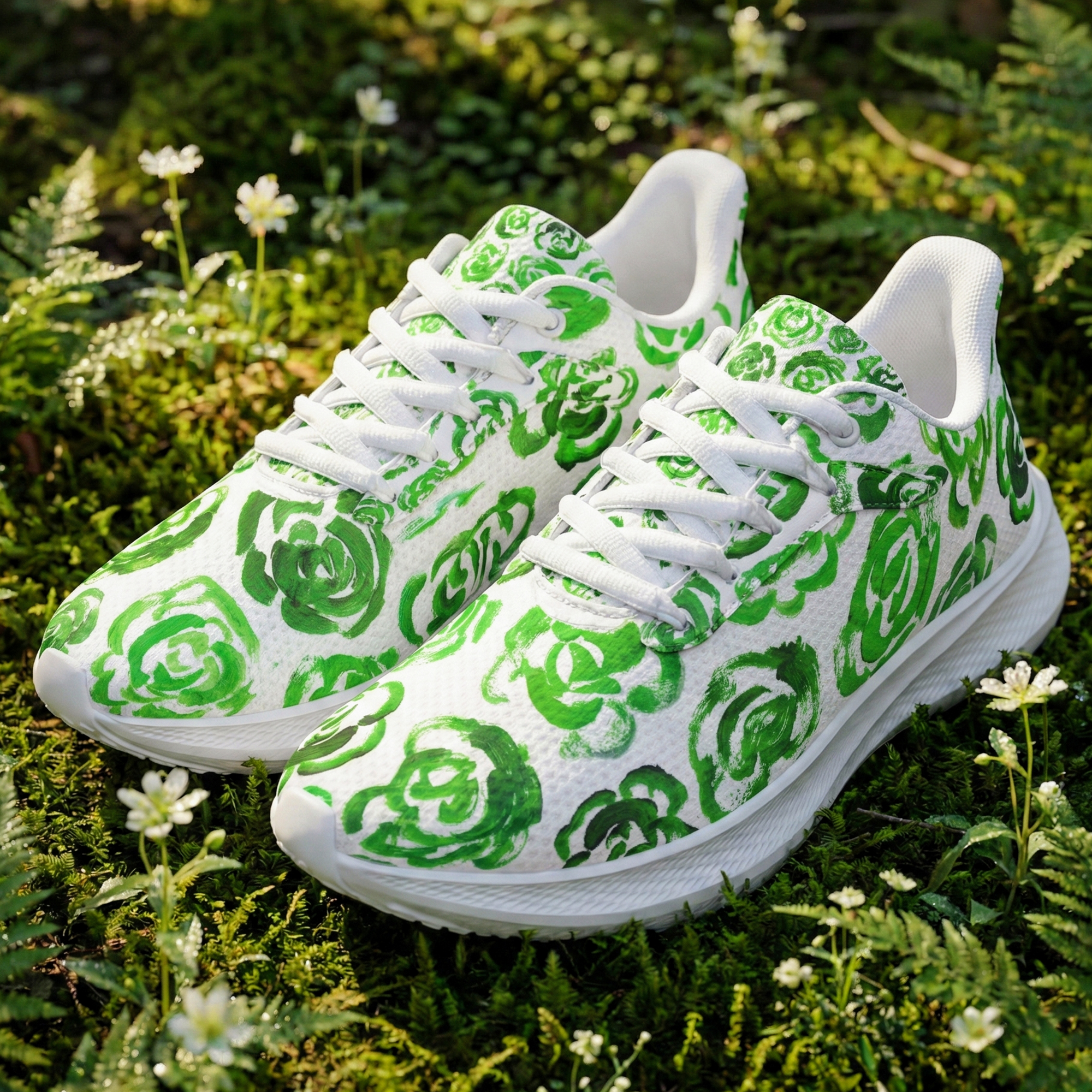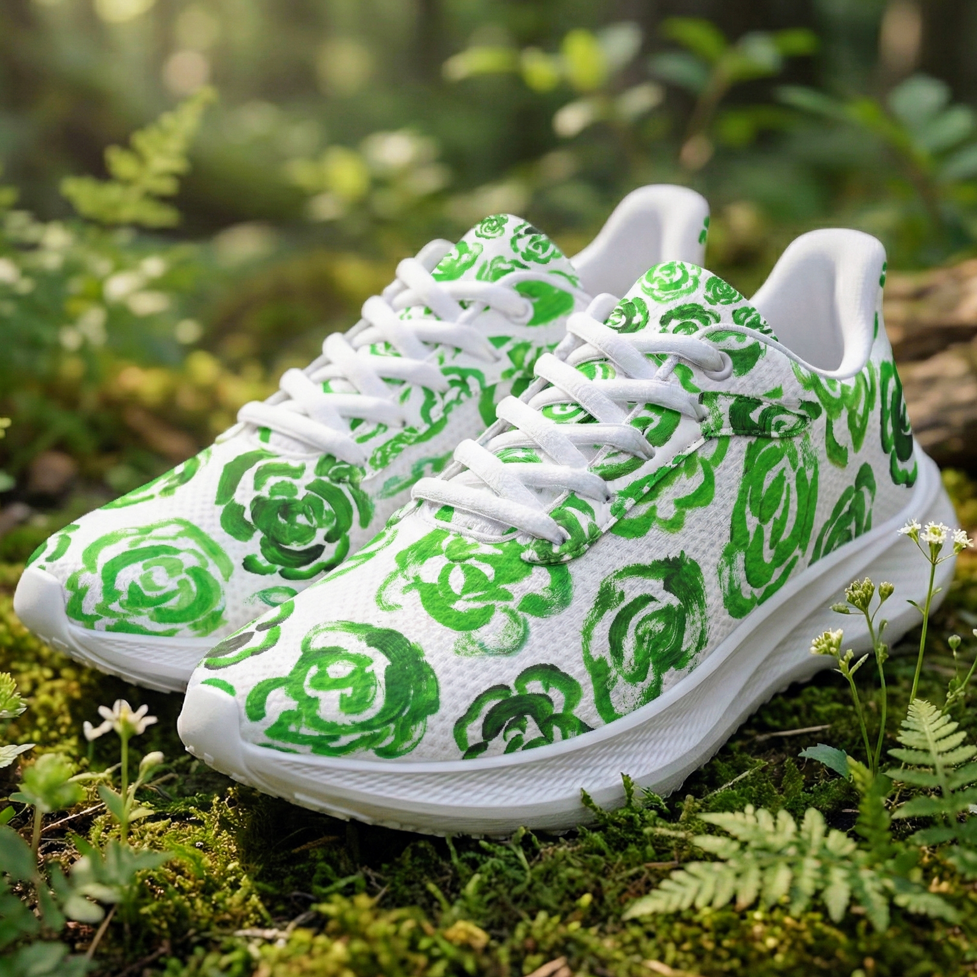 Green Flower Shoes | Unisex Running Shoes with Dark Green Flower Blossoms | Floral Pattern Sneakers