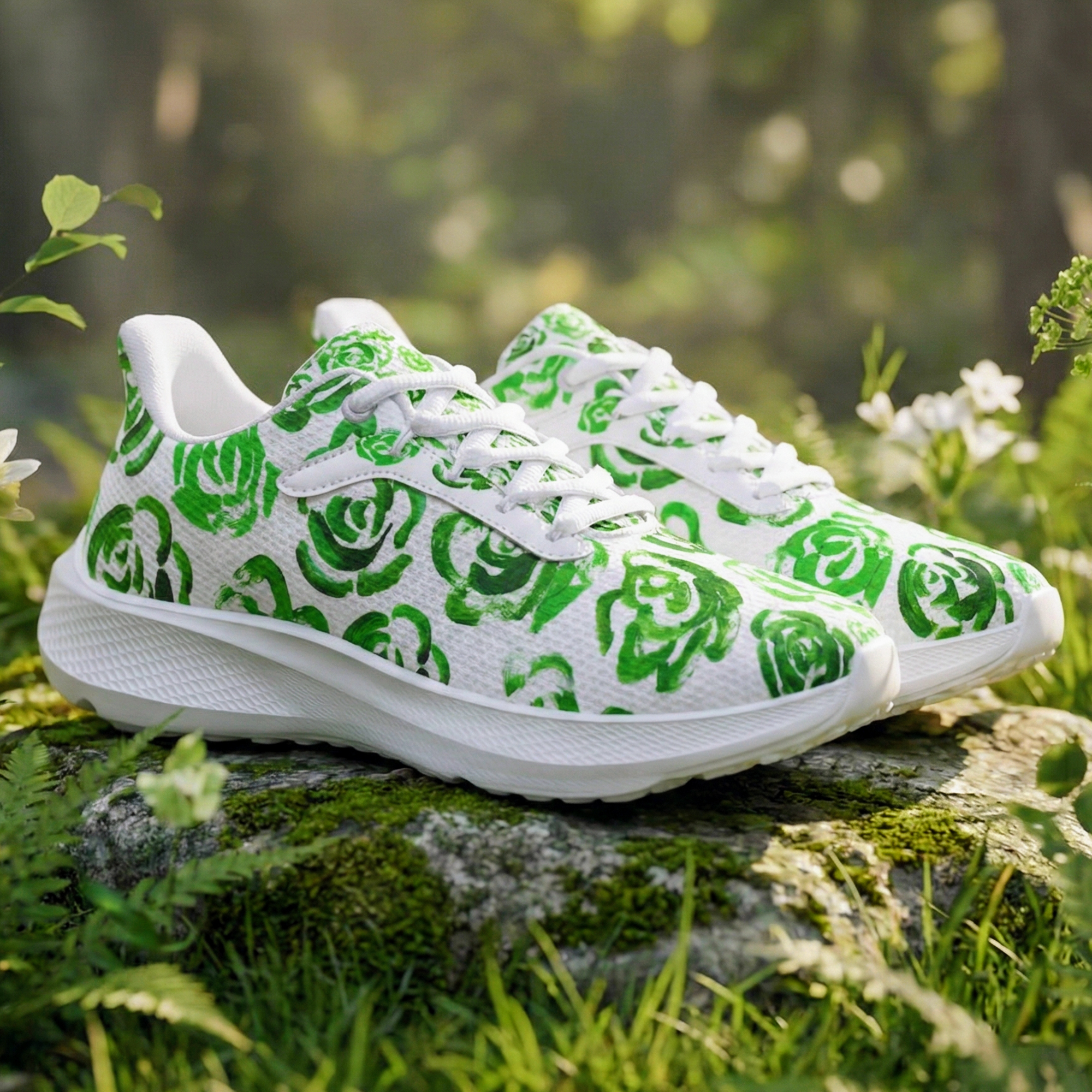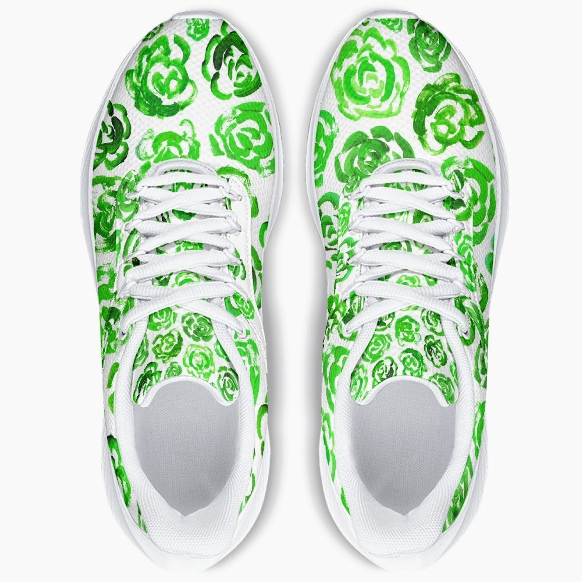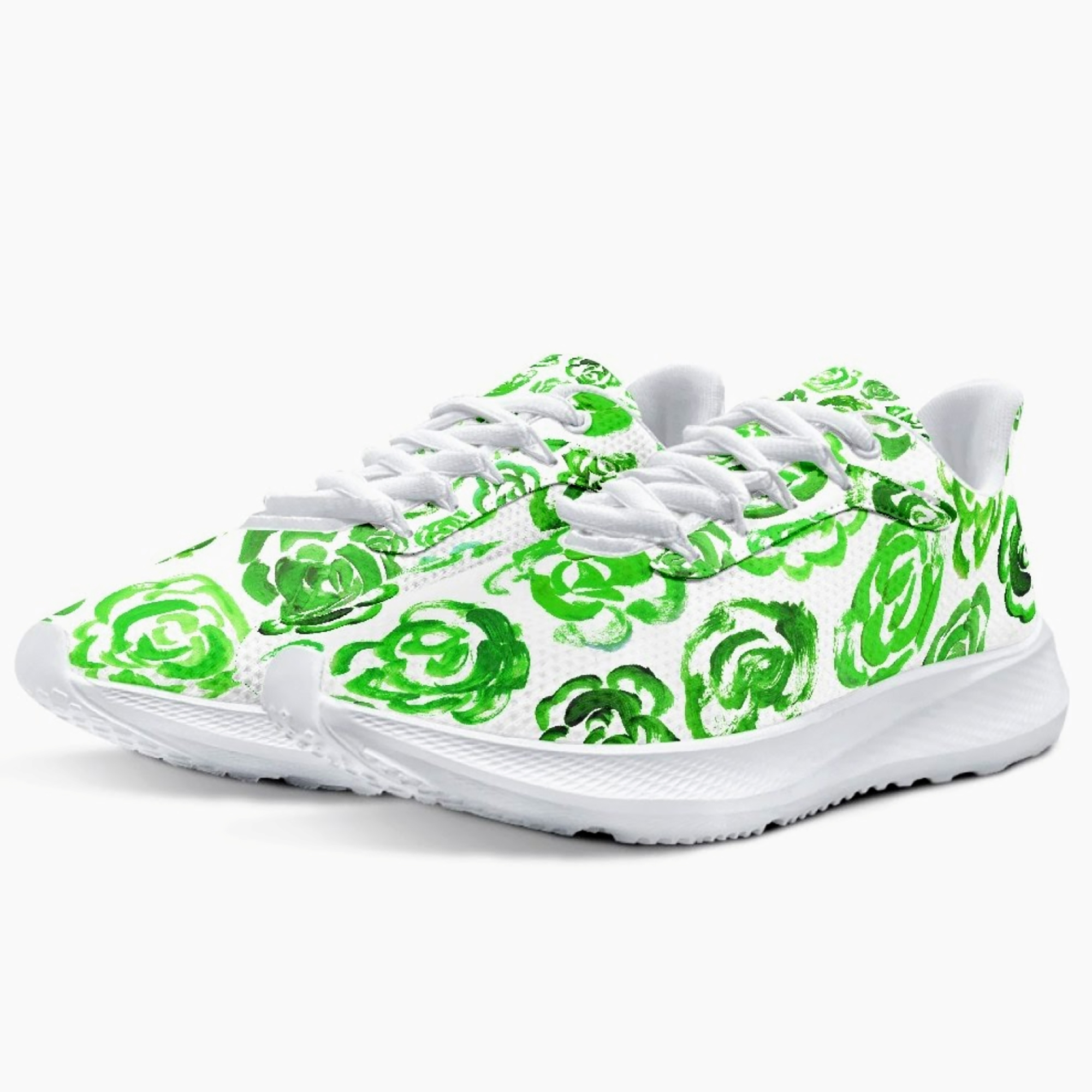 Unisex running shoes with dark green flower blossoms. Women's & men's lightweight sports shoes.