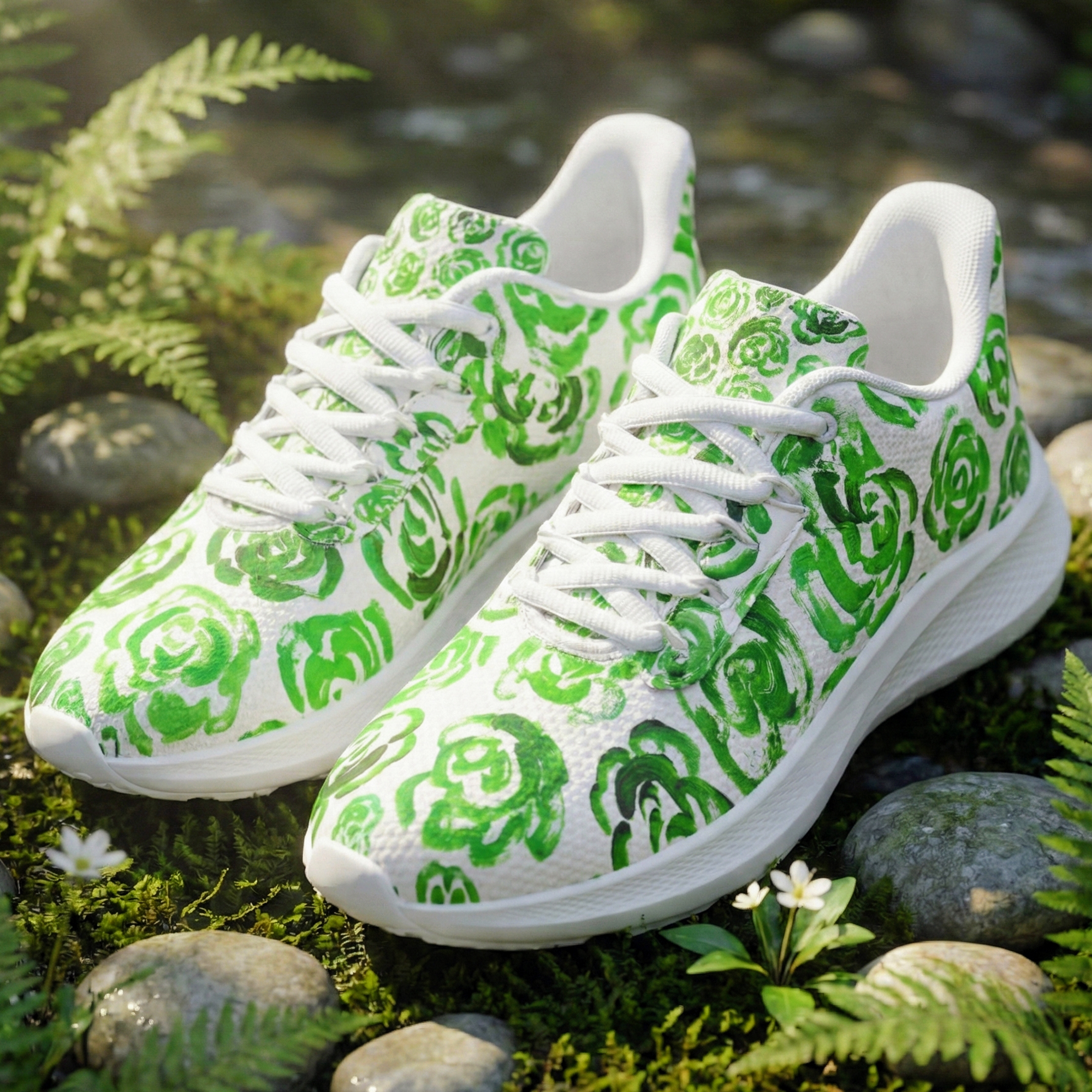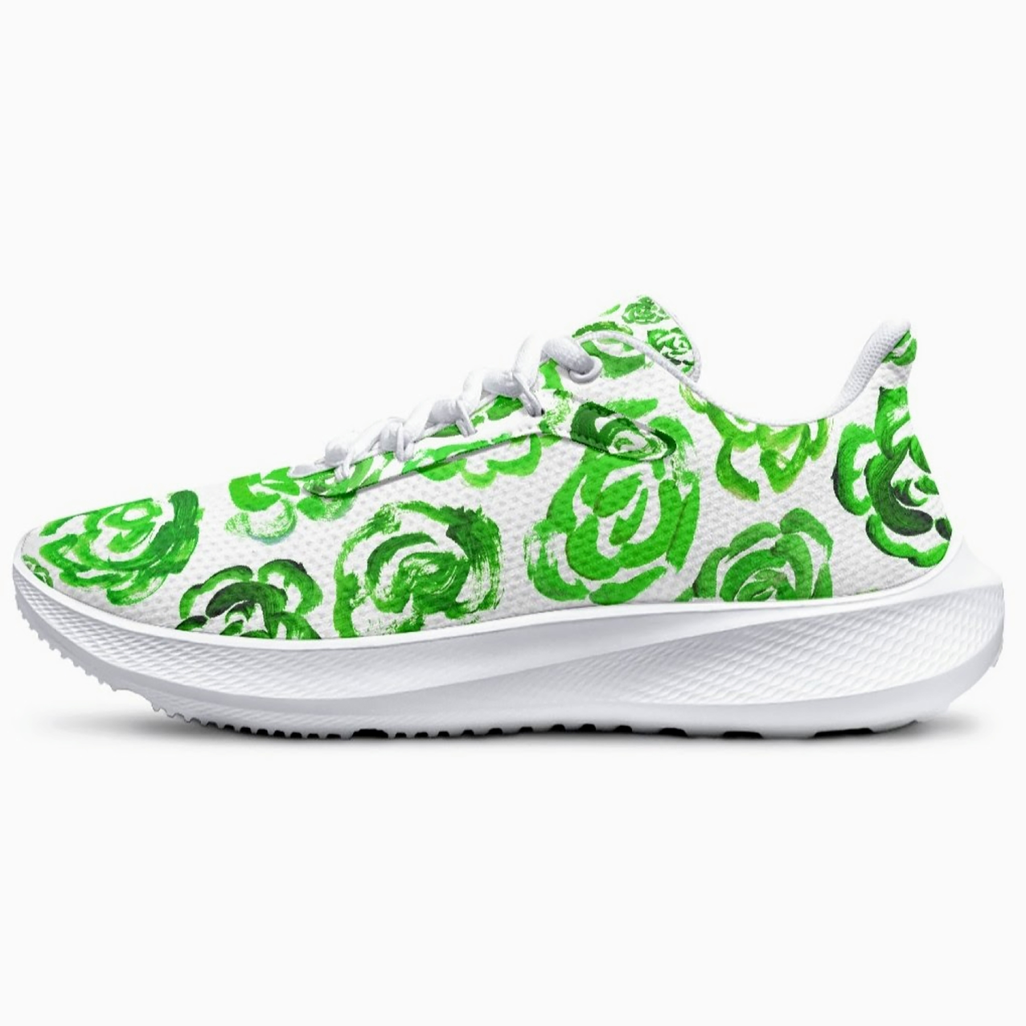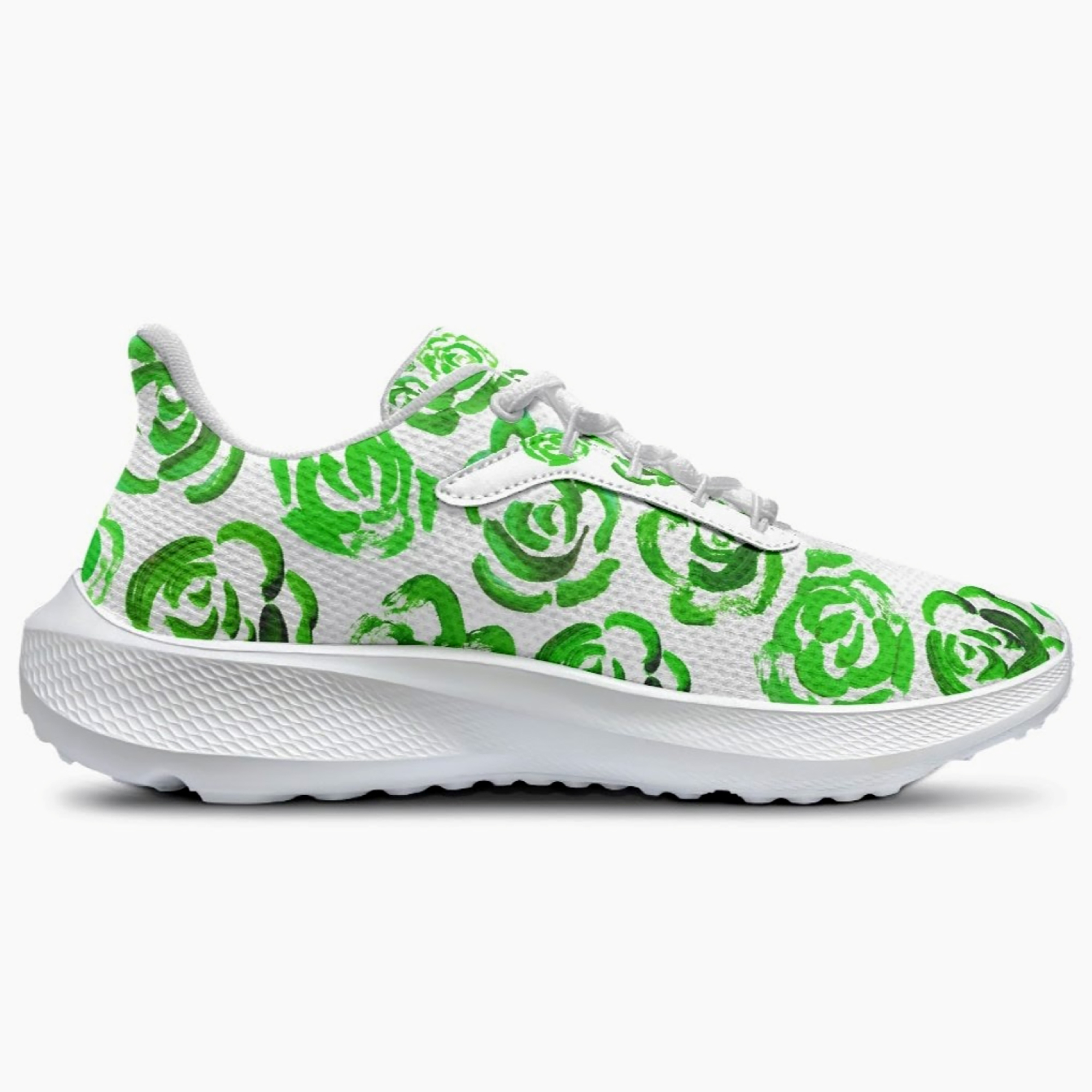 Unisex running shoes with dark green flower blossoms. Women's & men's lightweight sports shoes.