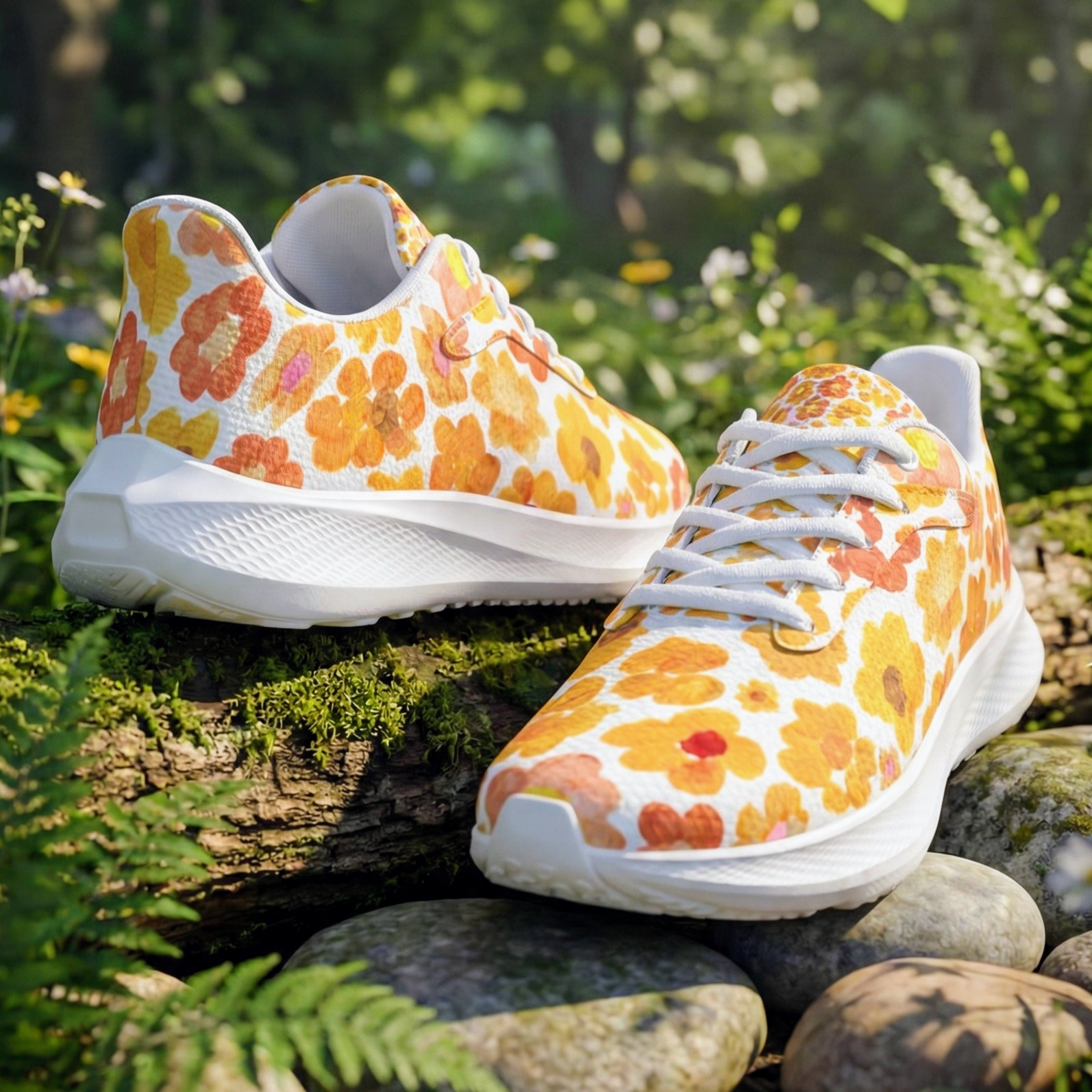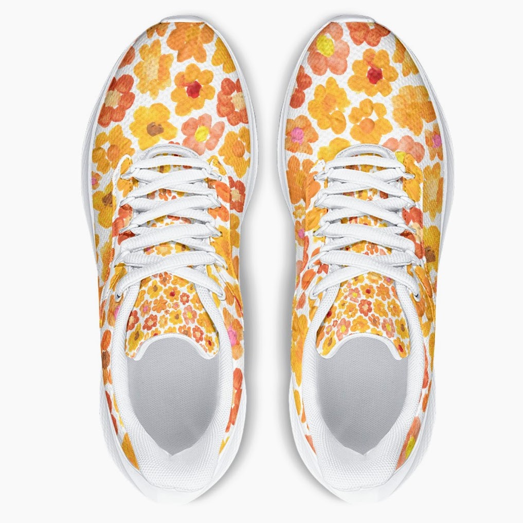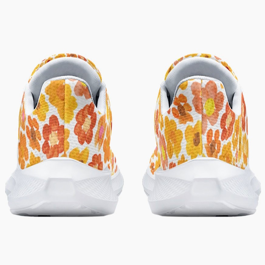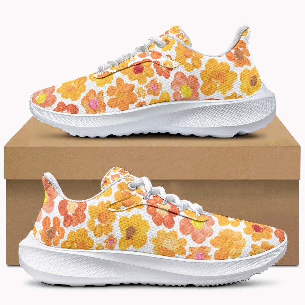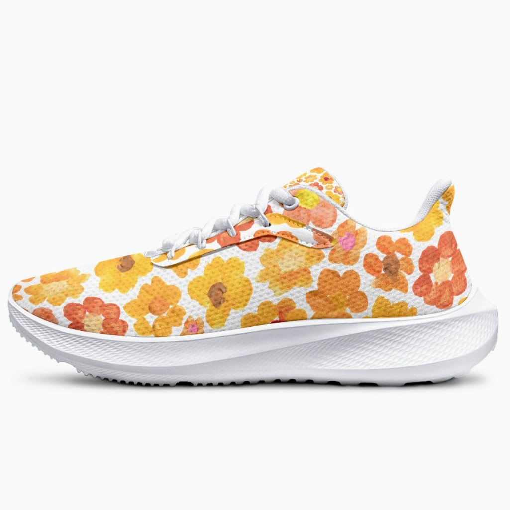 Introducing our orange floral running shoes, featuring the beautiful "Mountain Bloom" design with painted flower blossoms. Whether you are a runner, a walker, or an art lover, these sneakers are designed to help you feel grounded, free, and more connected to the environment.