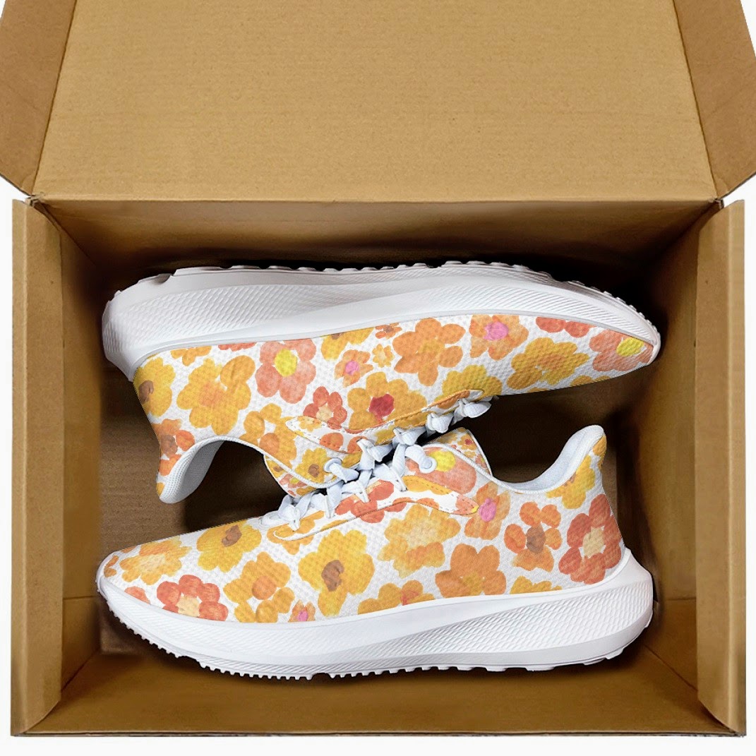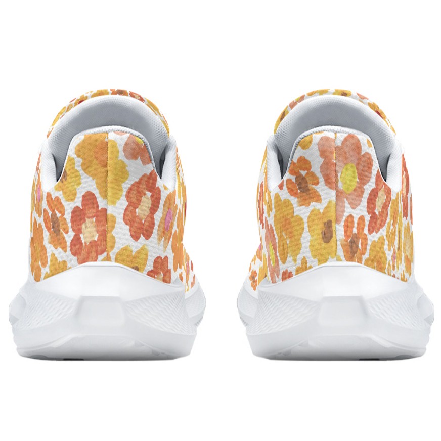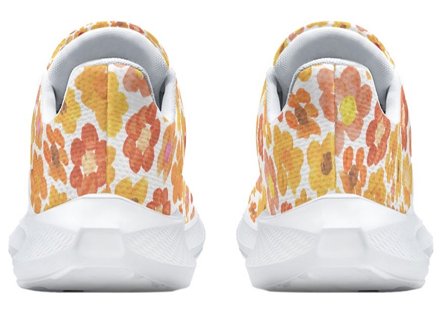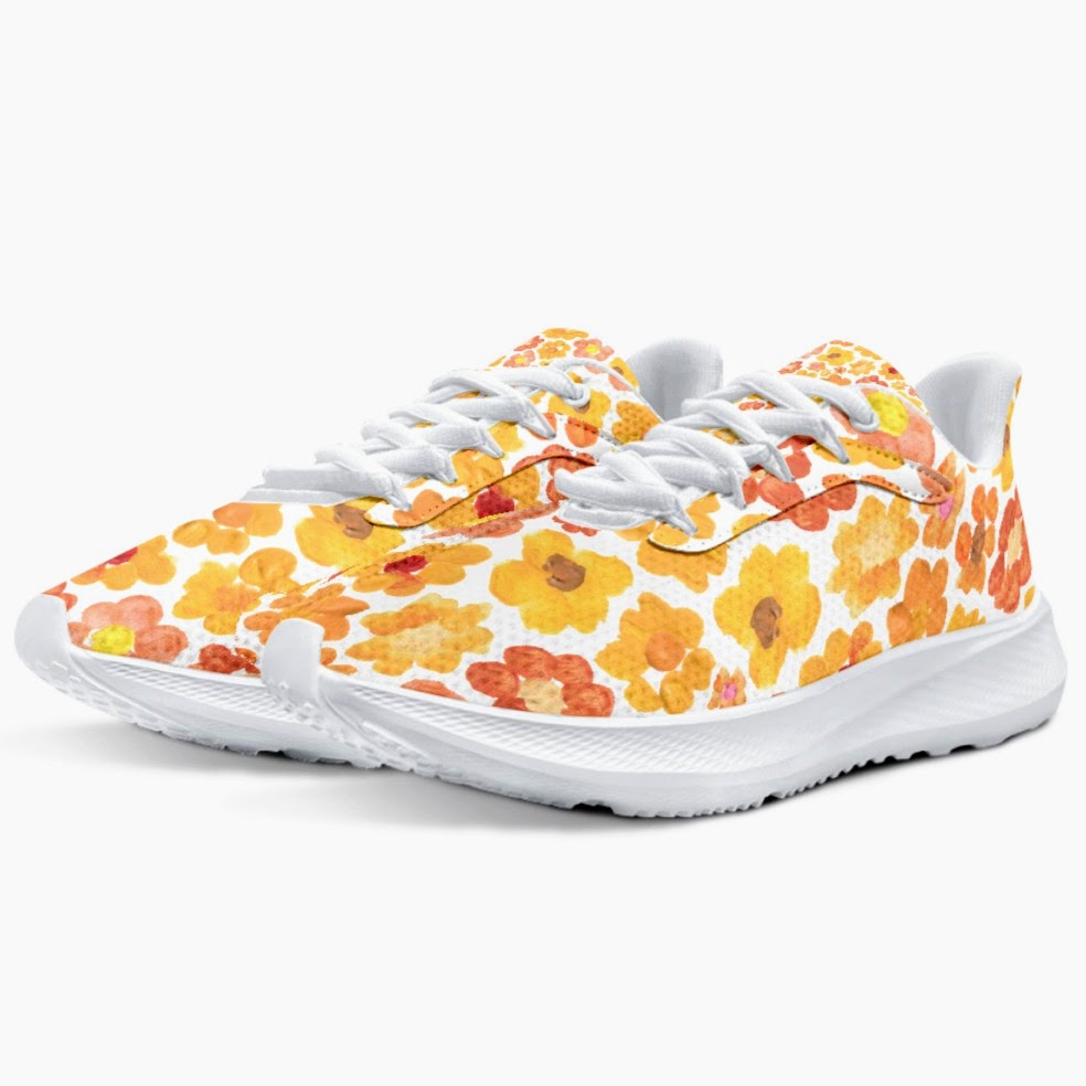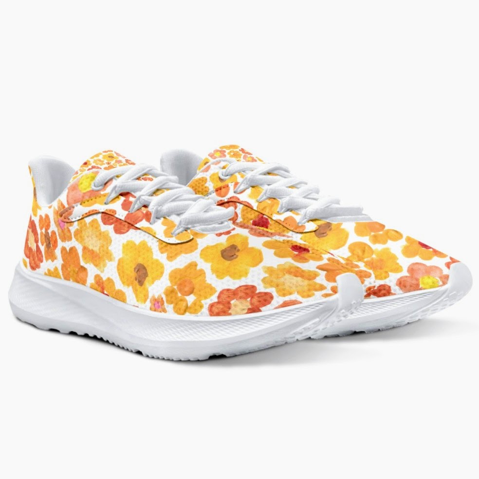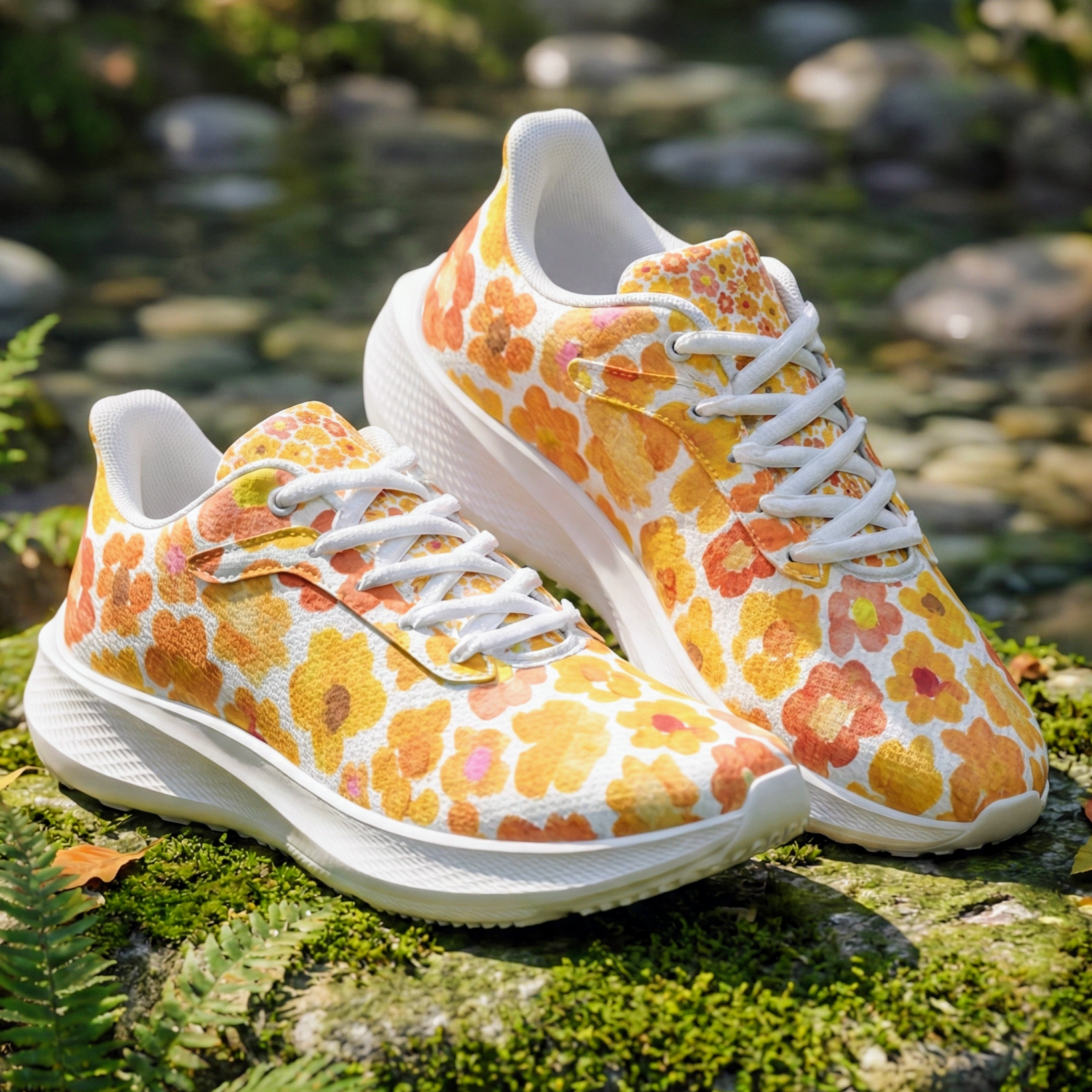 Introducing our orange floral running shoes, featuring the beautiful "Mountain Bloom" design with painted flower blossoms. Whether you are a runner, a walker, or an art lover, these sneakers are designed to help you feel grounded, free, and more connected to the environment.