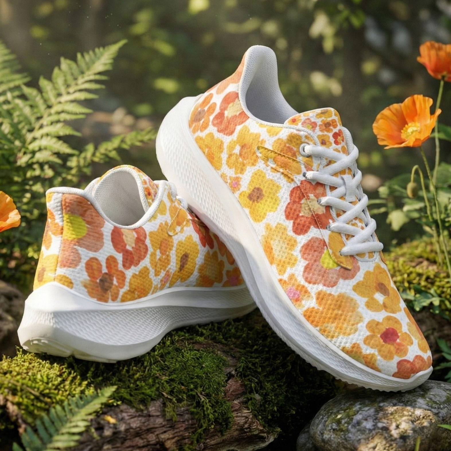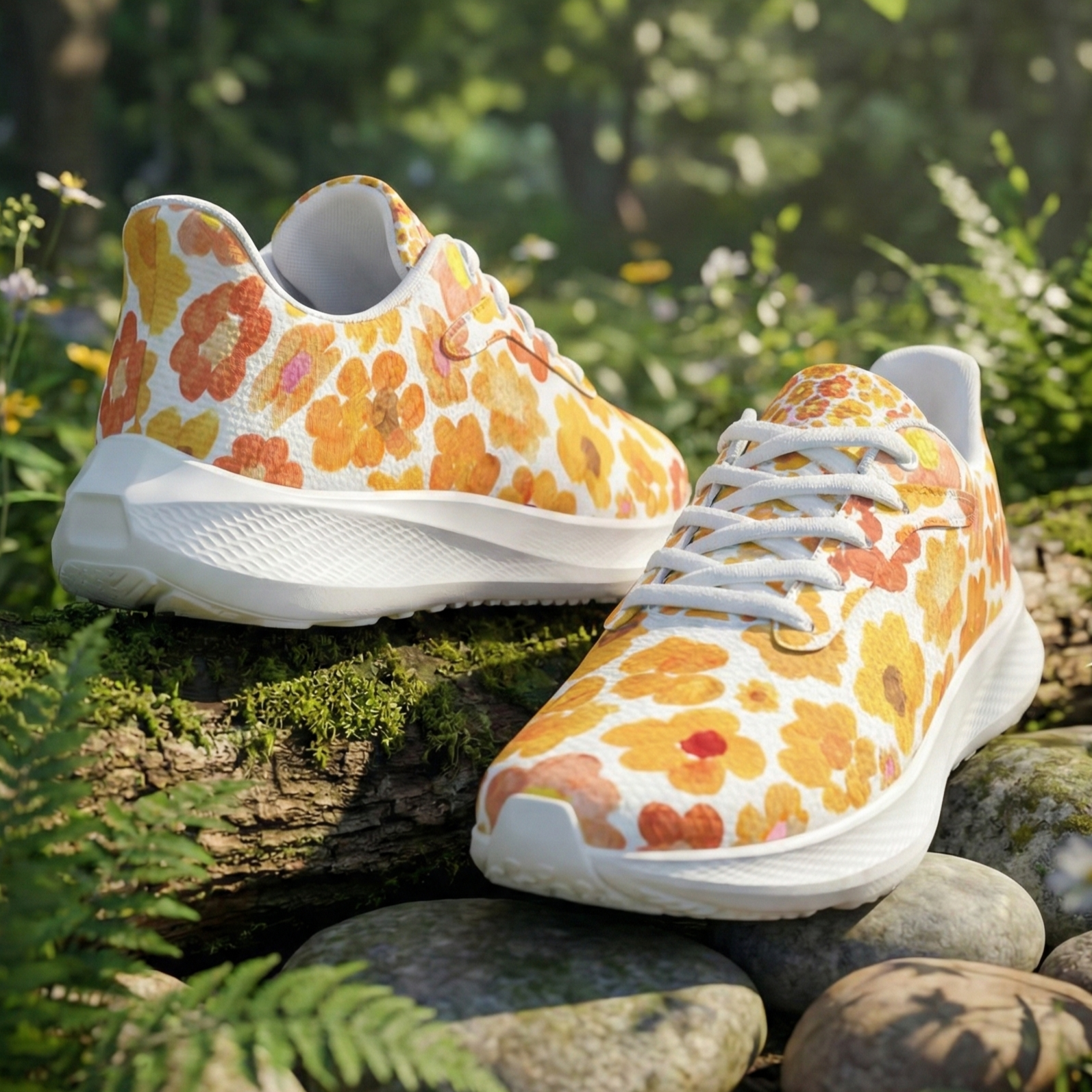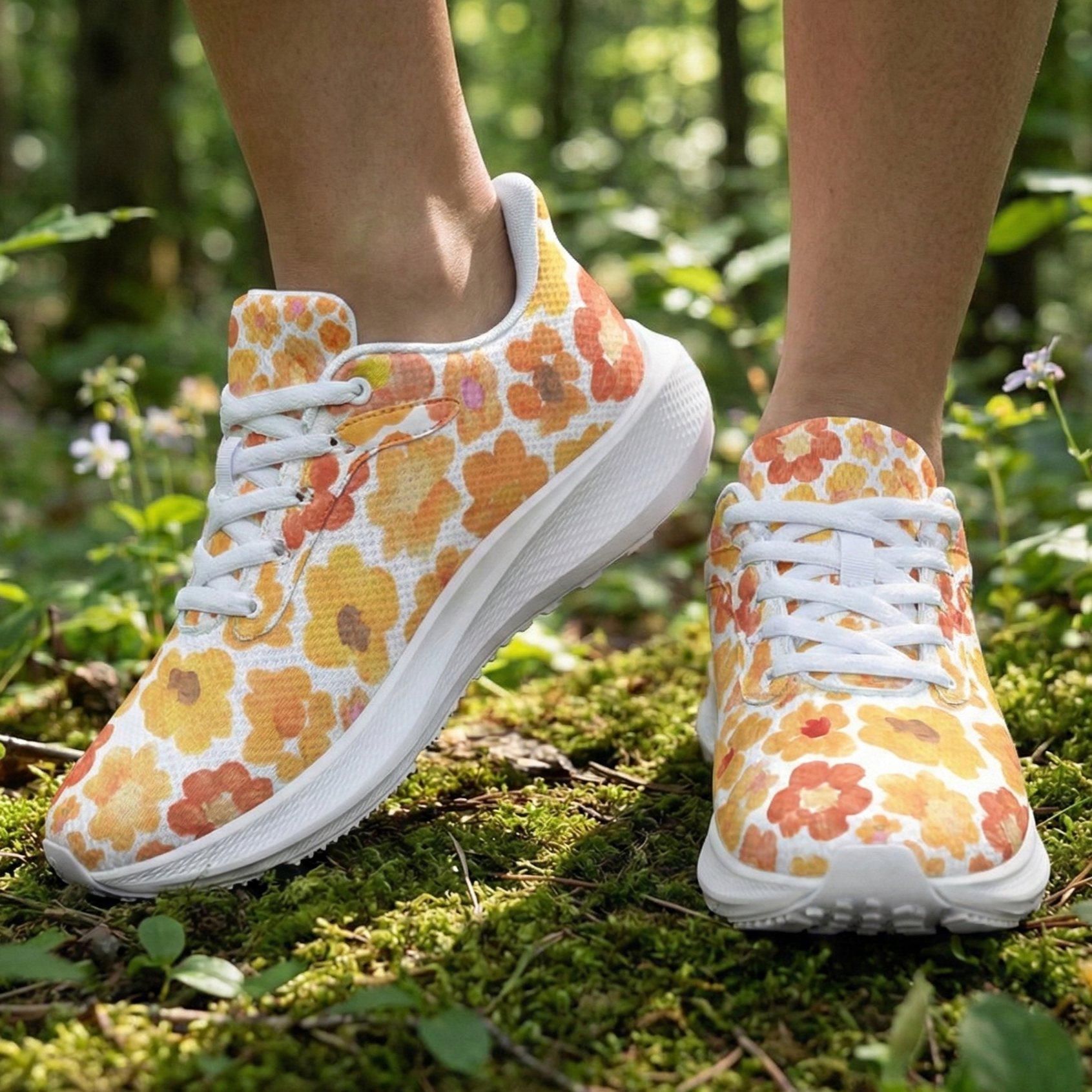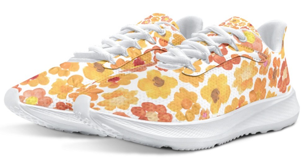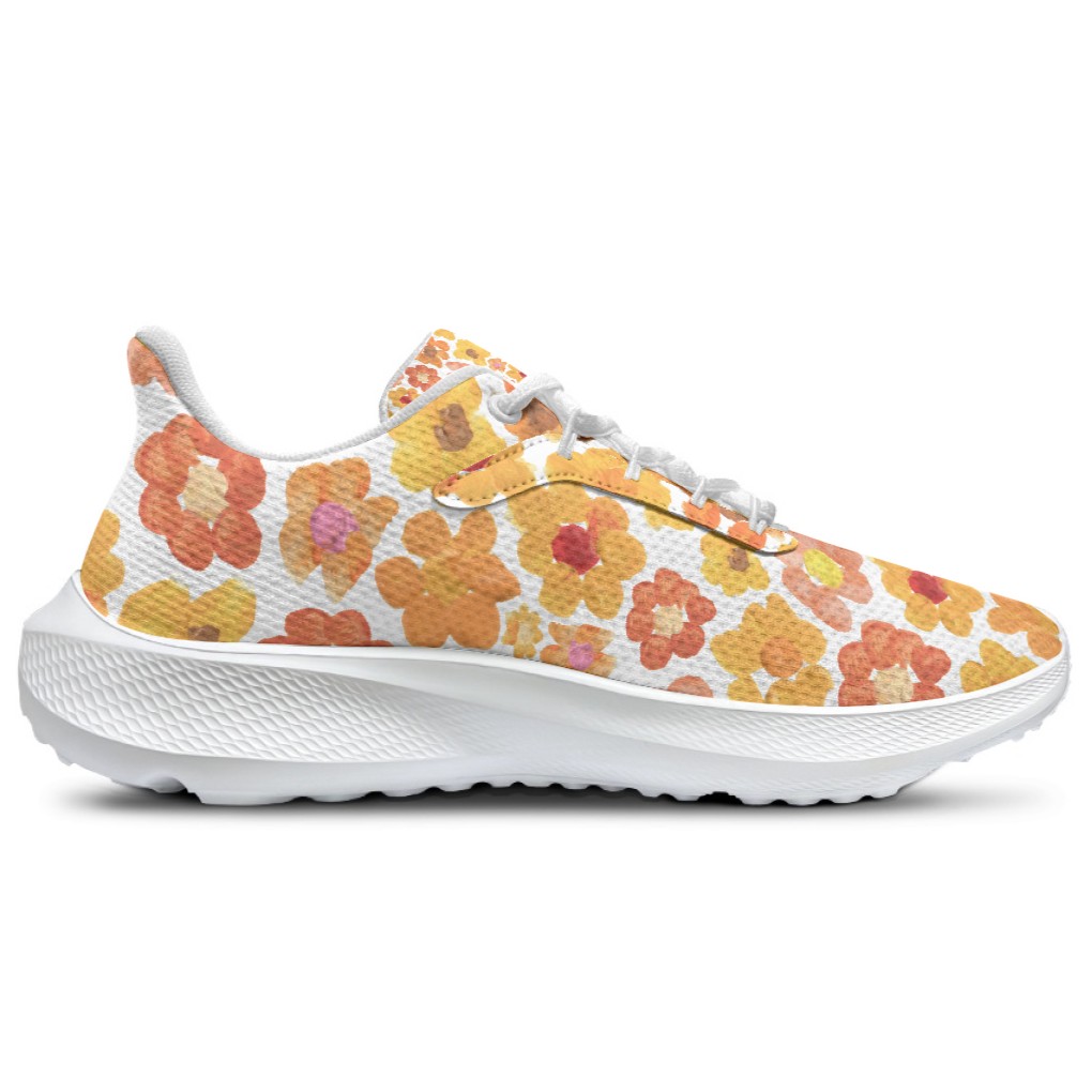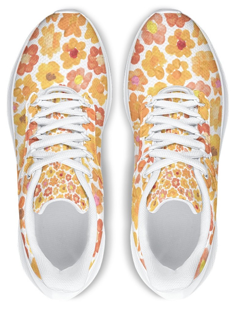 Introducing our orange floral running shoes, featuring the beautiful "Mountain Bloom" design with painted flower blossoms. Whether you are a runner, a walker, or an art lover, these sneakers are designed to help you feel grounded, free, and more connected to the environment.