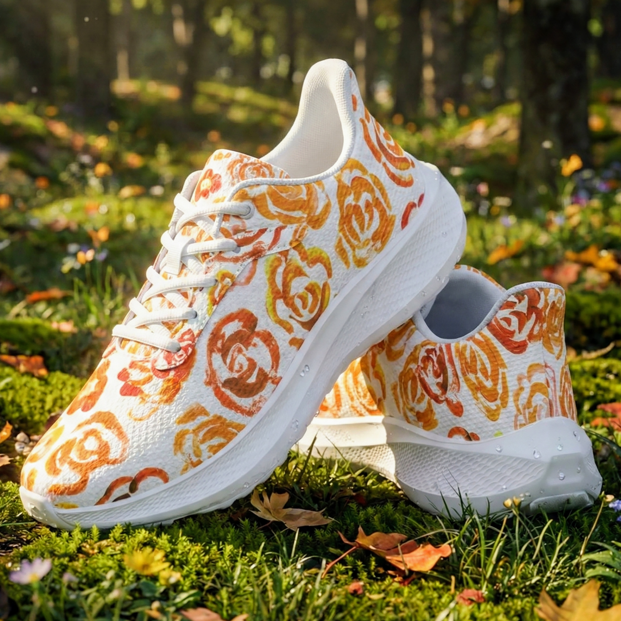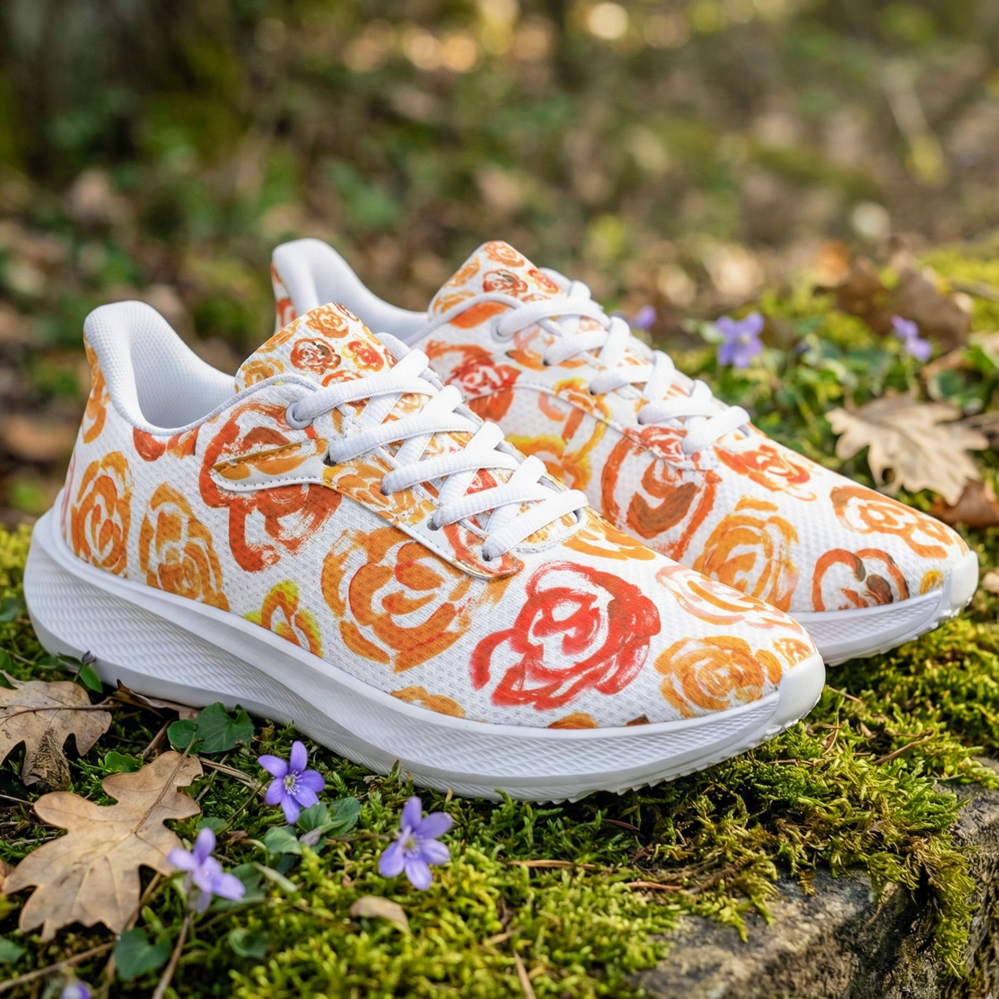These floral sneakers feature a genuine design created by the artist Mia Mai at the early age of 4. The delicate strokes and vibrant orange blossoms capture the pure, unfiltered creativity of a child, turning your morning run or daily walk into a gallery exhibition on your feet.