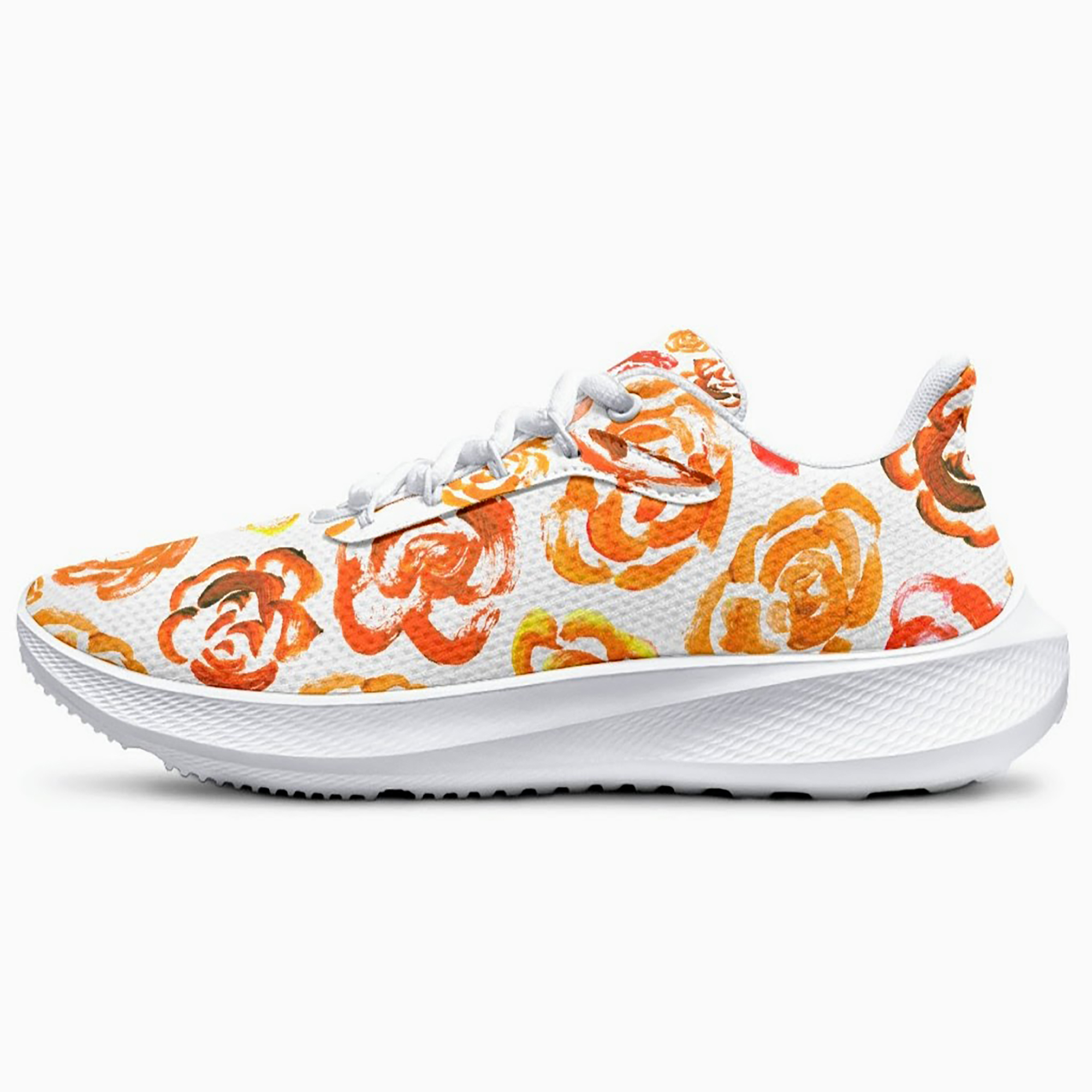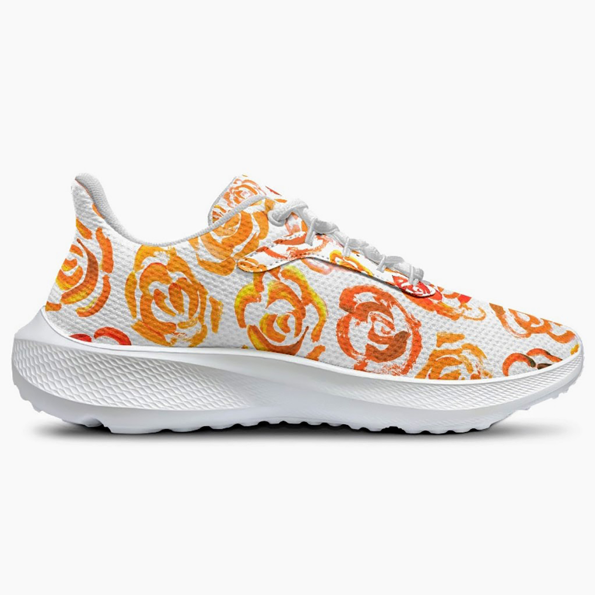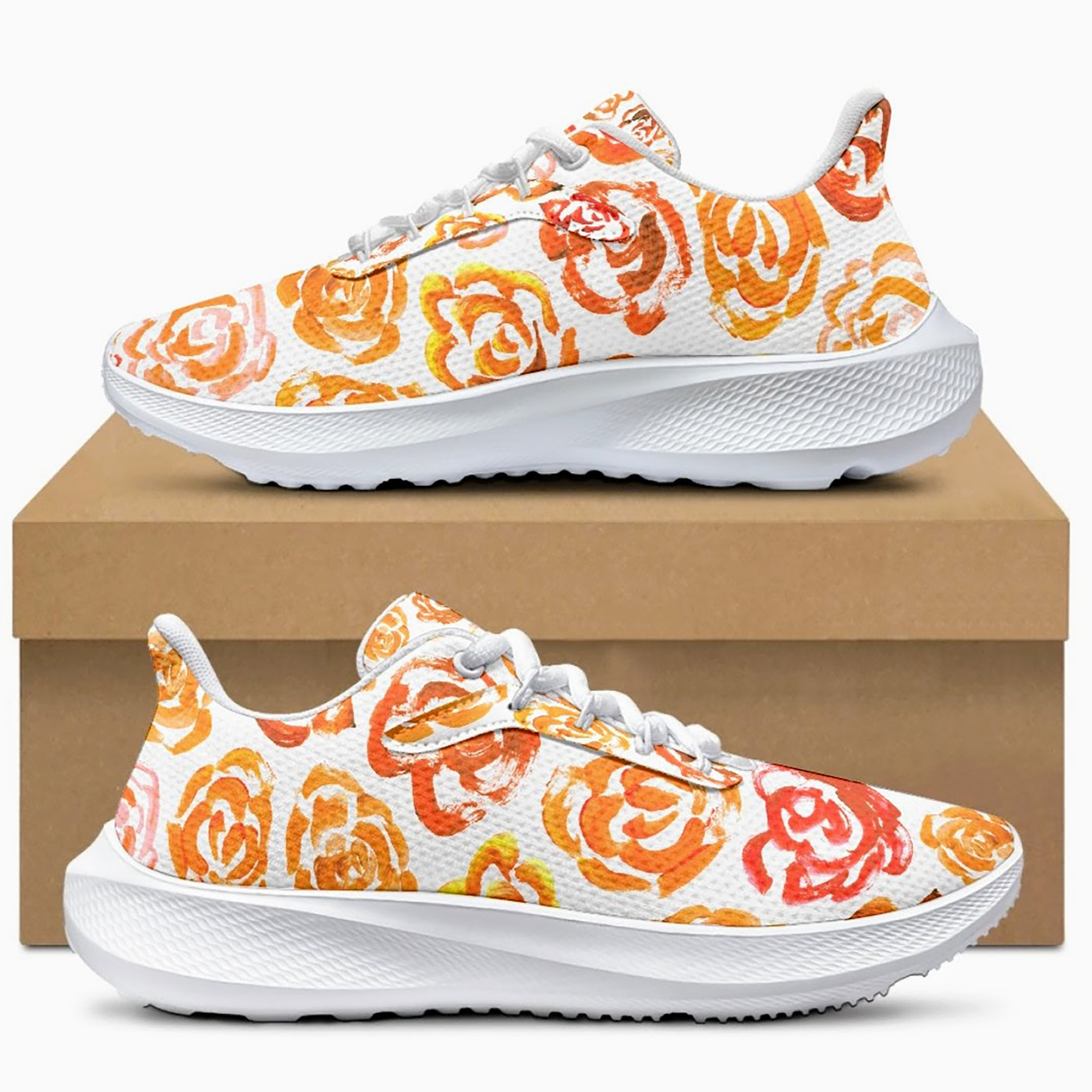 Unisex running shoes with orange flower blossoms. Women's & men's lightweight sports shoes.