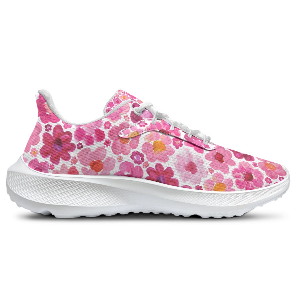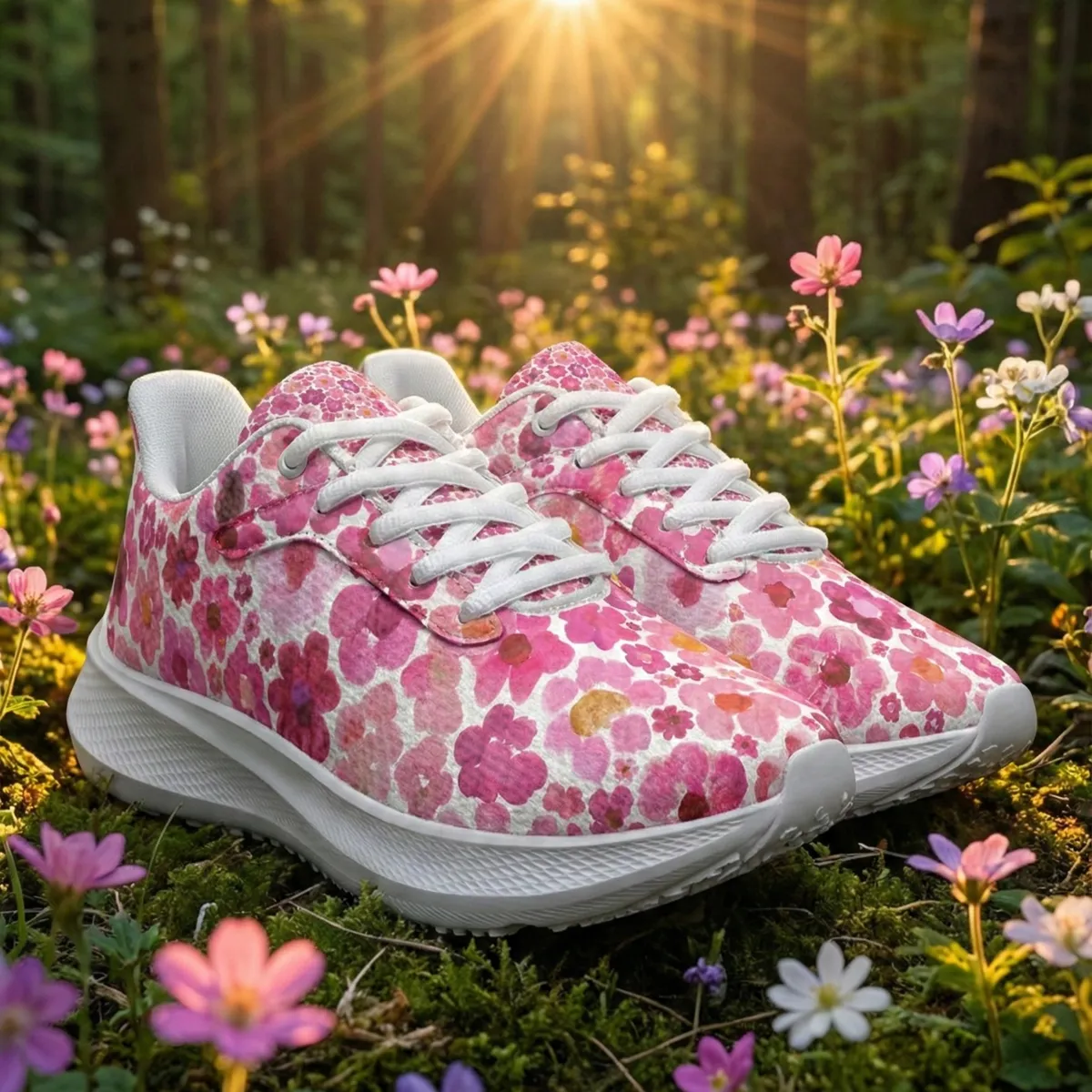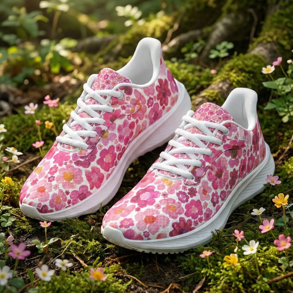 Introducing our pink floral running shoes, featuring the beautiful "Mountain Bloom" design with painted flower blossoms. Whether you are a runner, a walker, or an art lover, these sneakers are designed to help you feel grounded, free, and more connected to the environment.