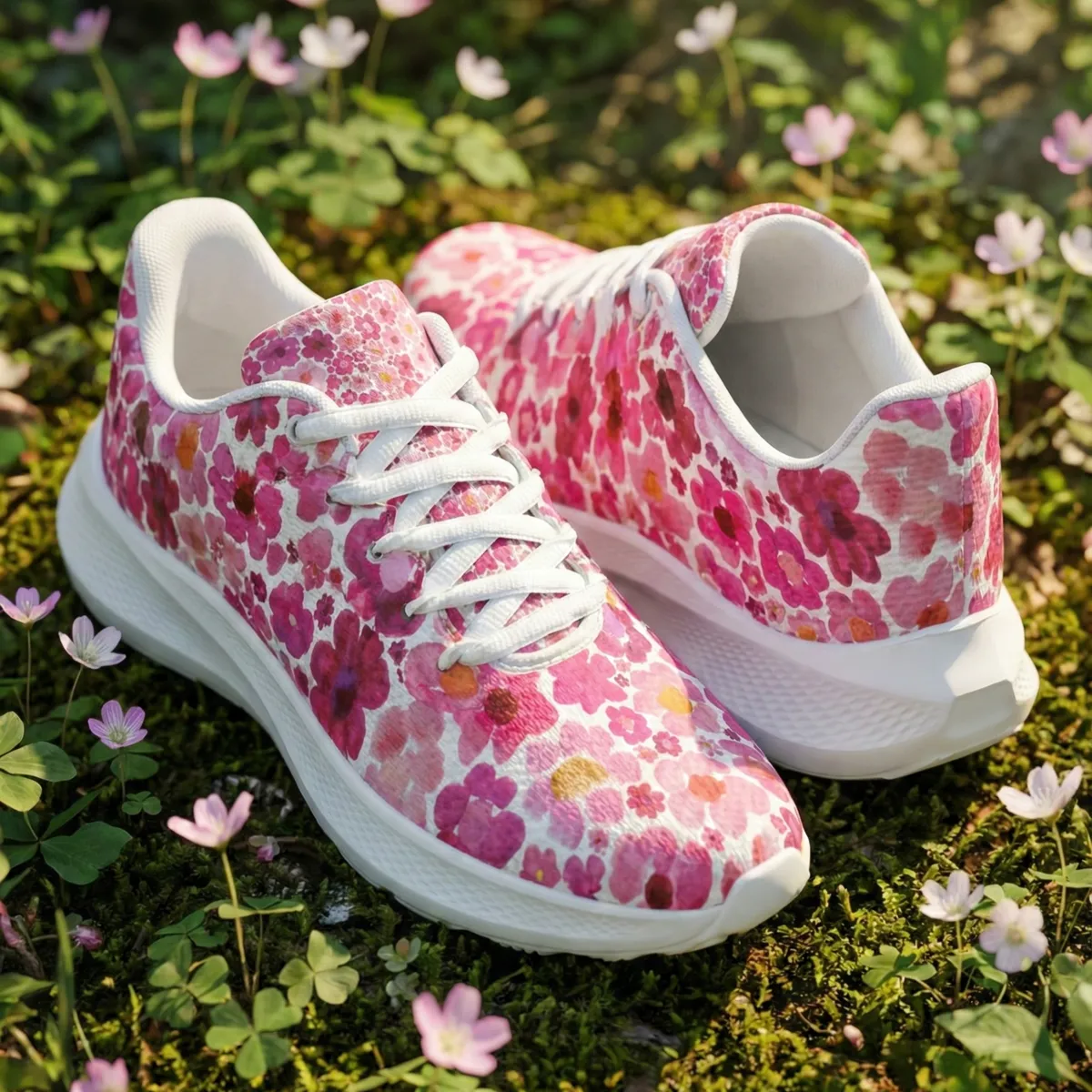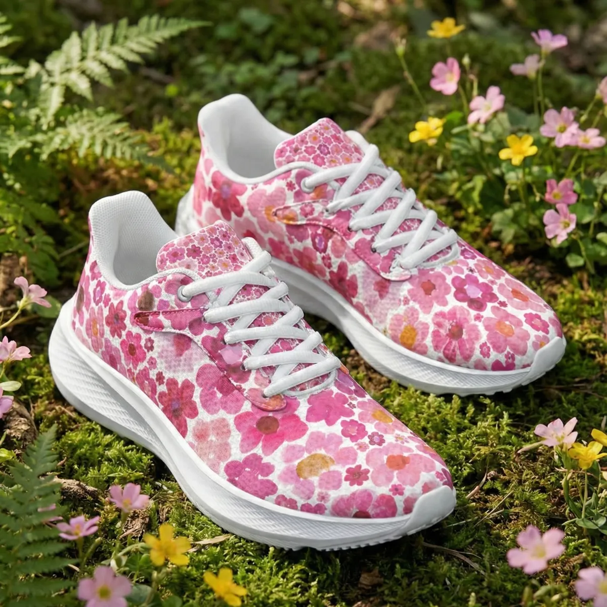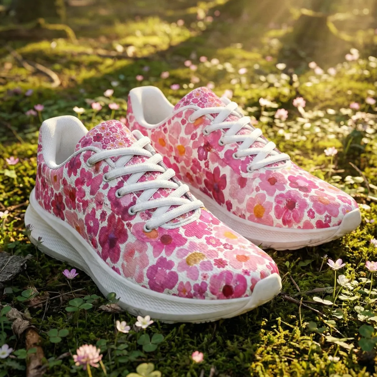 Introducing our pink floral running shoes, featuring the beautiful "Mountain Bloom" design with painted flower blossoms. Whether you are a runner, a walker, or an art lover, these sneakers are designed to help you feel grounded, free, and more connected to the environment.