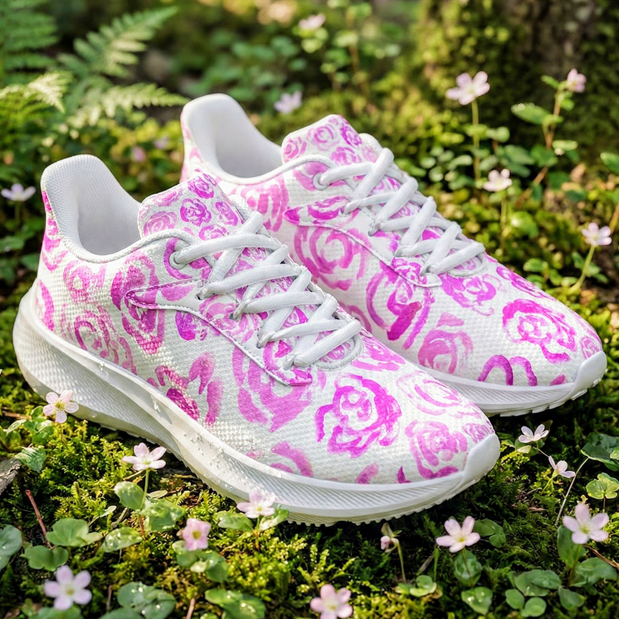 These floral sneakers feature a genuine design created by the artist Mia Mai at the early age of 4. The delicate strokes and vibrant light pink blossoms capture the pure, unfiltered creativity of a child, turning your morning run or daily walk into a gallery exhibition on your feet.