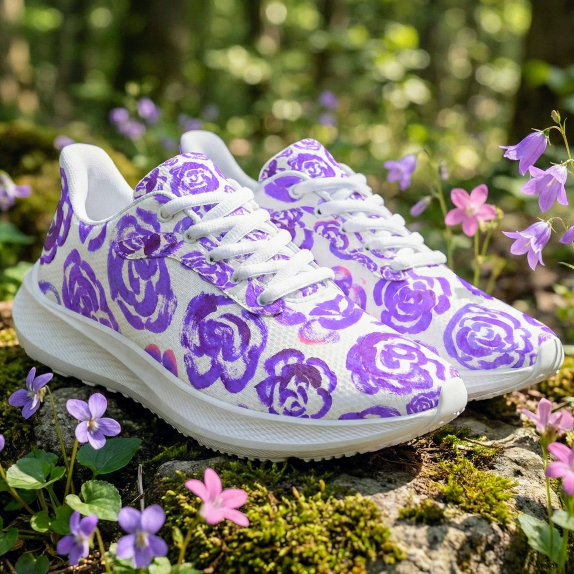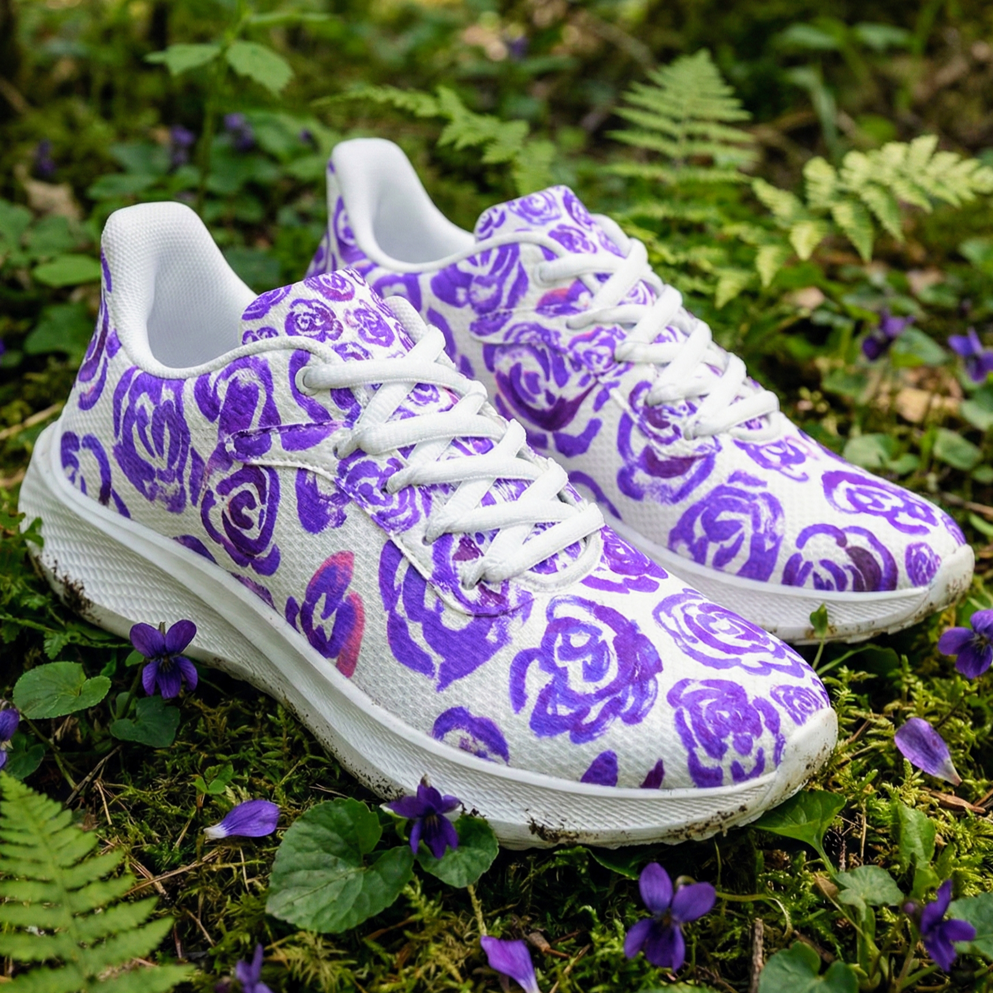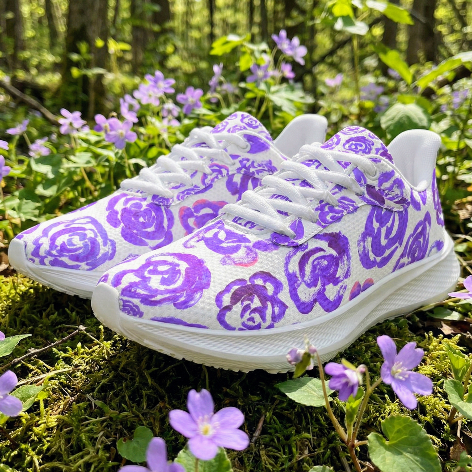 These floral sneakers feature a genuine design created by the artist Mia Mai at the early age of 4. The delicate strokes and vibrant dark purple blossoms capture the pure, unfiltered creativity of a child, turning your morning run or daily walk into a gallery exhibition on your feet.