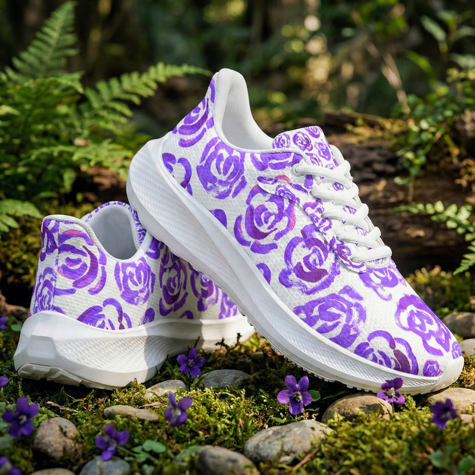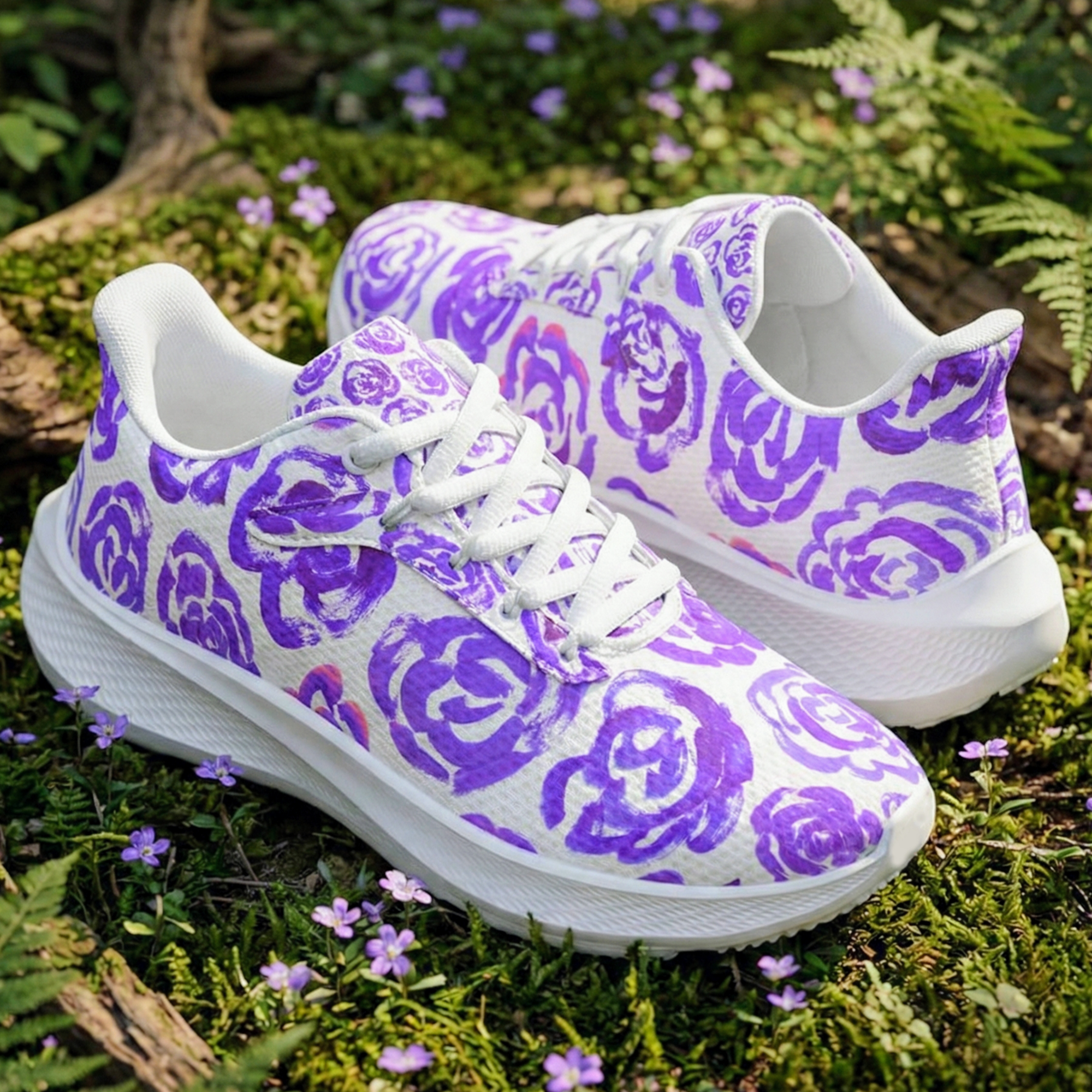 These unique running shoes with dark purple flower blossoms aren't just footwear—they are a tribute to the boundless imagination of childhood.