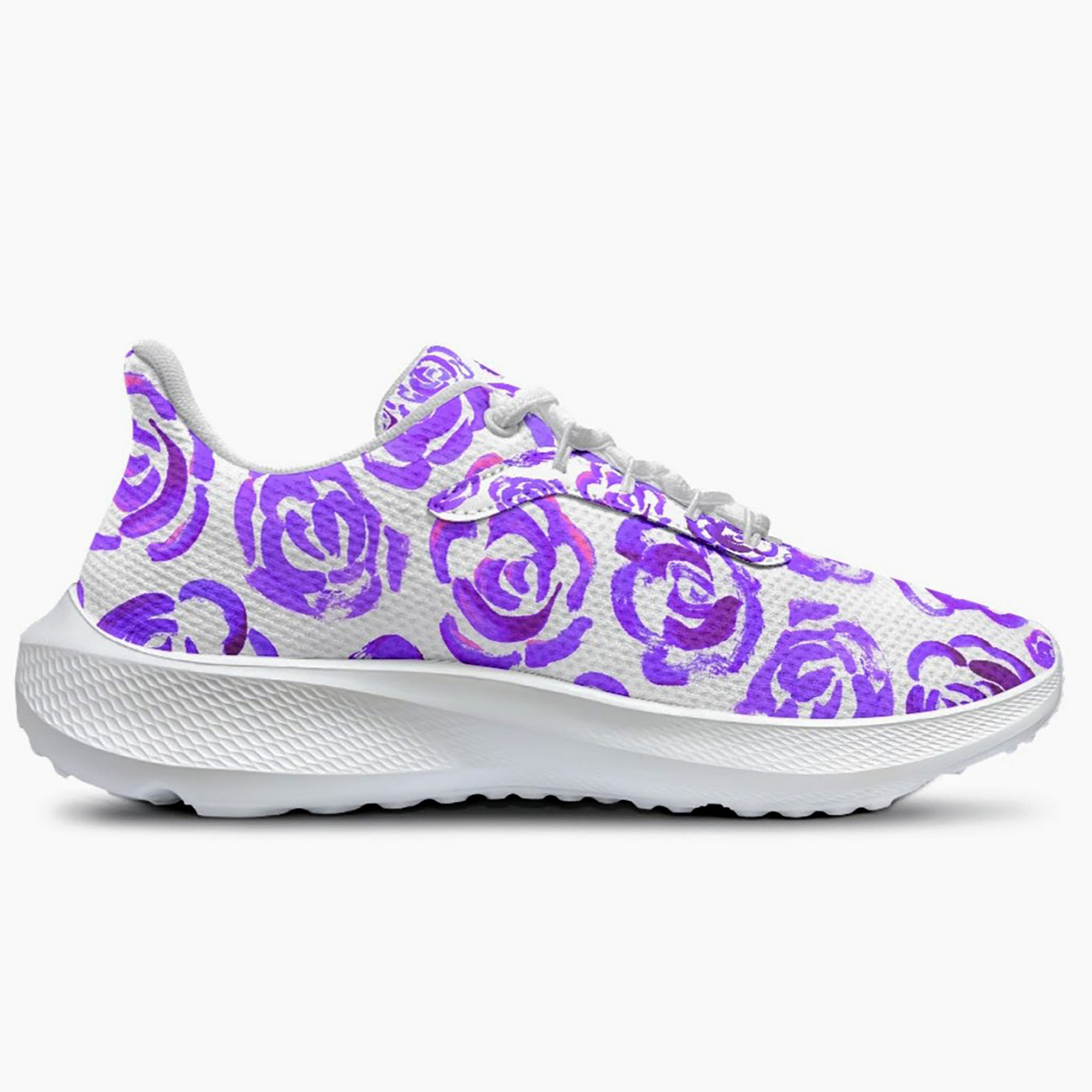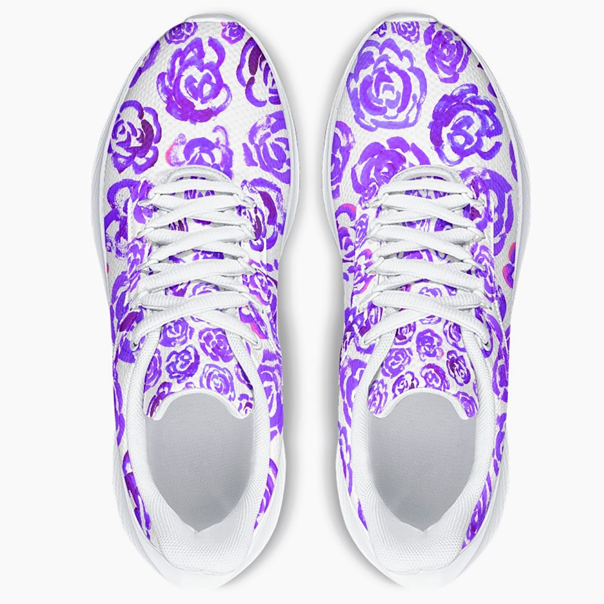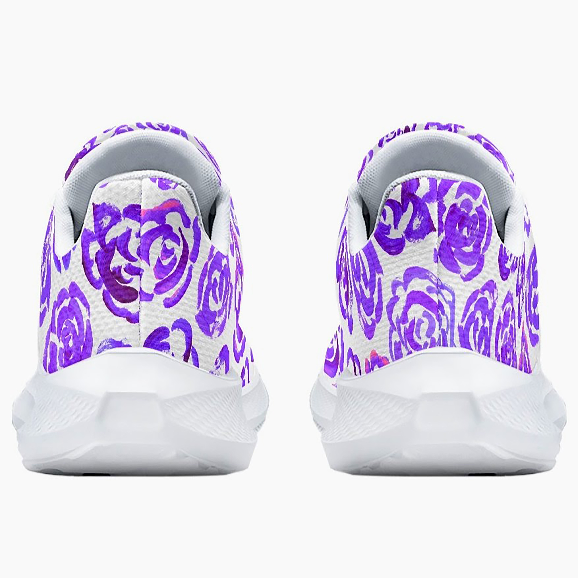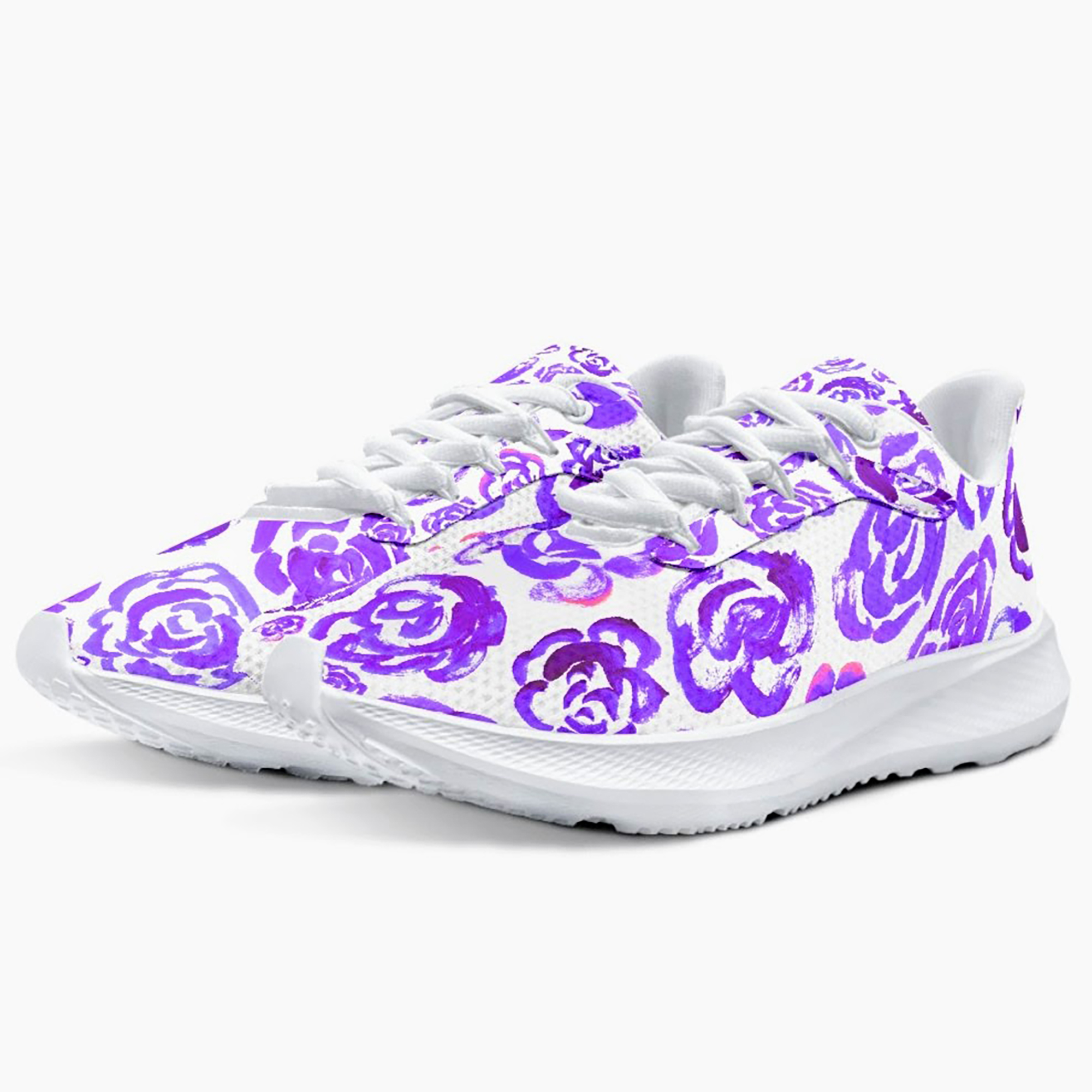 Unisex running shoes with dark purple flower blossoms. Women's & men's lightweight sports shoes.