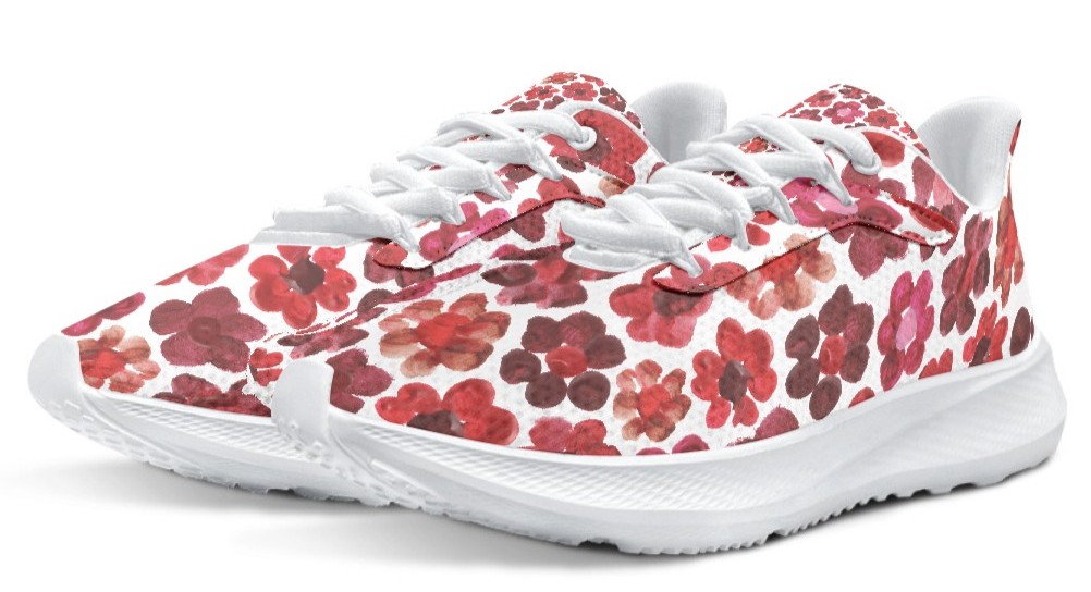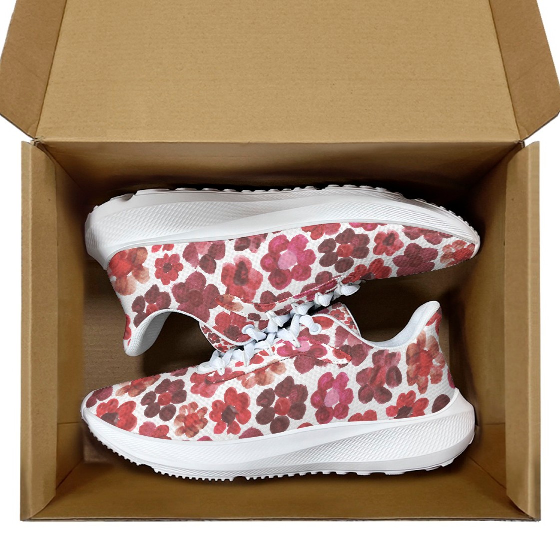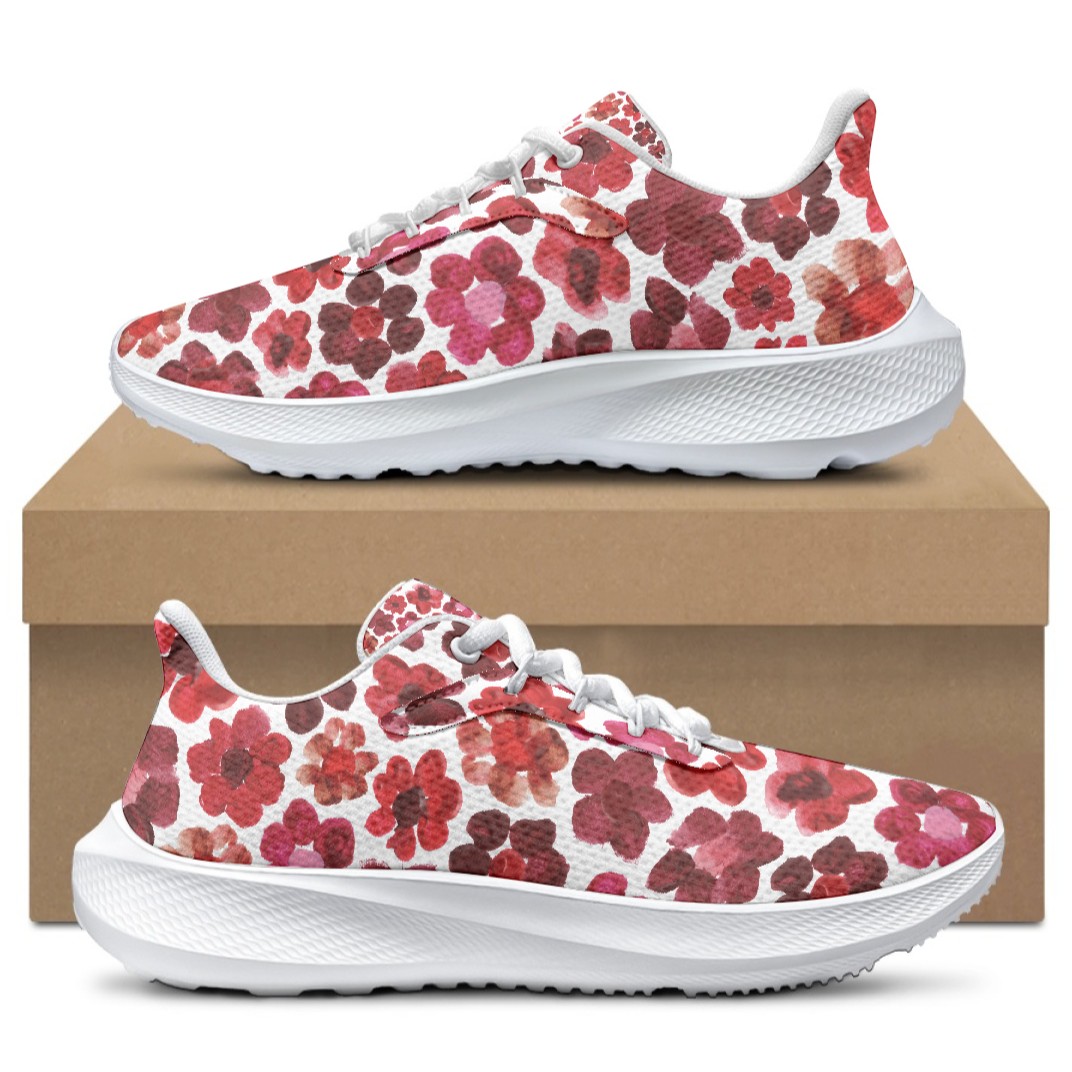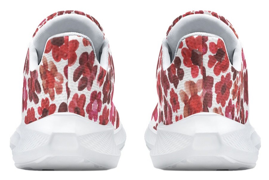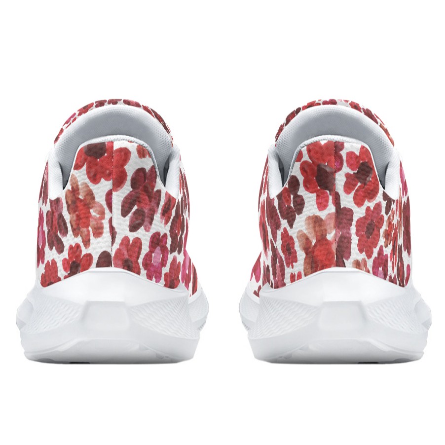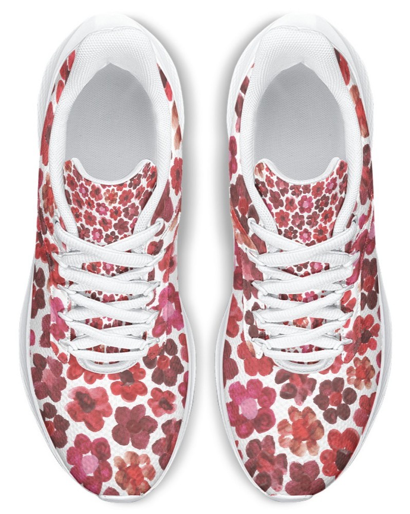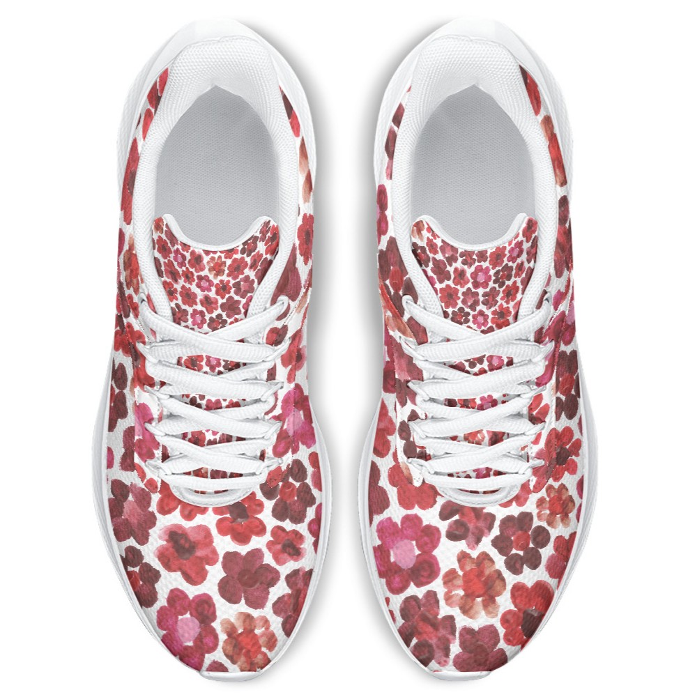 Red Floral Running Shoes (Unisex) with Painted Red Flower Blossoms | Botanical Art Sneakers