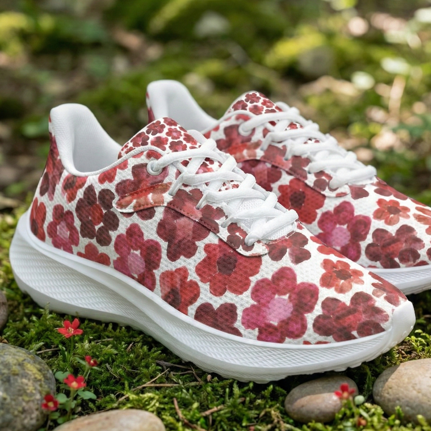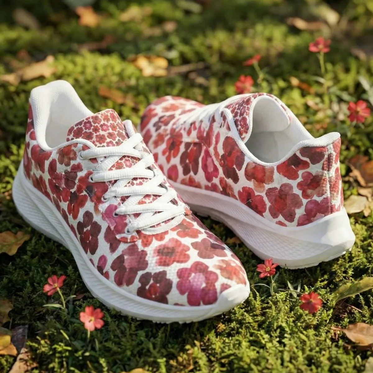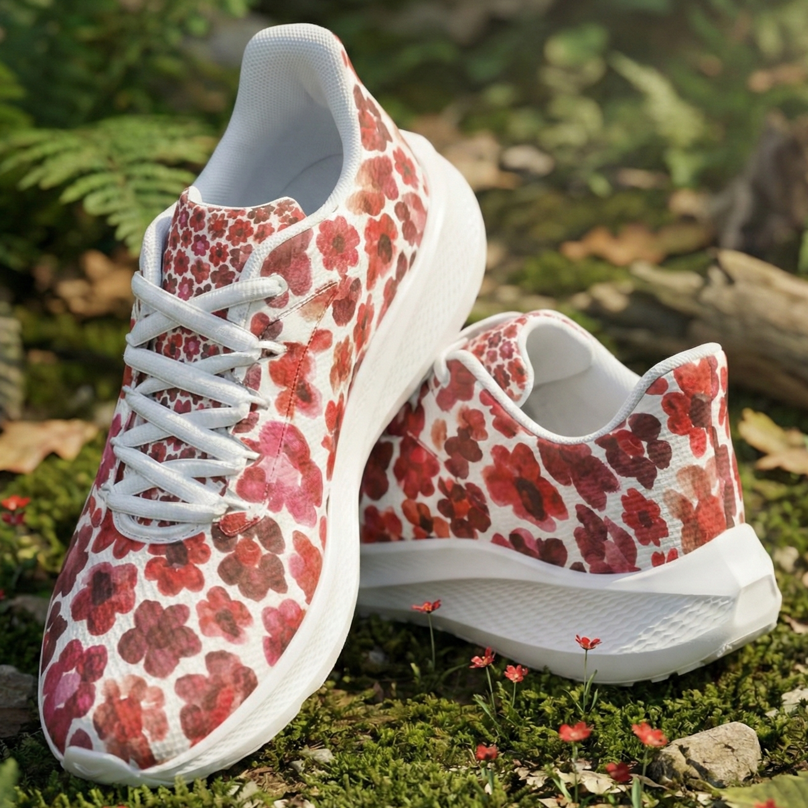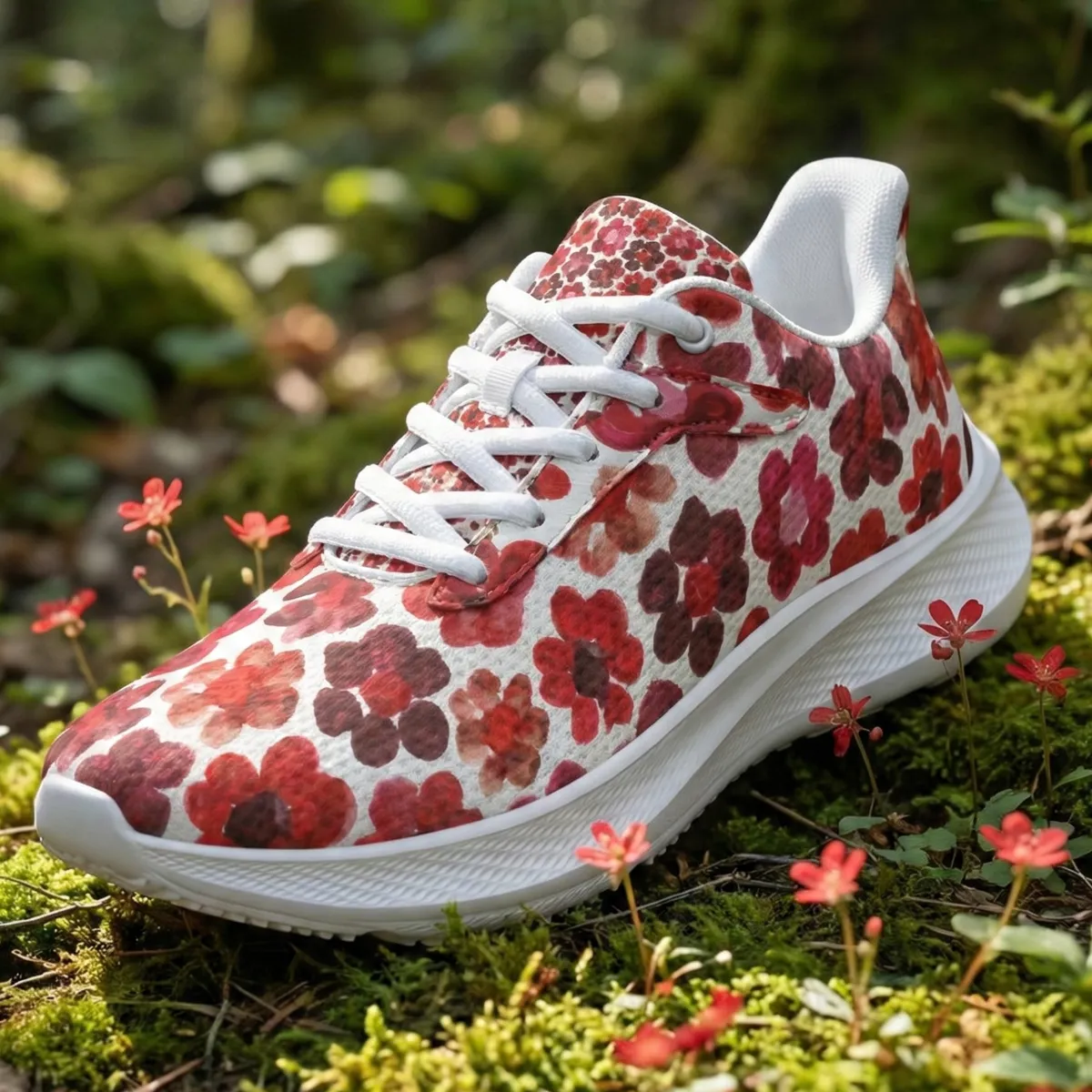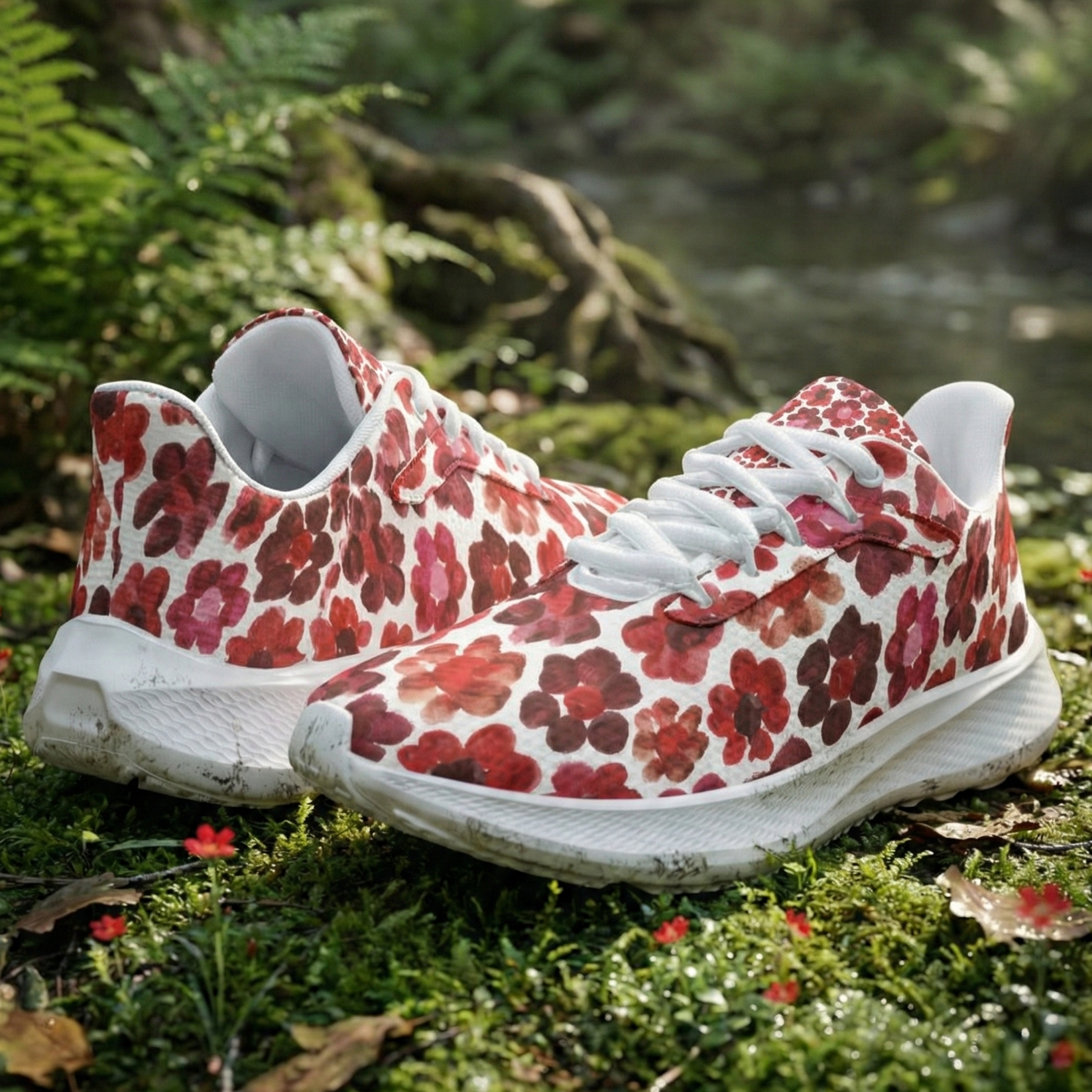 Introducing our red floral running shoes, featuring the beautiful "Mountain Bloom" design with painted red flower blossoms. Whether you are a runner, a walker, or an art lover, these sneakers are designed to help you feel grounded, free, and more connected to the environment.