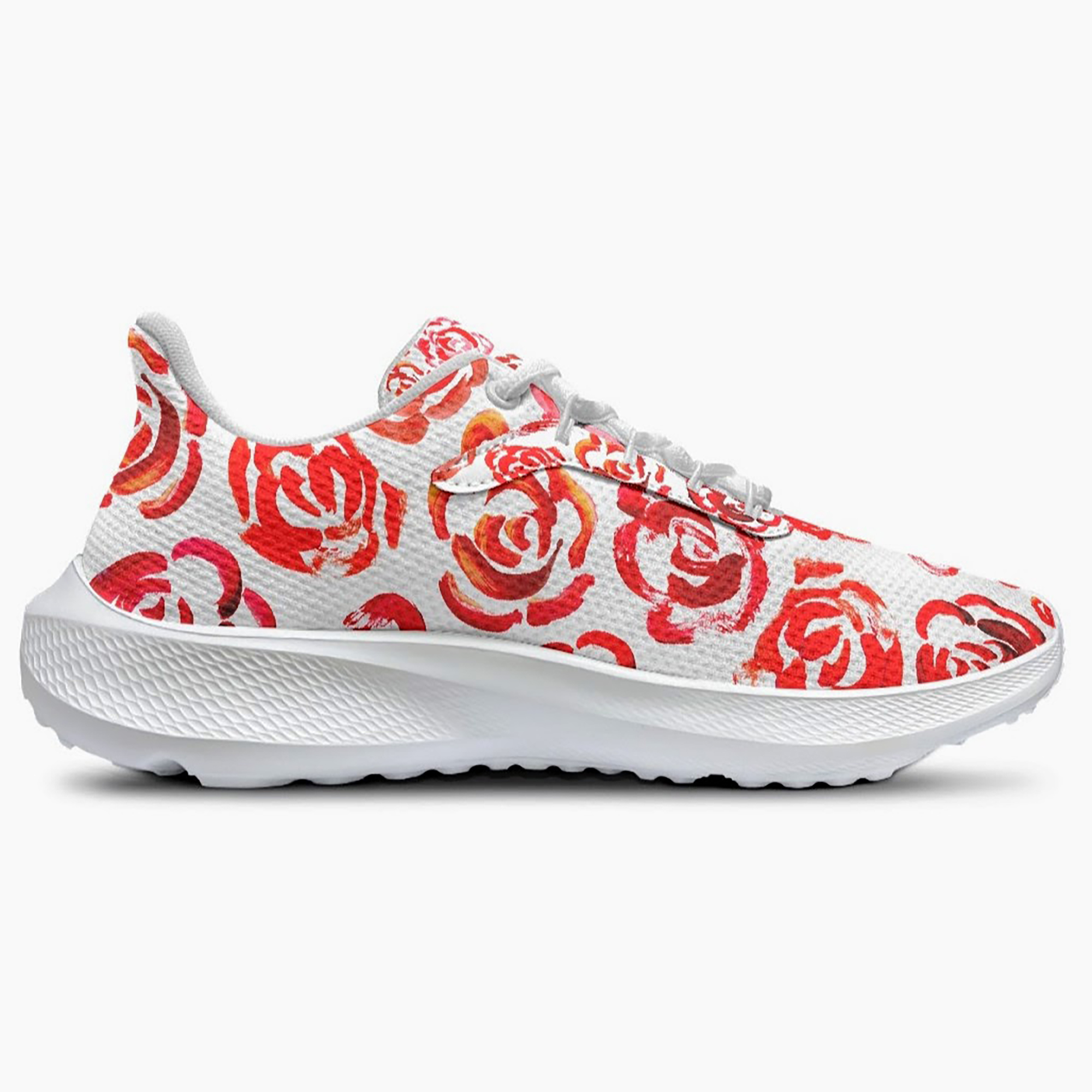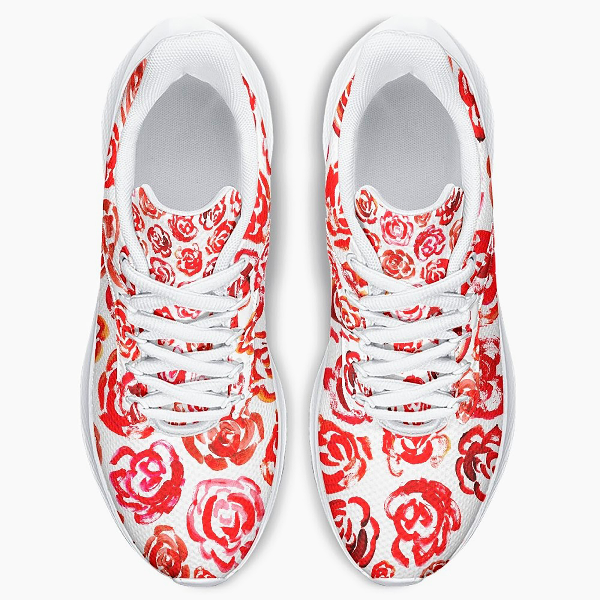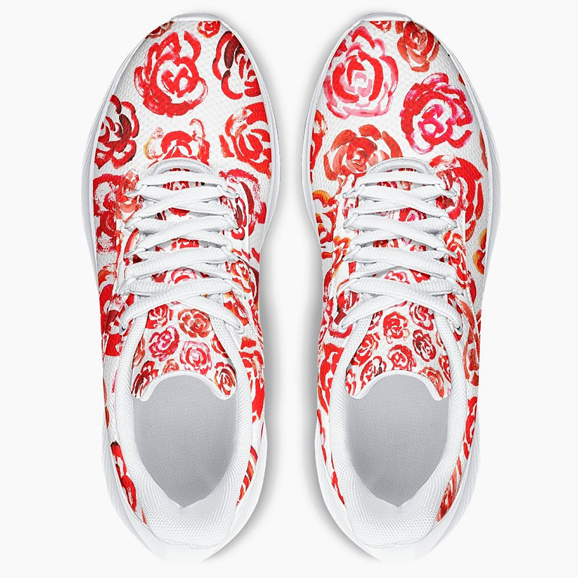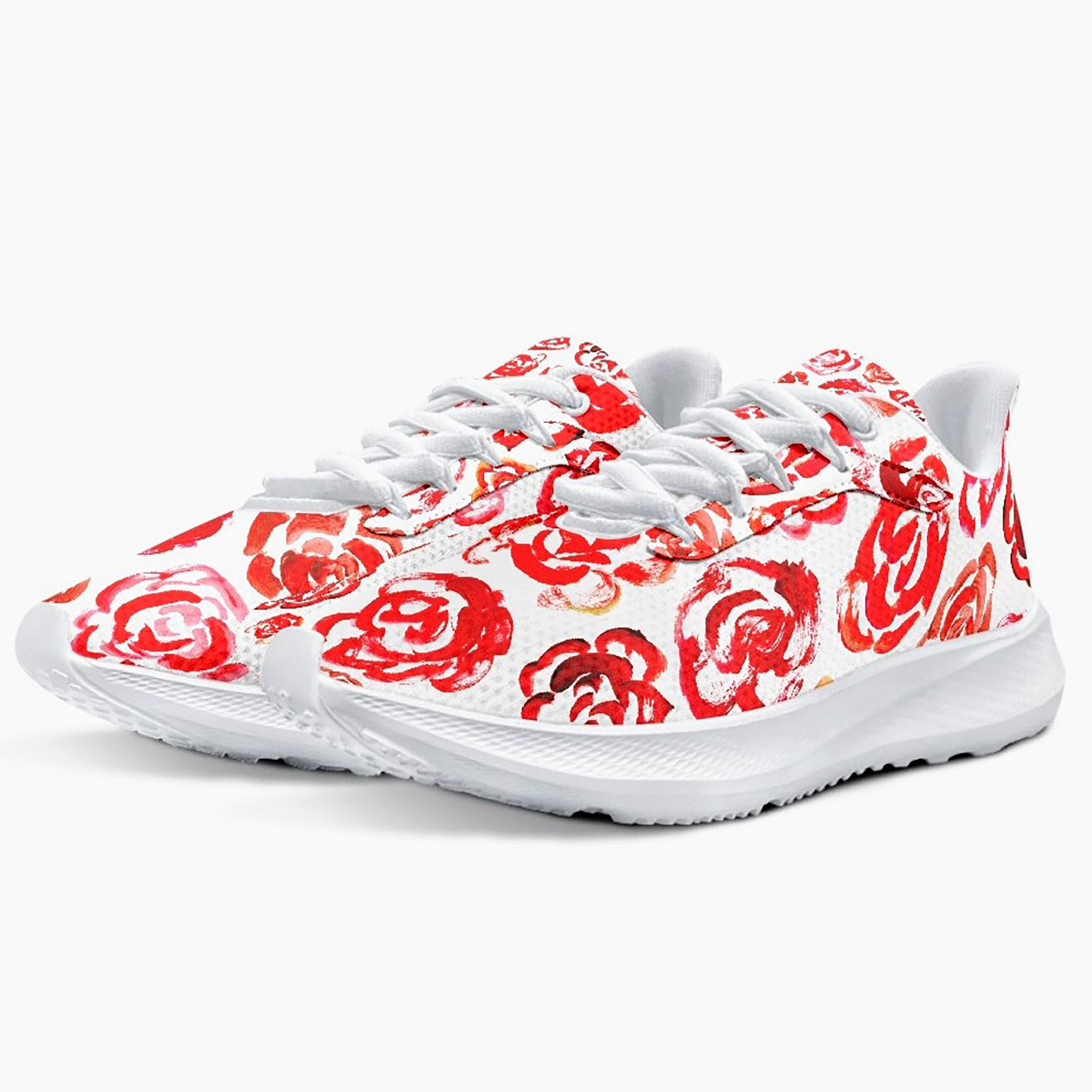 Unisex running shoes with red flower blossoms. Women's & men's lightweight sports shoes.