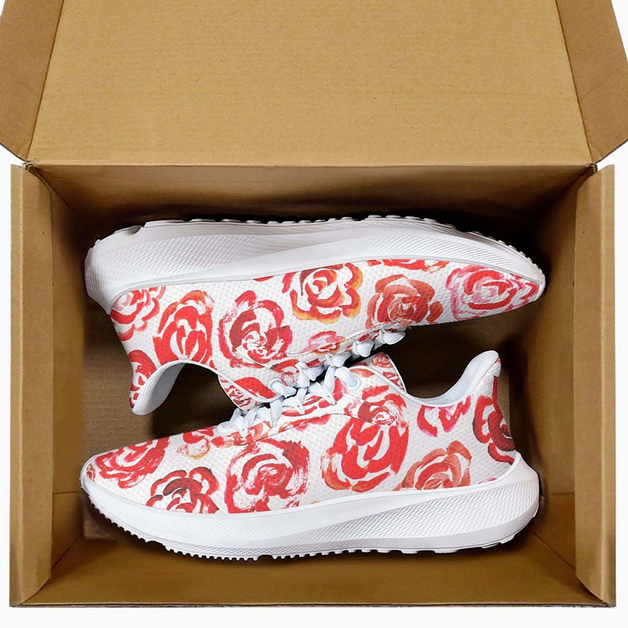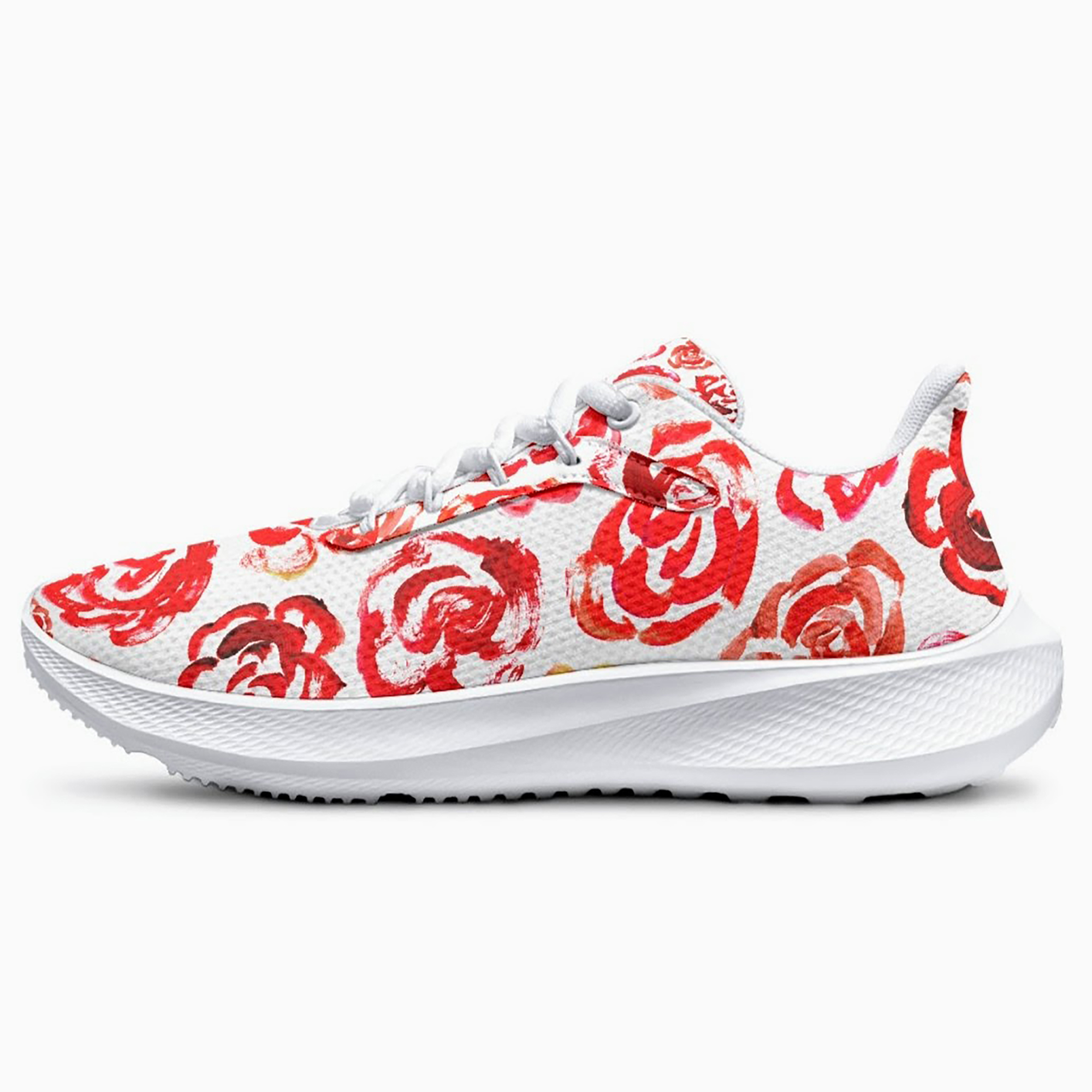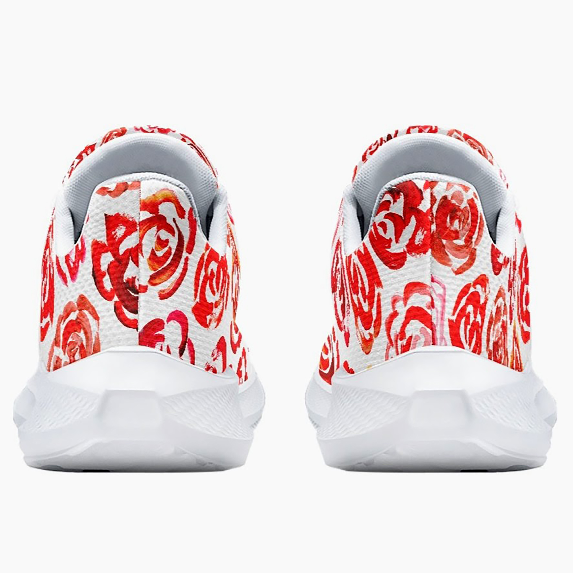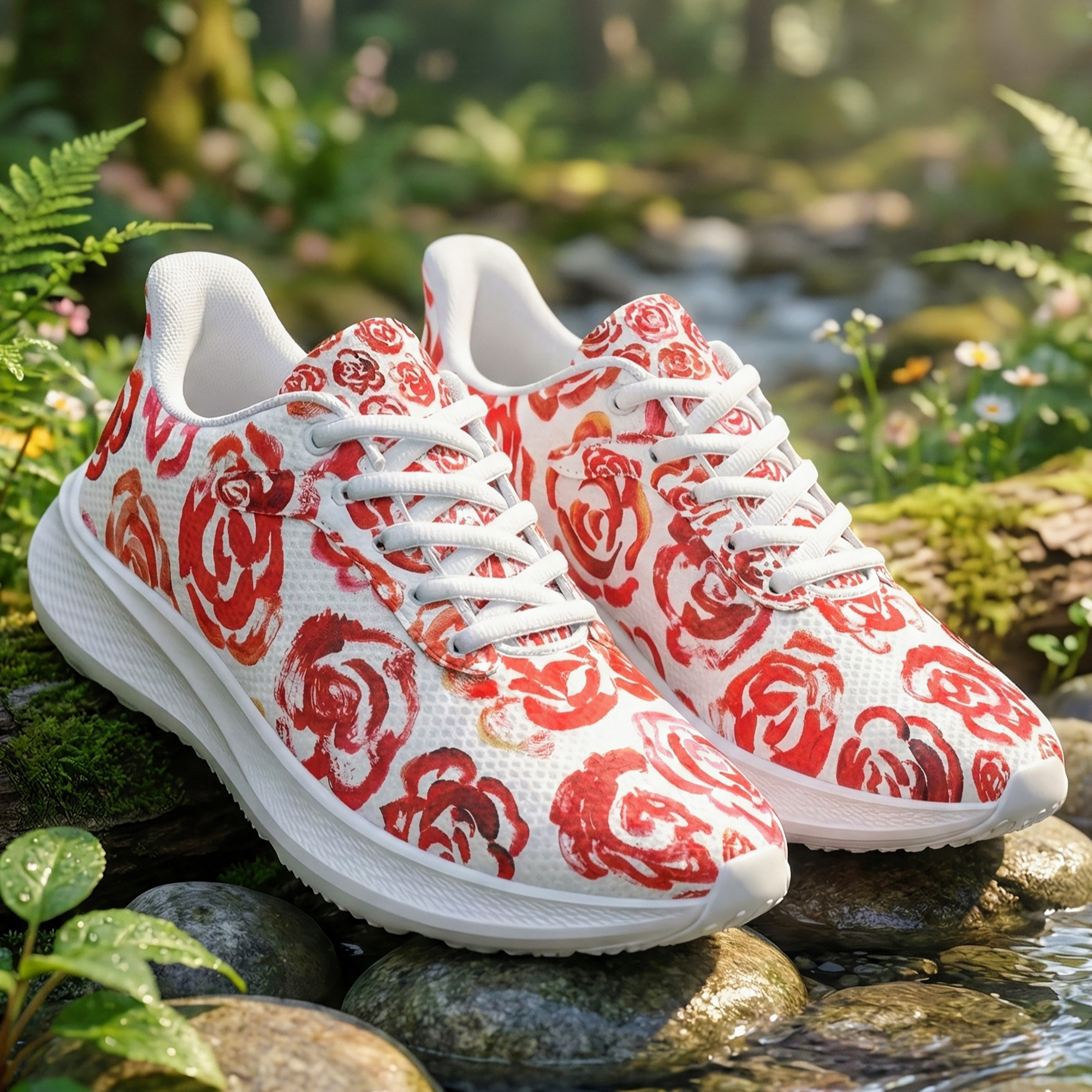 Unisex running shoes with red flower blossoms. Women's & men's lightweight sports shoes.