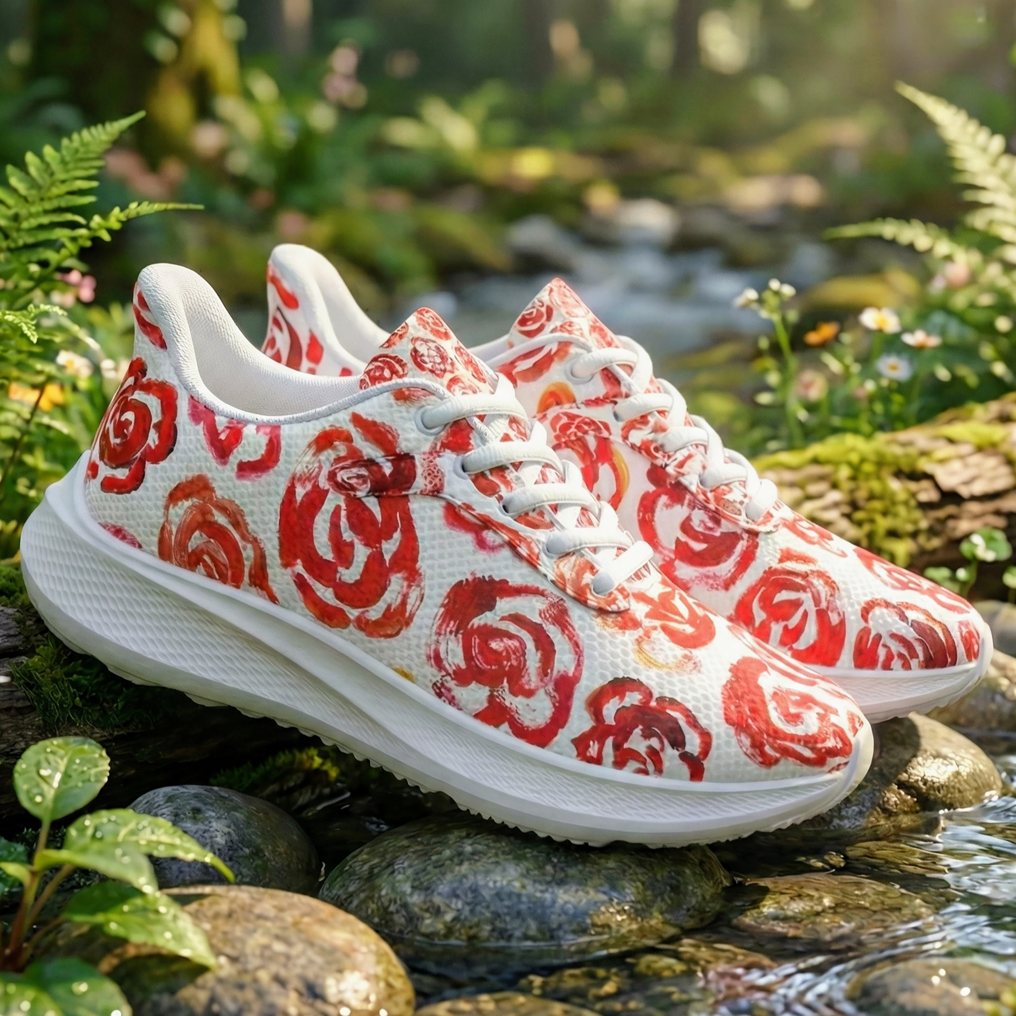 These floral sneakers feature a genuine design created by the artist Mia Mai at the early age of 4. The delicate strokes and vibrant red blossoms capture the pure, unfiltered creativity of a child, turning your morning run or daily walk into a gallery exhibition on your feet.