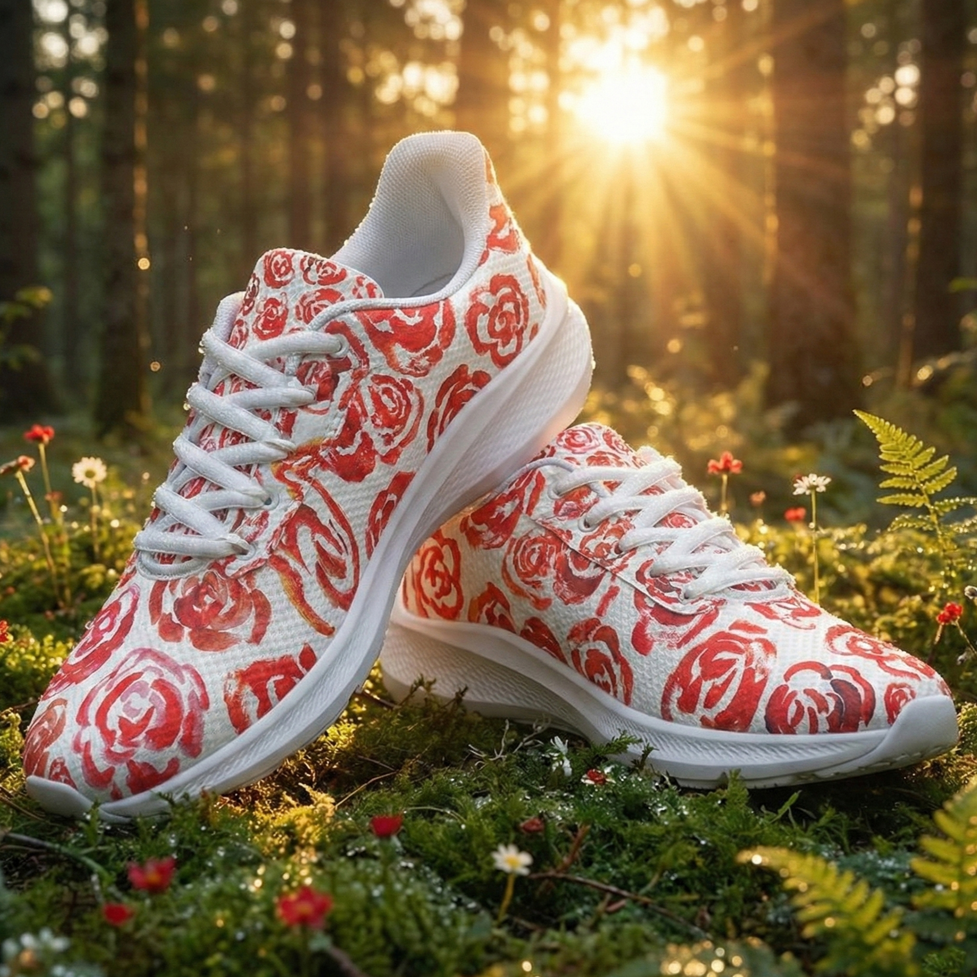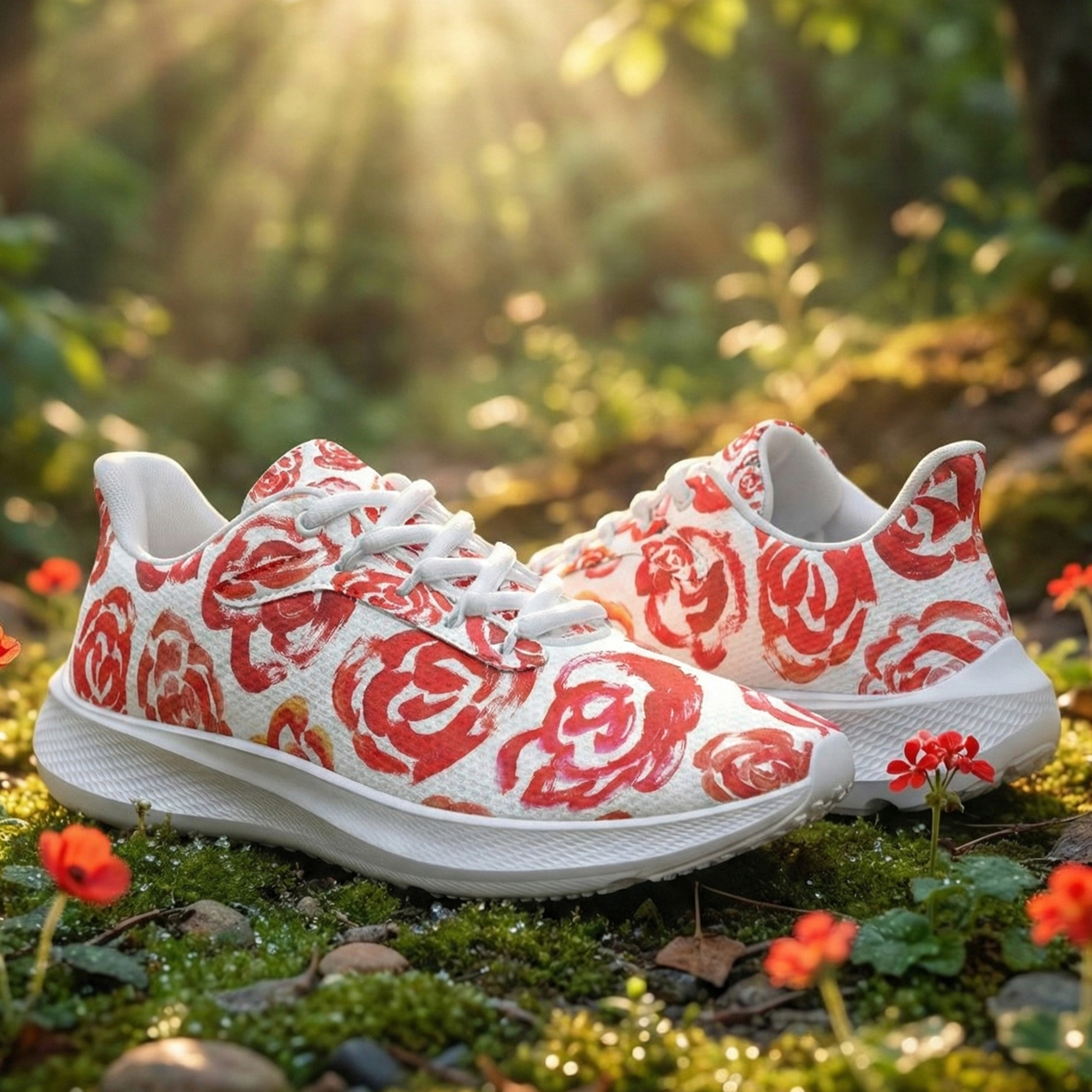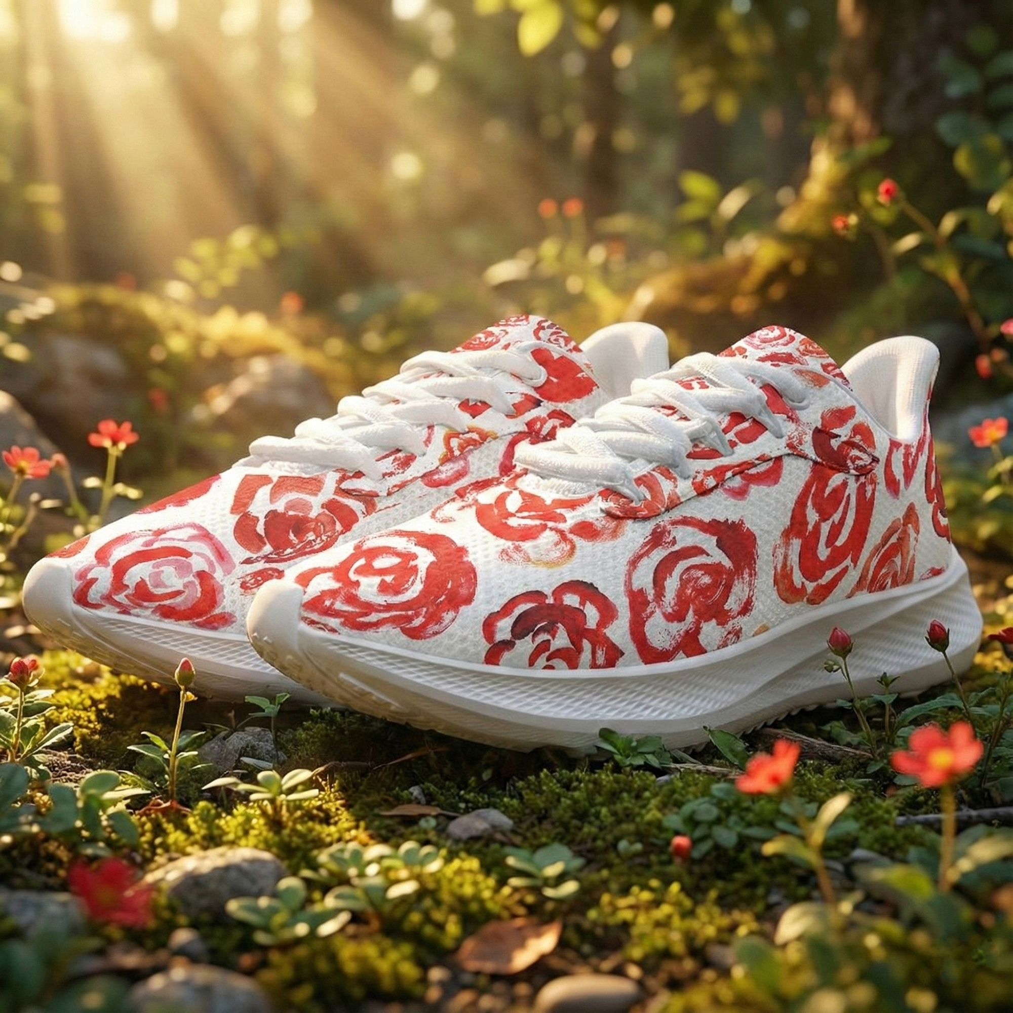 These unique running shoes with red flower blossoms aren't just footwear—they are a tribute to the boundless imagination of childhood.
