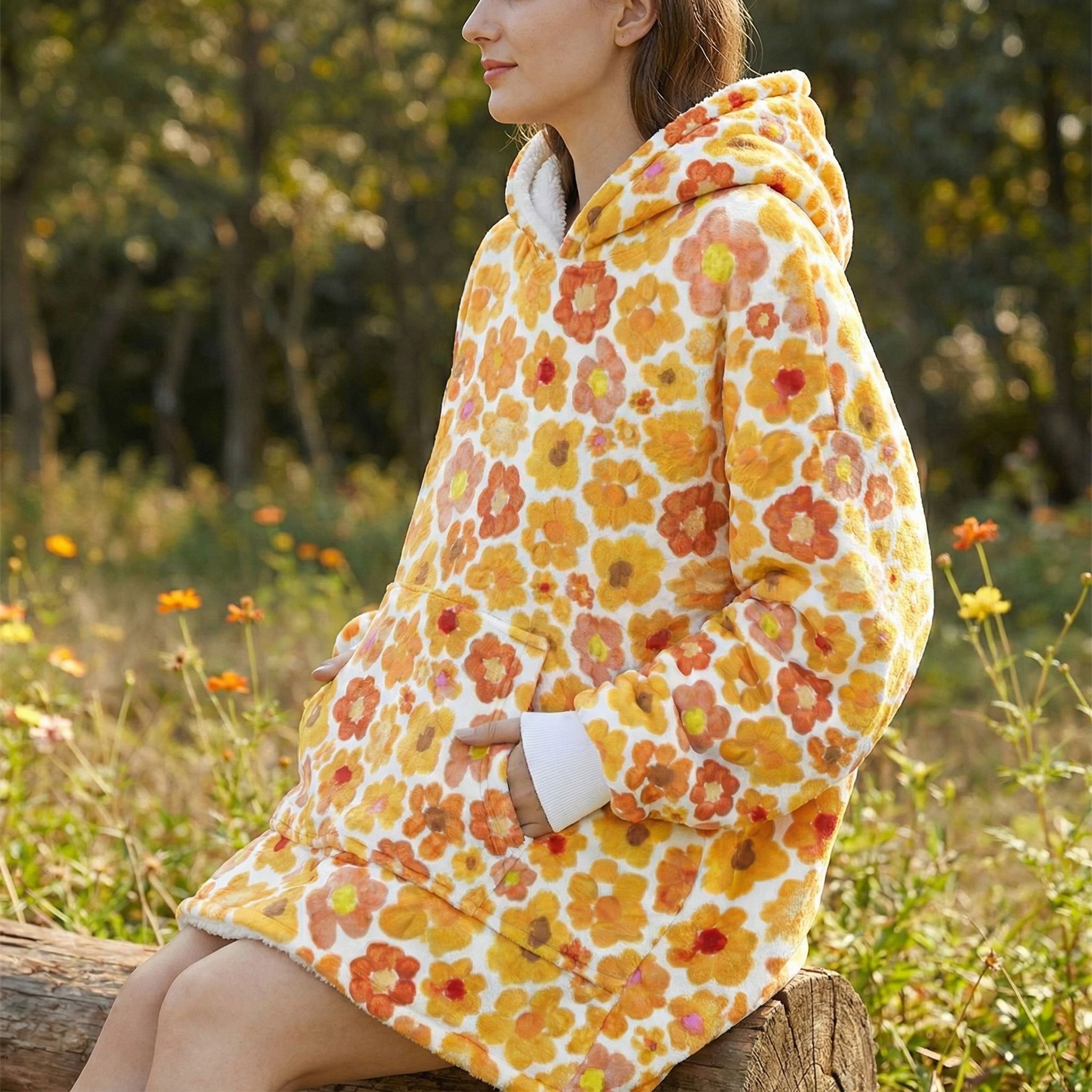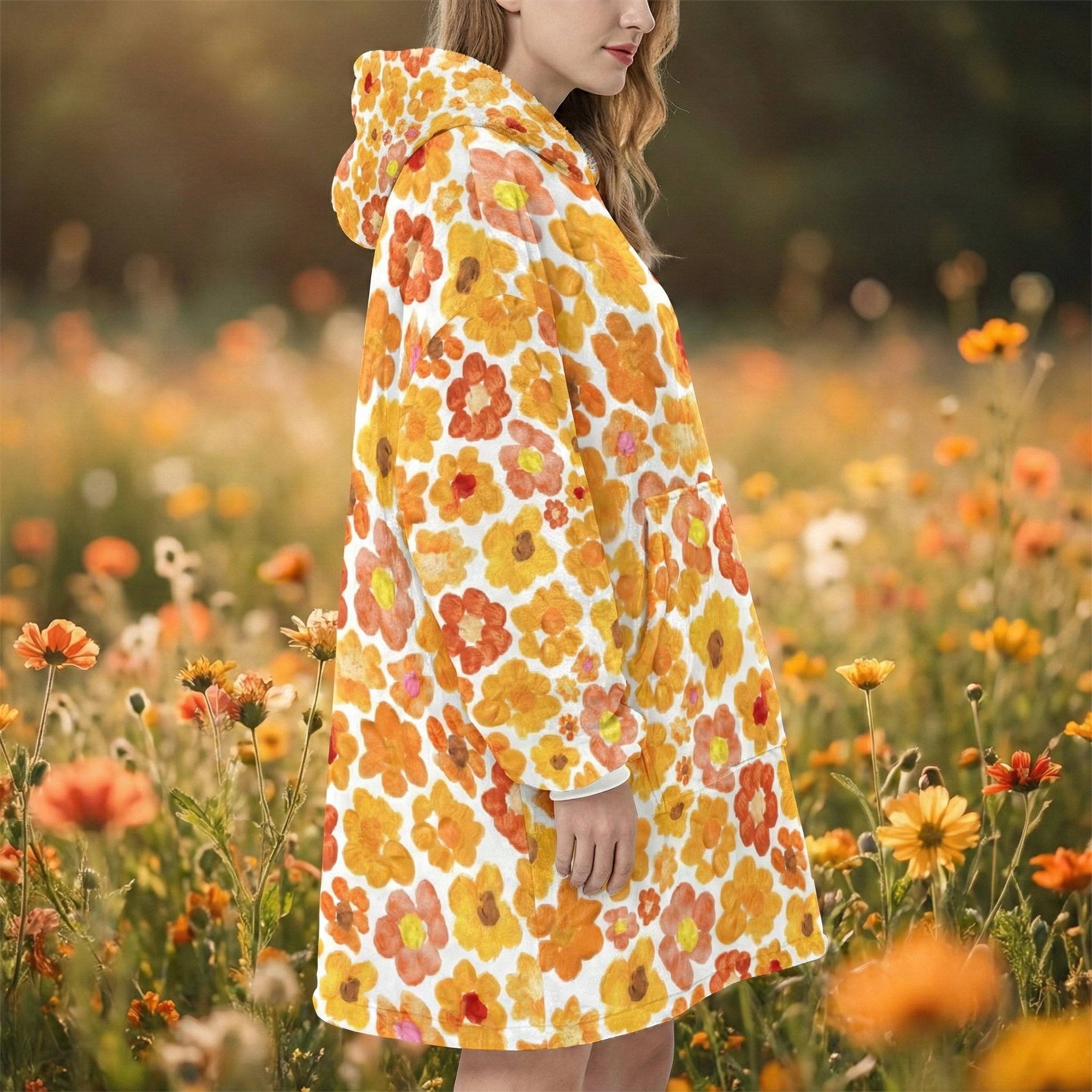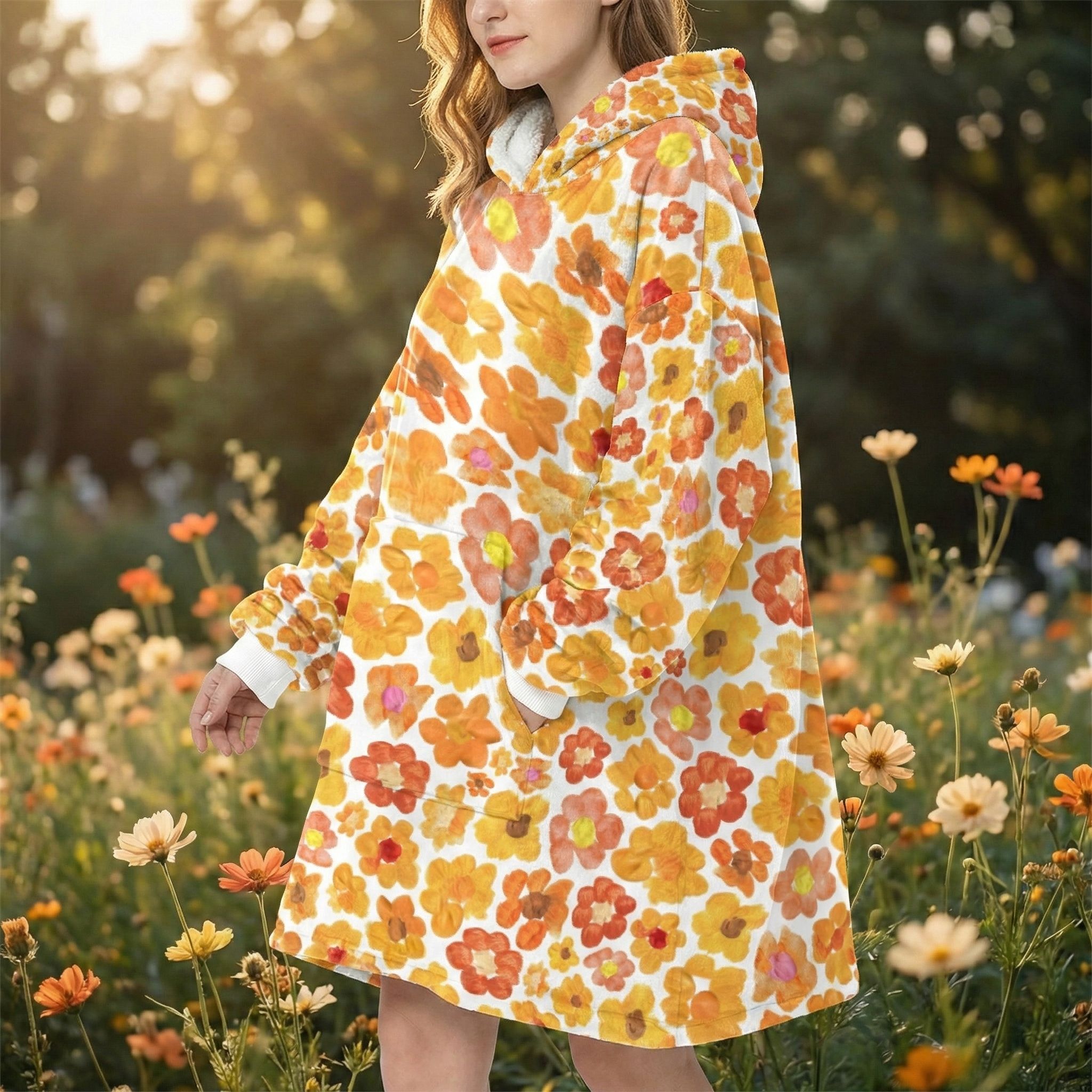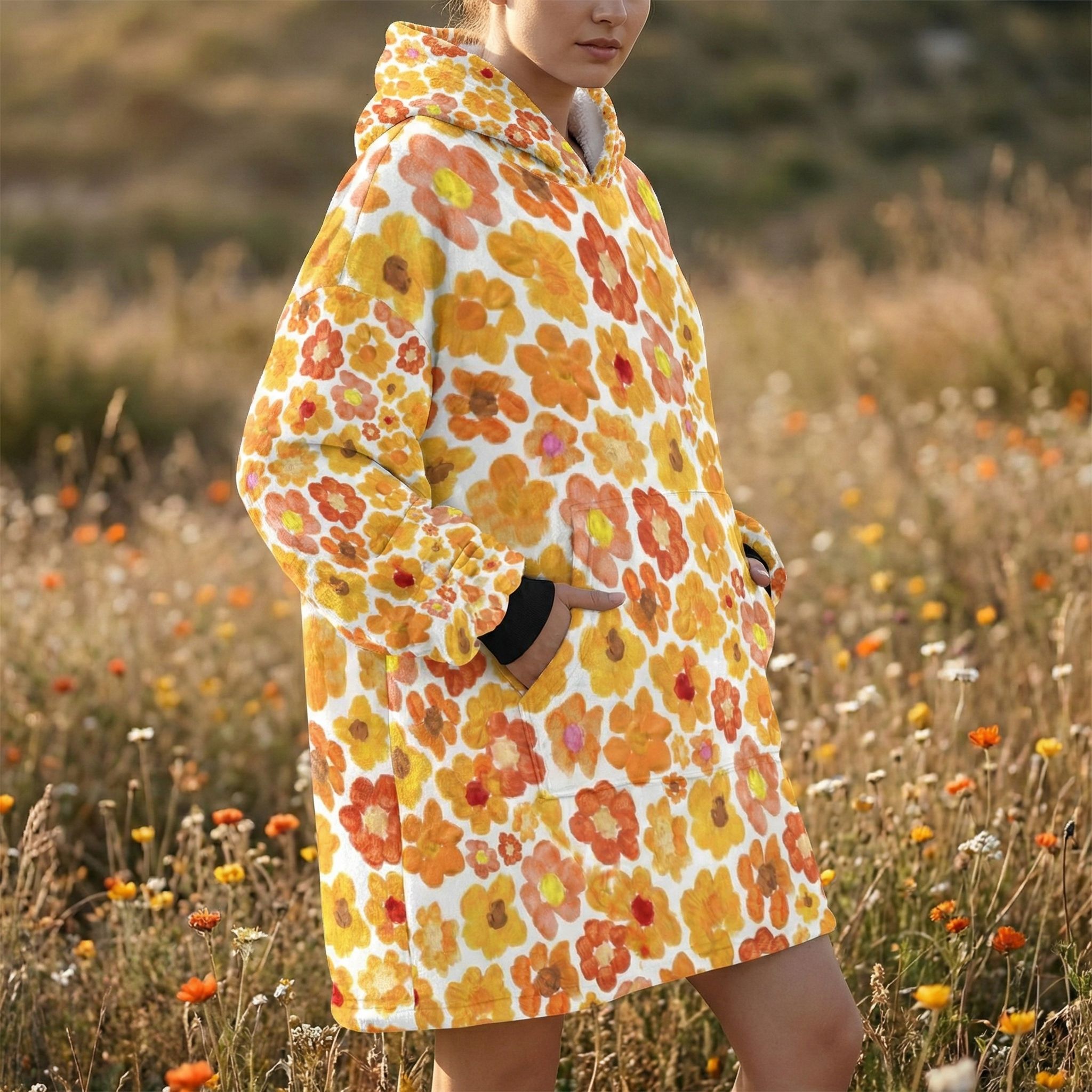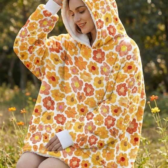 Women's Orange Flower Hoodie | Oversized Wearable Blanket | Zen Blossom Floral Print Sherpa Fleece A beautiful woman smiles while sitting in a sun-drenched floral garden wearing the Rear view of a woman walking through a meadow of wild sunflowers and poppies wearing the oversized orange floral print hooded blanket. The image highlights the generous 86cm length and 6XL loose fit that provides full-coverage comfort. The dense Frontal view of the Women's Orange Flower Hoodie standing in a golden-hour field. The giant kangaroo sanctuary pocket is clearly visible, designed as a fleece-lined haven for warming hands or storing essentials. This premium wearable blanket is crafted with a dual-layer system: a silken Micro-Mink outer layer for photo-realistic art and a thick, cloud-like Sherpa fleece lining for maximum heat retention. A top-tier gift for her, whether for a 2026 birthday, Mother’s Day, or a unique artistic Christmas surprise. Side profile of a model sitting on a rustic log in a tranquil forest setting, wrapped in the orange floral sherpa hoodie. The oversized sleeves and wide neck opening demonstrate the unrestricted movement of the 6XL design, perfect for sitting in the lotus position for meditation. The soft white cuffs and matching Sherpa hood lining provide a clean visual frame for the vibrant orange bloomcore aesthetic. This garment serves as a physical anchor for mindfulness, radiating peace, joy, and the energy of the Zen monastery. A vertical shot of the orange flower oversized hoodie showing the straight-drape 6XL silhouette. The high-altitude Sa Pa mountain energy is captured in the Close-up of a woman standing with her hands tucked into the giant front kangaroo pocket of the orange floral wearable blanket. The image highlights the texture of the Micro-Mink polyester and the thick, sturdy construction of the 970g garment. This A cinematic rear-angle shot of the Portrait of a woman posing with the orange flower hoodie, highlighting the black elastic wrist cuffs and the thick white Sherpa-lined hood. The artistic Women's Orange Flower Hoodie | Oversized Wearable Blanket | Zen Blossom Floral Print Sherpa Fleece ide profile of a woman walking through a grassy field, showcasing the black cuffs and the oversized hood of the orange floral wearable blanket. The movement of the fabric highlights the Women's Orange Flower Hoodie | Oversized Wearable Blanket | Zen Blossom Floral Print Sherpa Fleece Women's Orange Flower Hoodie | Oversized Wearable Blanket | Zen Blossom Floral Print Sherpa Fleece Women's Orange Flower Hoodie | Oversized Wearable Blanket | Zen Blossom Floral Print Sherpa Fleece Women's Orange Flower Hoodie | Oversized Wearable Blanket | Zen Blossom Floral Print Sherpa Fleece Women's Orange Flower Hoodie | Oversized Wearable Blanket | Zen Blossom Floral Print Sherpa Fleece Extreme macro close-up of the 100% premium white Sherpa fleece lining inside the orange flower hoodie. The image shows the fluffy, high-pile texture that mimics natural wool while remaining 100% vegan and cruelty-free. This cloud-soft interior is designed to trap body heat instantly, providing a luxurious sensory experience next to the skin. It is the core of the