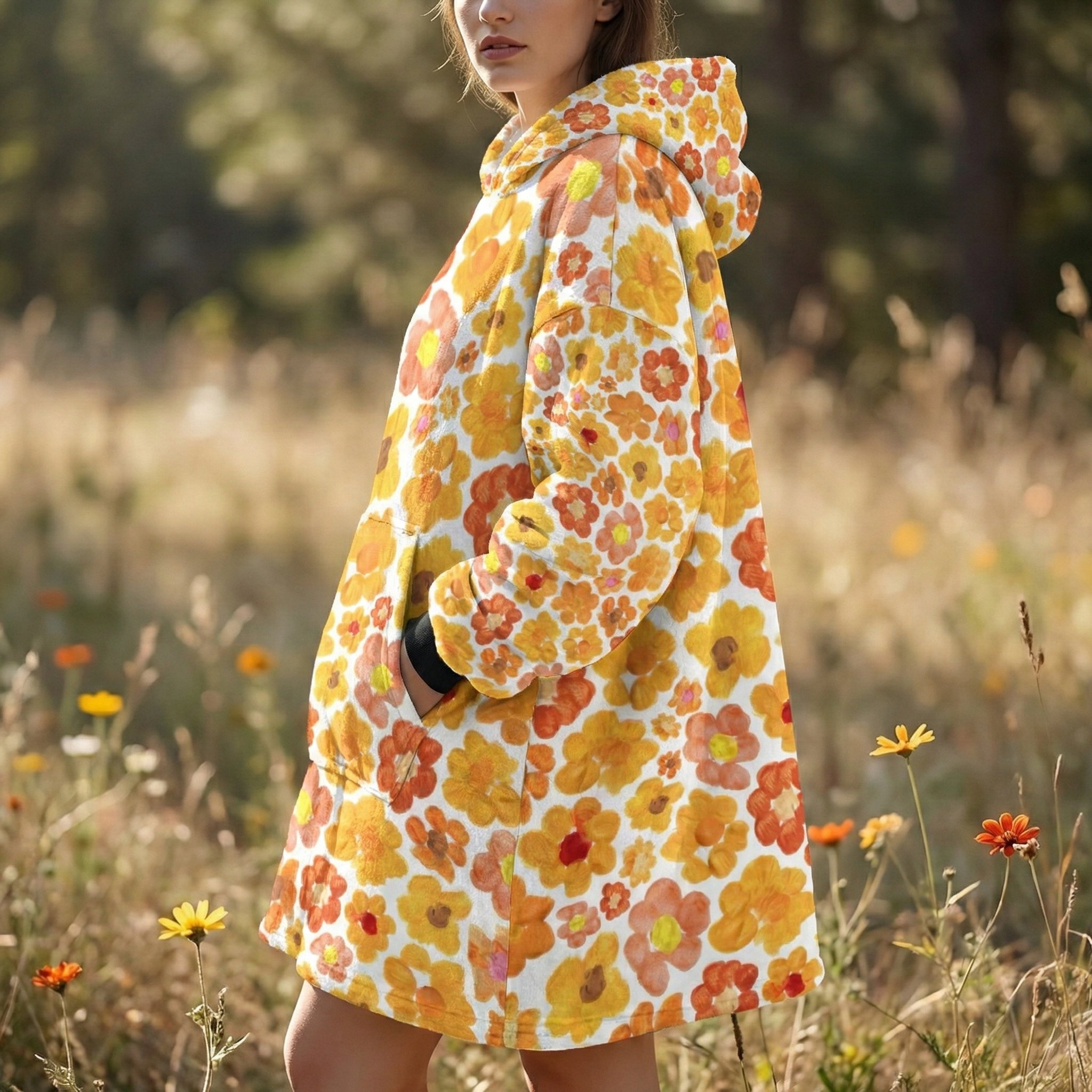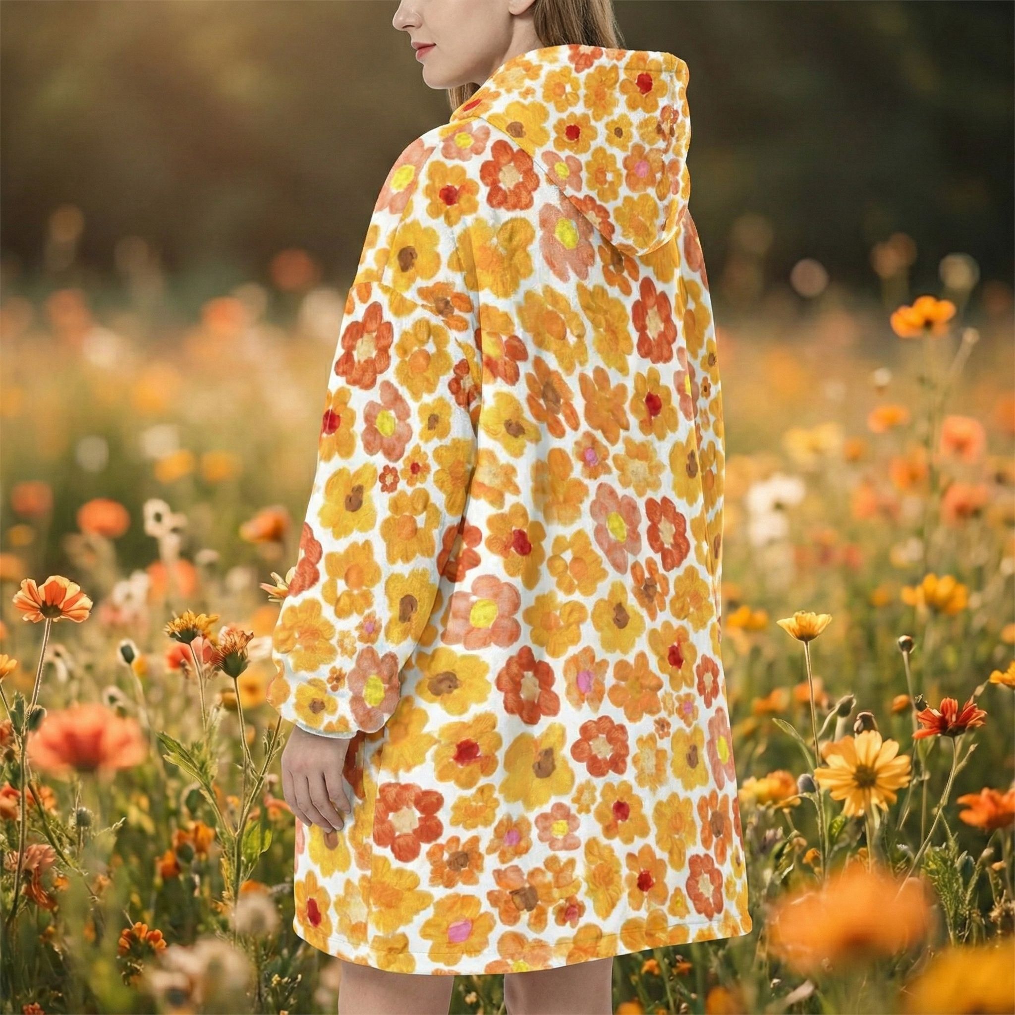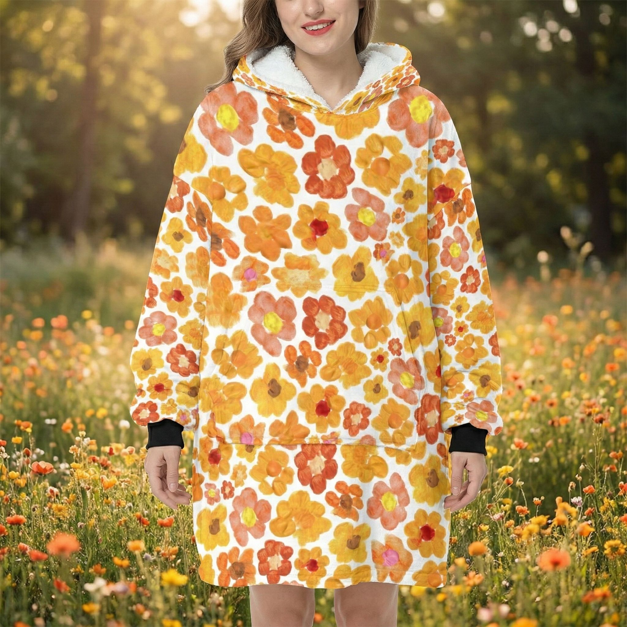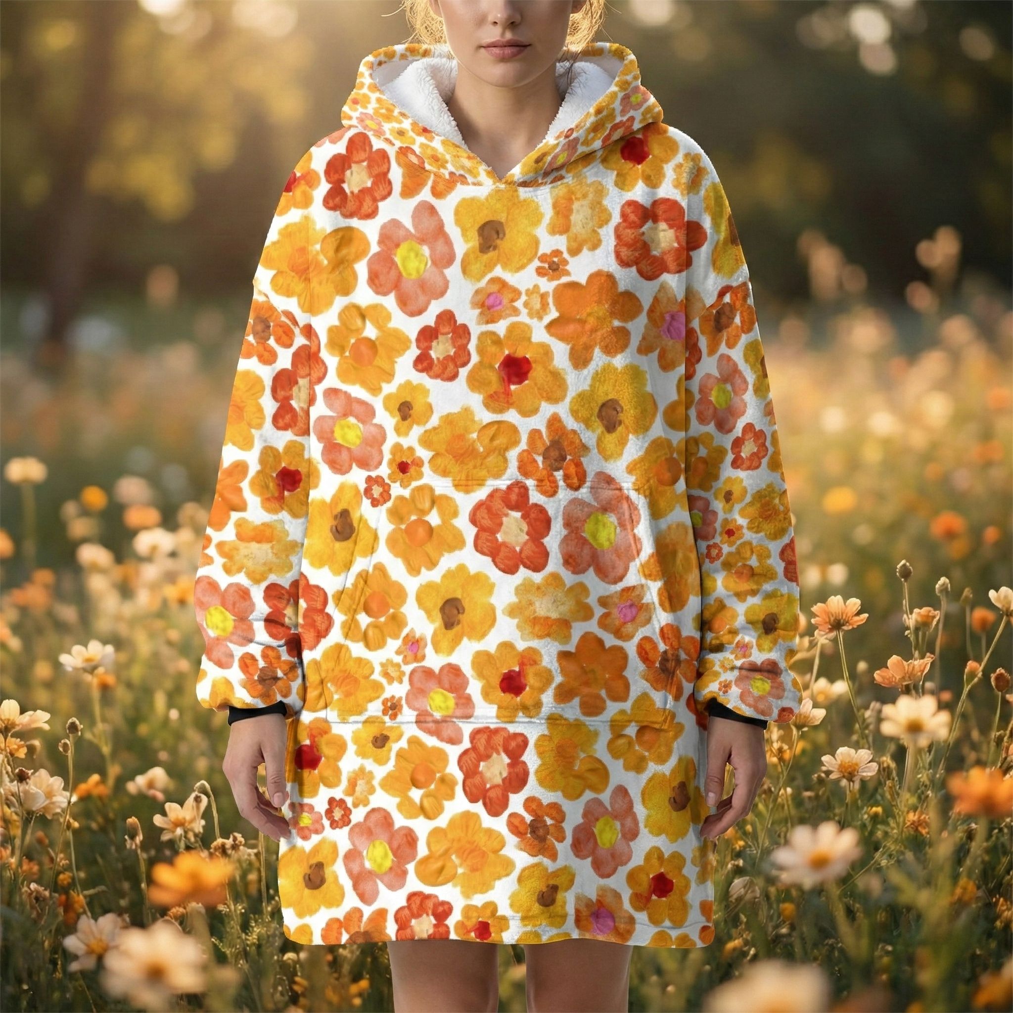 Women's Orange Flower Hoodie | Oversized Wearable Blanket | Zen Blossom Floral Print Sherpa Fleece A beautiful woman smiles while sitting in a sun-drenched floral garden wearing the Rear view of a woman walking through a meadow of wild sunflowers and poppies wearing the oversized orange floral print hooded blanket. The image highlights the generous 86cm length and 6XL loose fit that provides full-coverage comfort. The dense Frontal view of the Women's Orange Flower Hoodie standing in a golden-hour field. The giant kangaroo sanctuary pocket is clearly visible, designed as a fleece-lined haven for warming hands or storing essentials. This premium wearable blanket is crafted with a dual-layer system: a silken Micro-Mink outer layer for photo-realistic art and a thick, cloud-like Sherpa fleece lining for maximum heat retention. A top-tier gift for her, whether for a 2026 birthday, Mother’s Day, or a unique artistic Christmas surprise. Side profile of a model sitting on a rustic log in a tranquil forest setting, wrapped in the orange floral sherpa hoodie. The oversized sleeves and wide neck opening demonstrate the unrestricted movement of the 6XL design, perfect for sitting in the lotus position for meditation. The soft white cuffs and matching Sherpa hood lining provide a clean visual frame for the vibrant orange bloomcore aesthetic. This garment serves as a physical anchor for mindfulness, radiating peace, joy, and the energy of the Zen monastery. A vertical shot of the orange flower oversized hoodie showing the straight-drape 6XL silhouette. The high-altitude Sa Pa mountain energy is captured in the Close-up of a woman standing with her hands tucked into the giant front kangaroo pocket of the orange floral wearable blanket. The image highlights the texture of the Micro-Mink polyester and the thick, sturdy construction of the 970g garment. This A cinematic rear-angle shot of the Portrait of a woman posing with the orange flower hoodie, highlighting the black elastic wrist cuffs and the thick white Sherpa-lined hood. The artistic Women's Orange Flower Hoodie | Oversized Wearable Blanket | Zen Blossom Floral Print Sherpa Fleece ide profile of a woman walking through a grassy field, showcasing the black cuffs and the oversized hood of the orange floral wearable blanket. The movement of the fabric highlights the Women's Orange Flower Hoodie | Oversized Wearable Blanket | Zen Blossom Floral Print Sherpa Fleece Women's Orange Flower Hoodie | Oversized Wearable Blanket | Zen Blossom Floral Print Sherpa Fleece Women's Orange Flower Hoodie | Oversized Wearable Blanket | Zen Blossom Floral Print Sherpa Fleece Women's Orange Flower Hoodie | Oversized Wearable Blanket | Zen Blossom Floral Print Sherpa Fleece Women's Orange Flower Hoodie | Oversized Wearable Blanket | Zen Blossom Floral Print Sherpa Fleece Extreme macro close-up of the 100% premium white Sherpa fleece lining inside the orange flower hoodie. The image shows the fluffy, high-pile texture that mimics natural wool while remaining 100% vegan and cruelty-free. This cloud-soft interior is designed to trap body heat instantly, providing a luxurious sensory experience next to the skin. It is the core of the