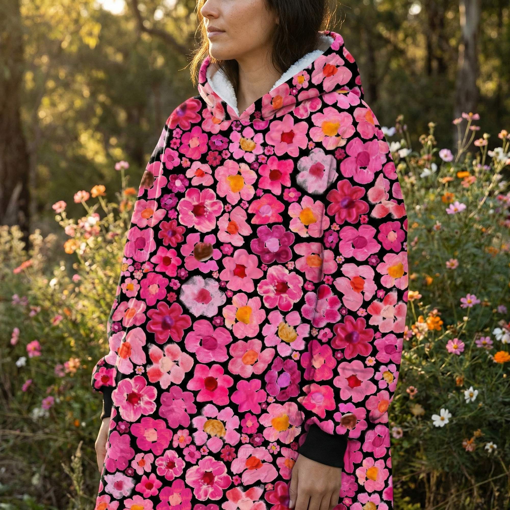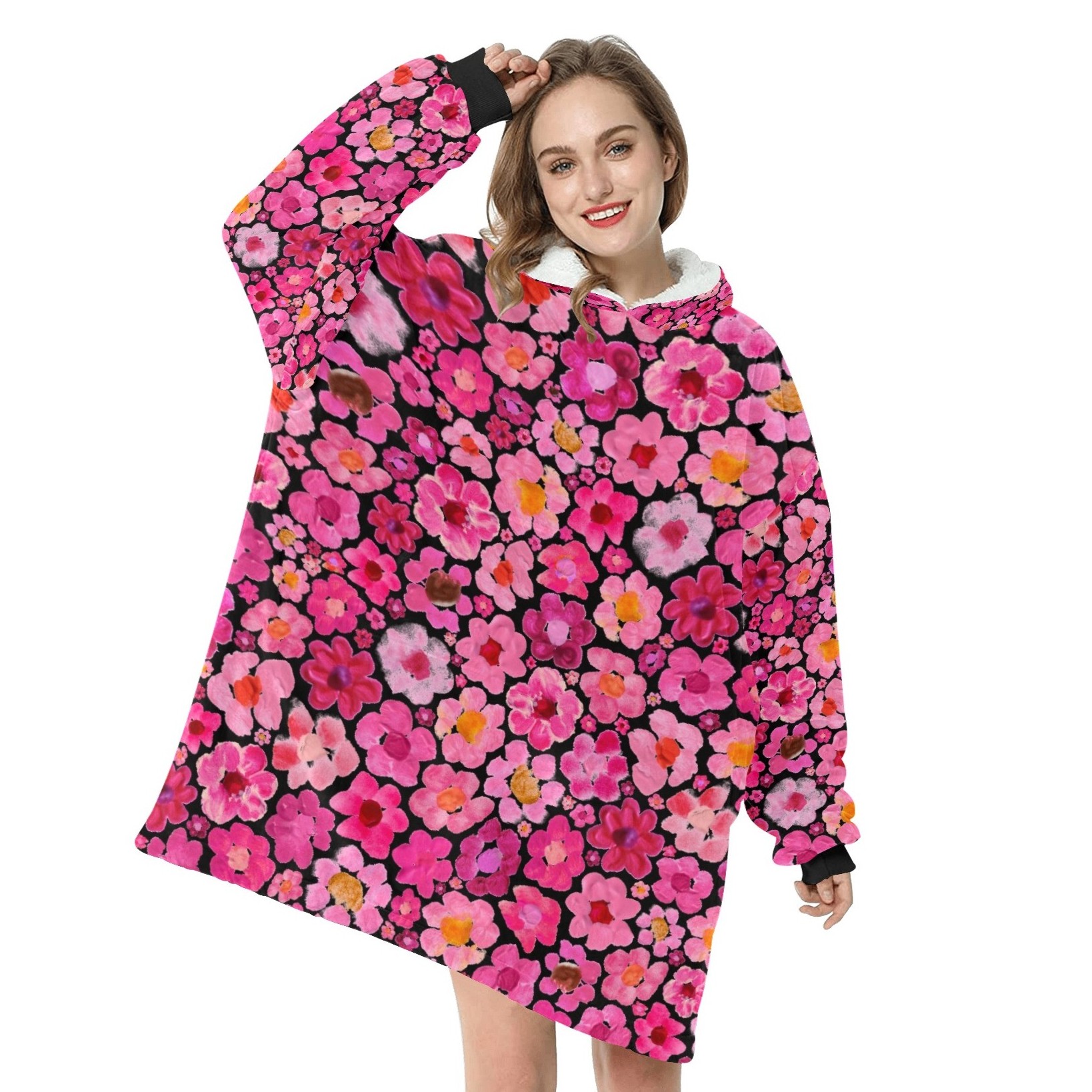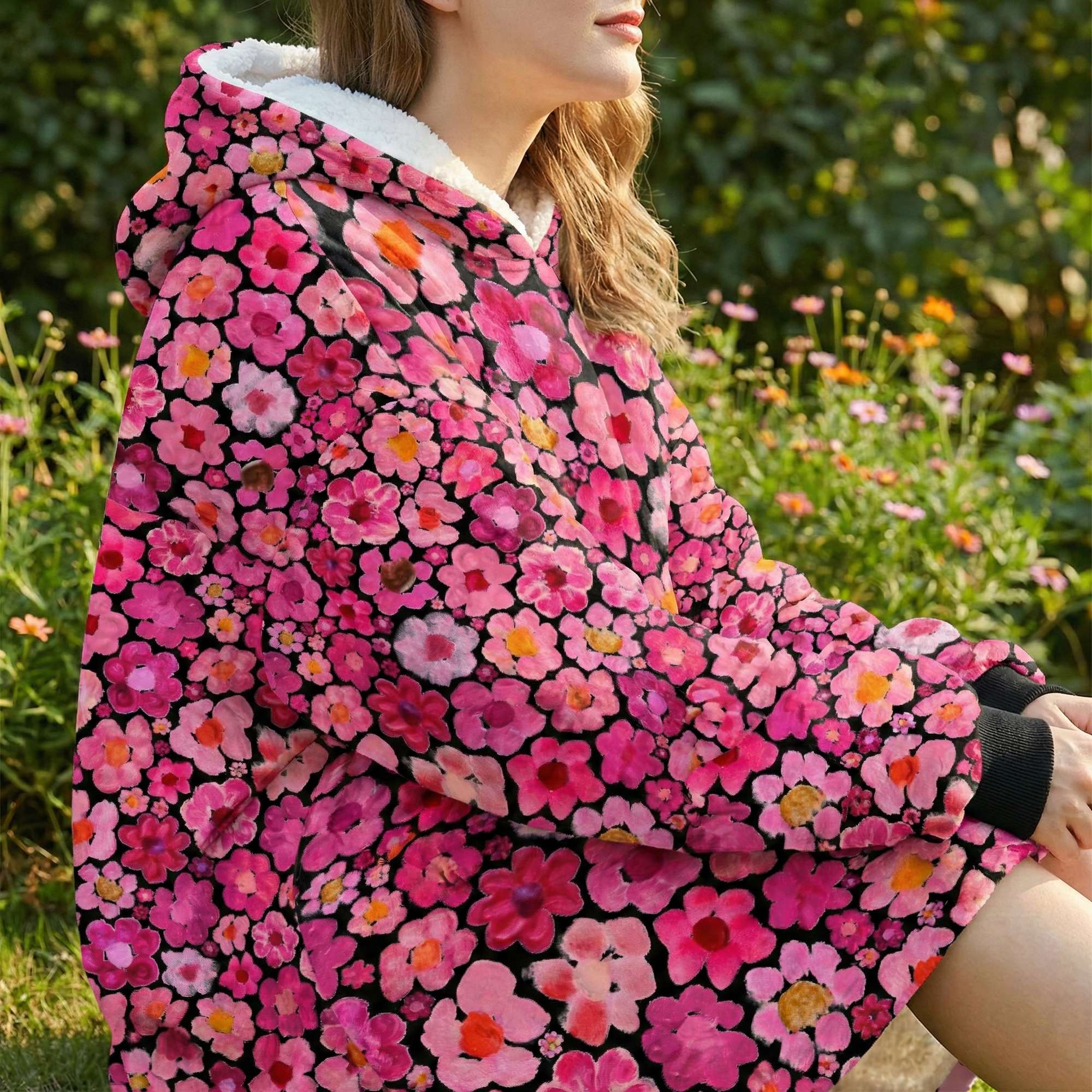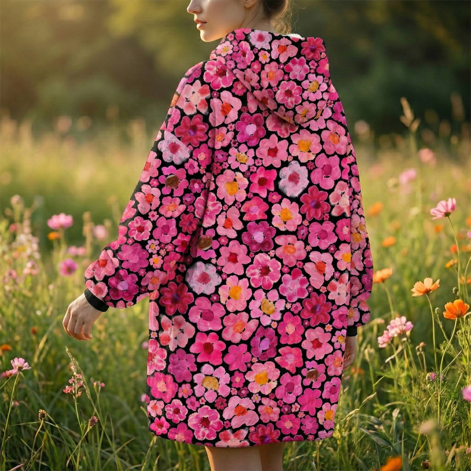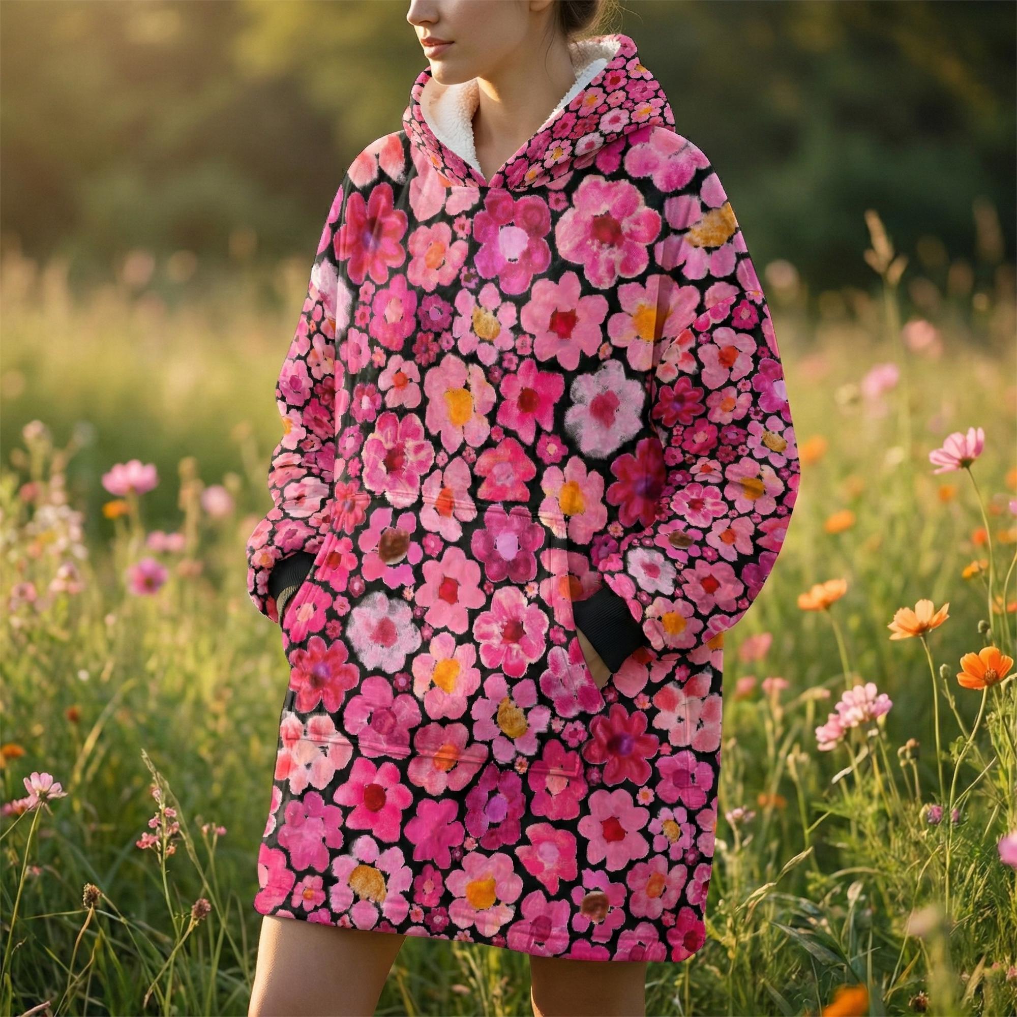 Women's Pink Flower Hoodie | Oversized Wearable Blanket | Zen Blossom Floral Print Sherpa Fleece