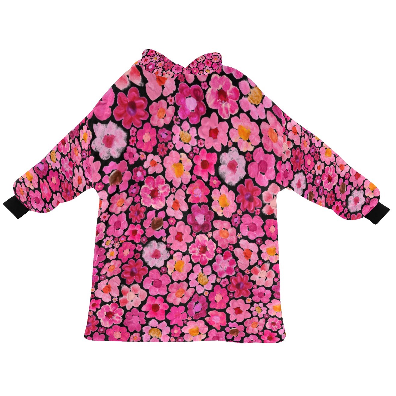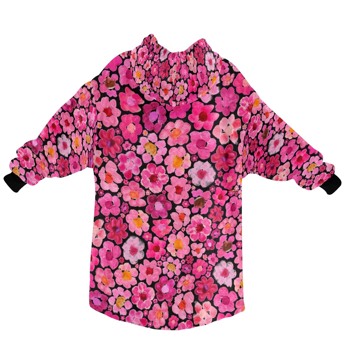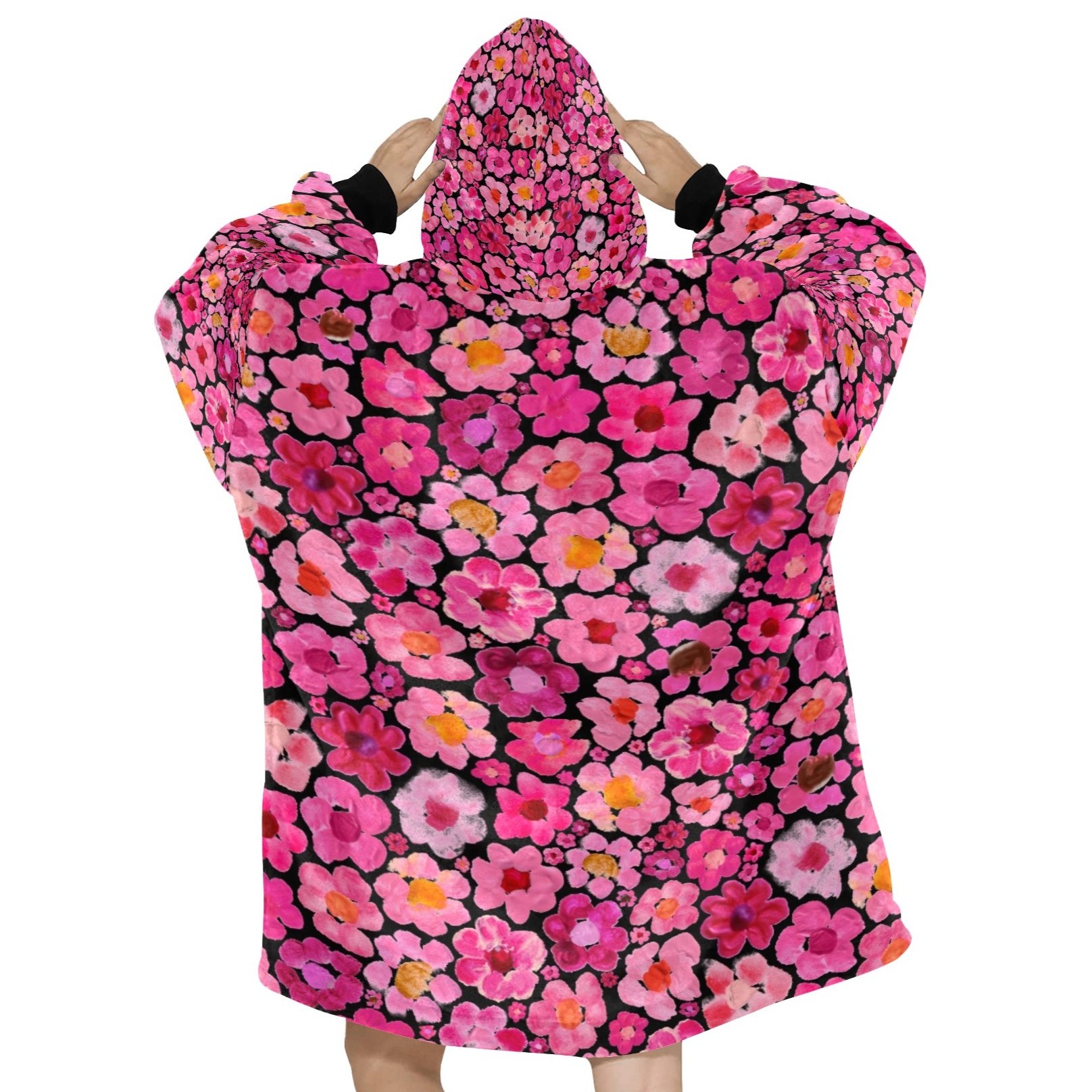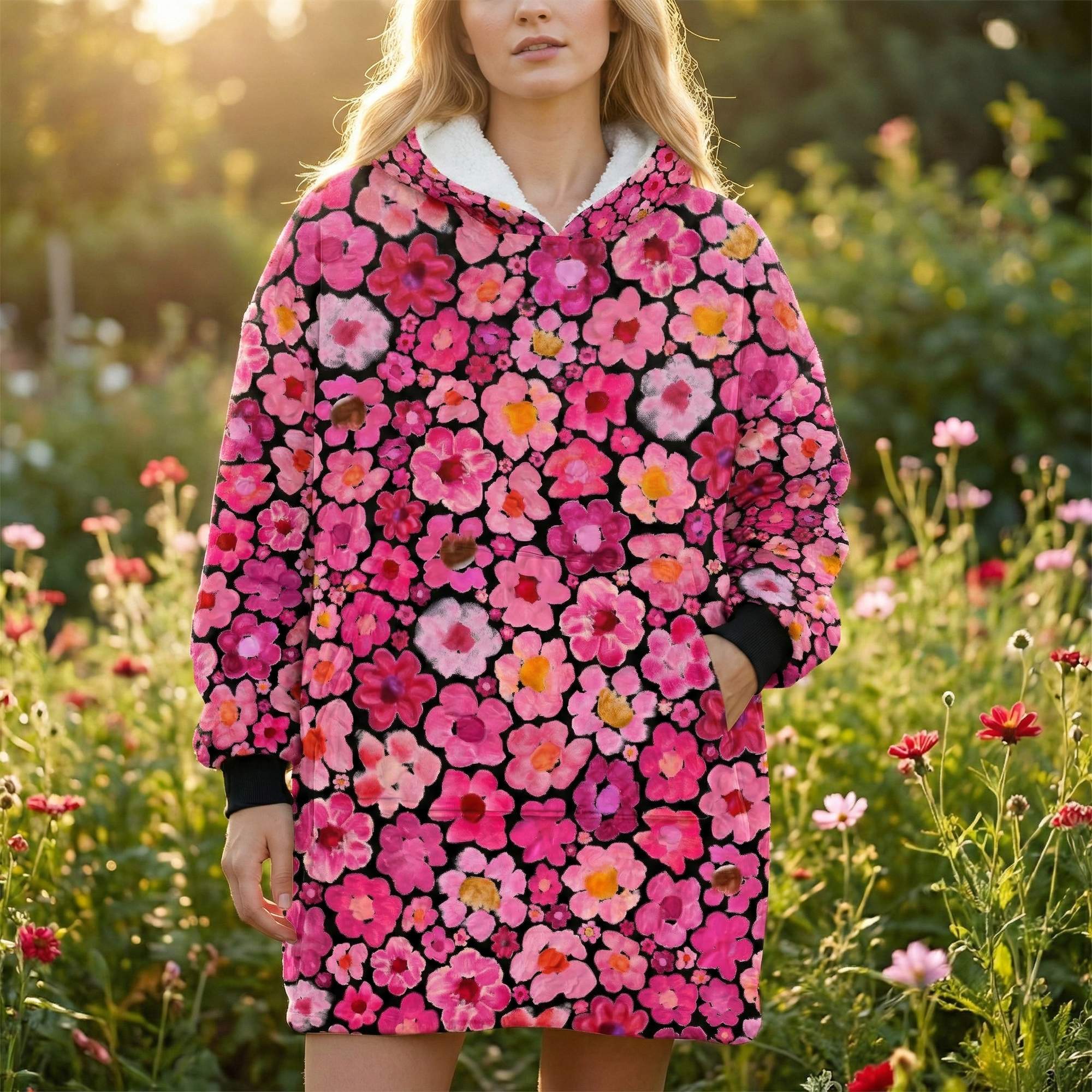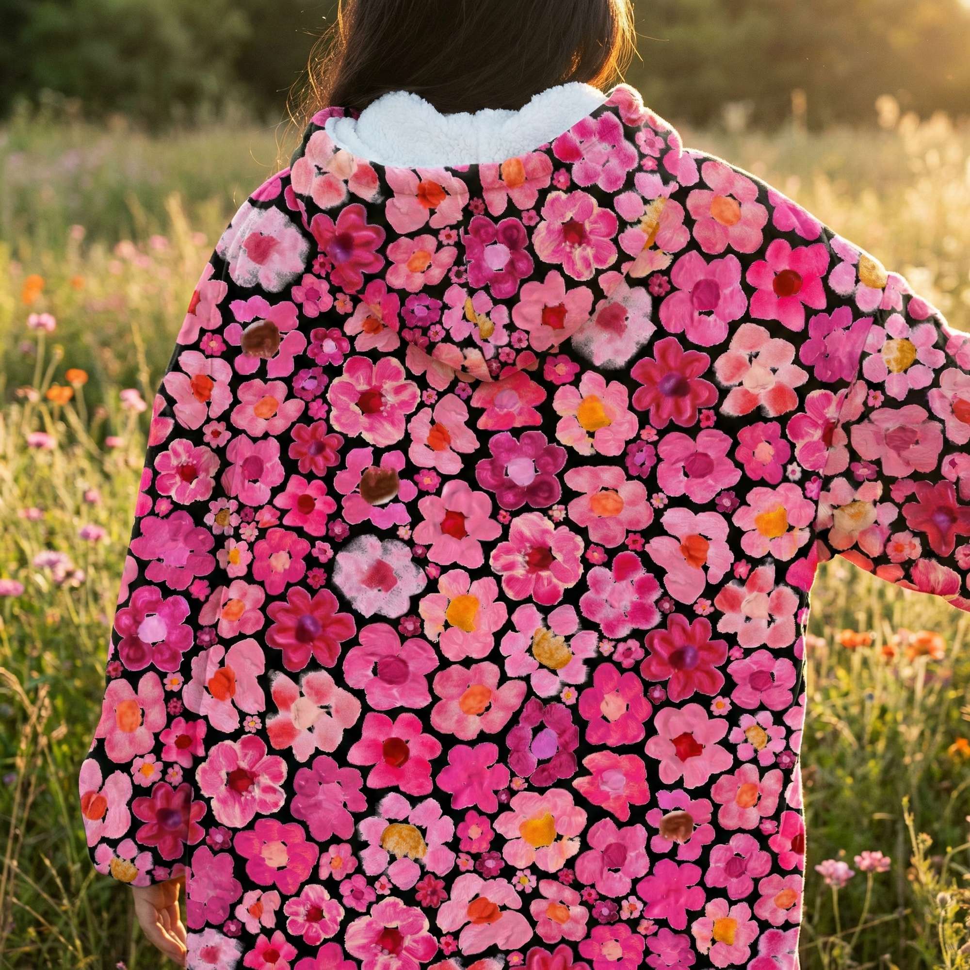 Women's Pink Flower Hoodie | Oversized Wearable Blanket | Zen Blossom Floral Print Sherpa Fleece