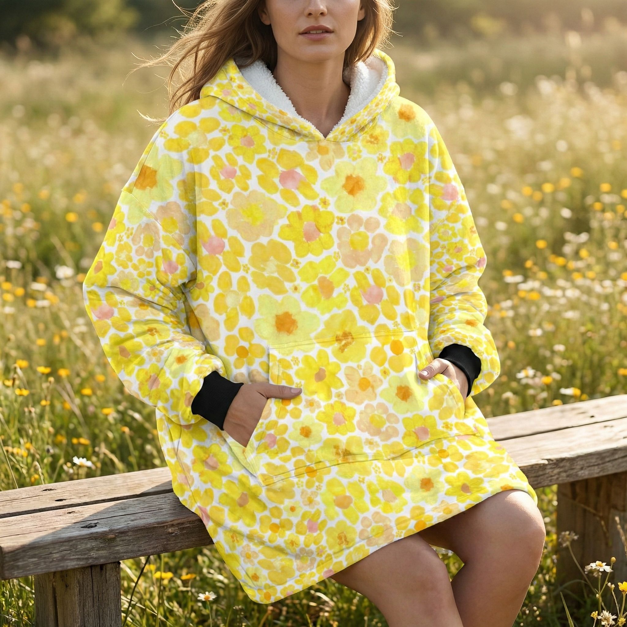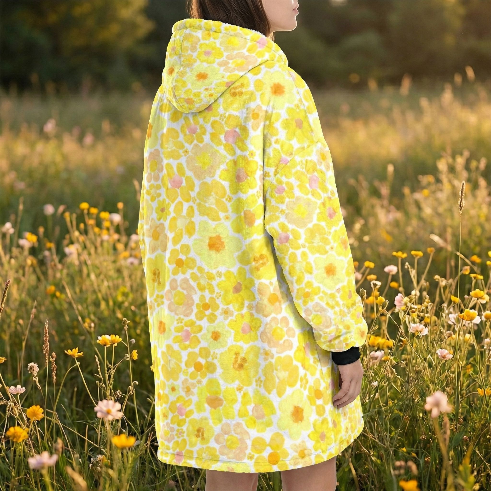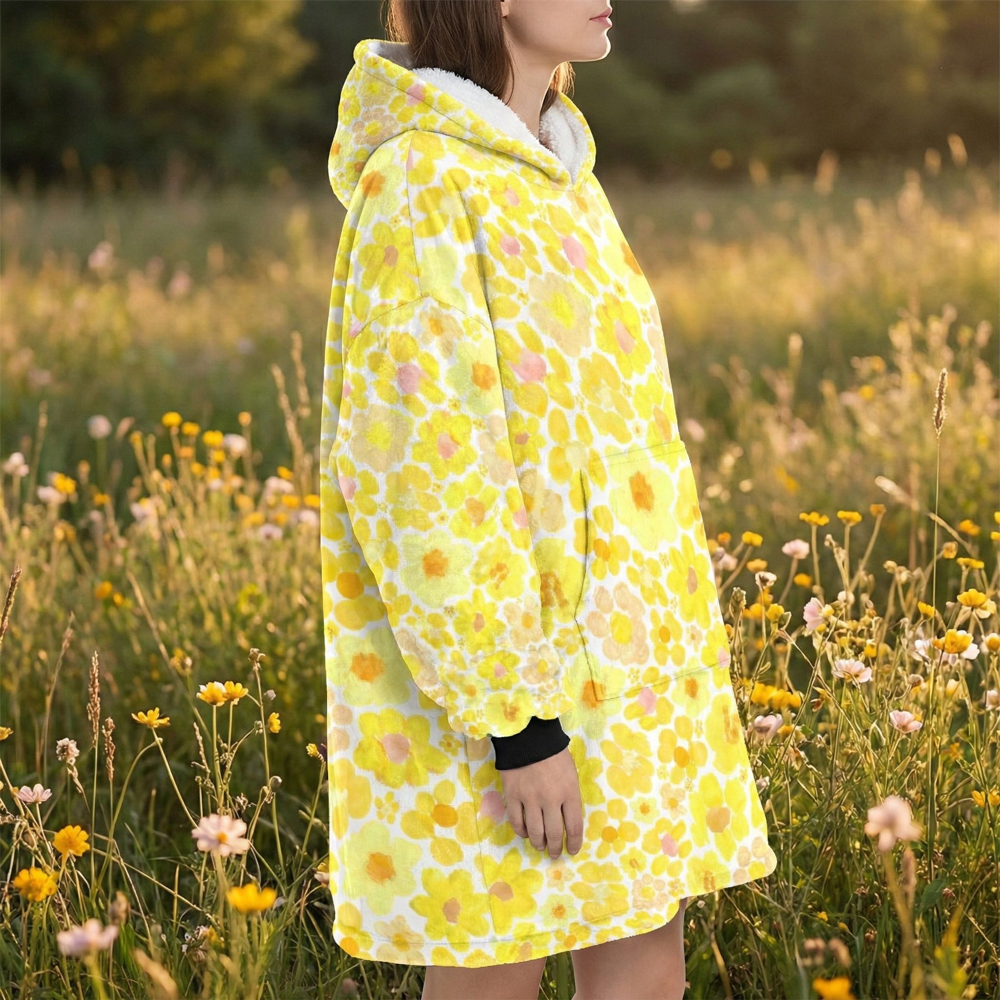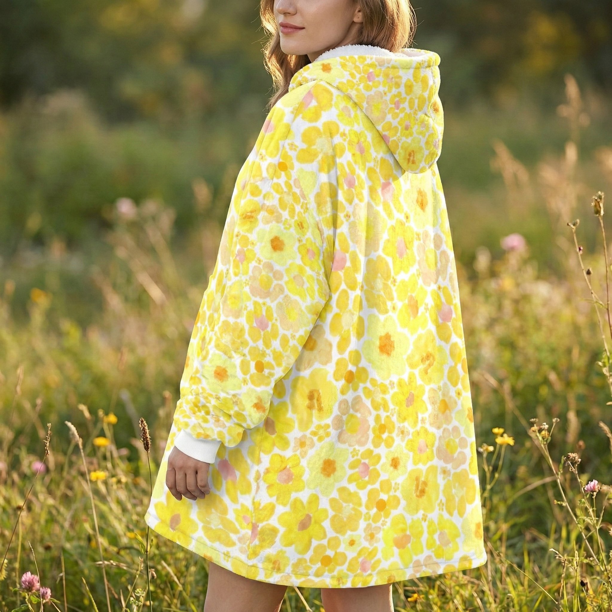 Women's Yellow Flower Hoodie | Oversized Wearable Blanket | Zen Blossom Floral Print Sherpa Fleece