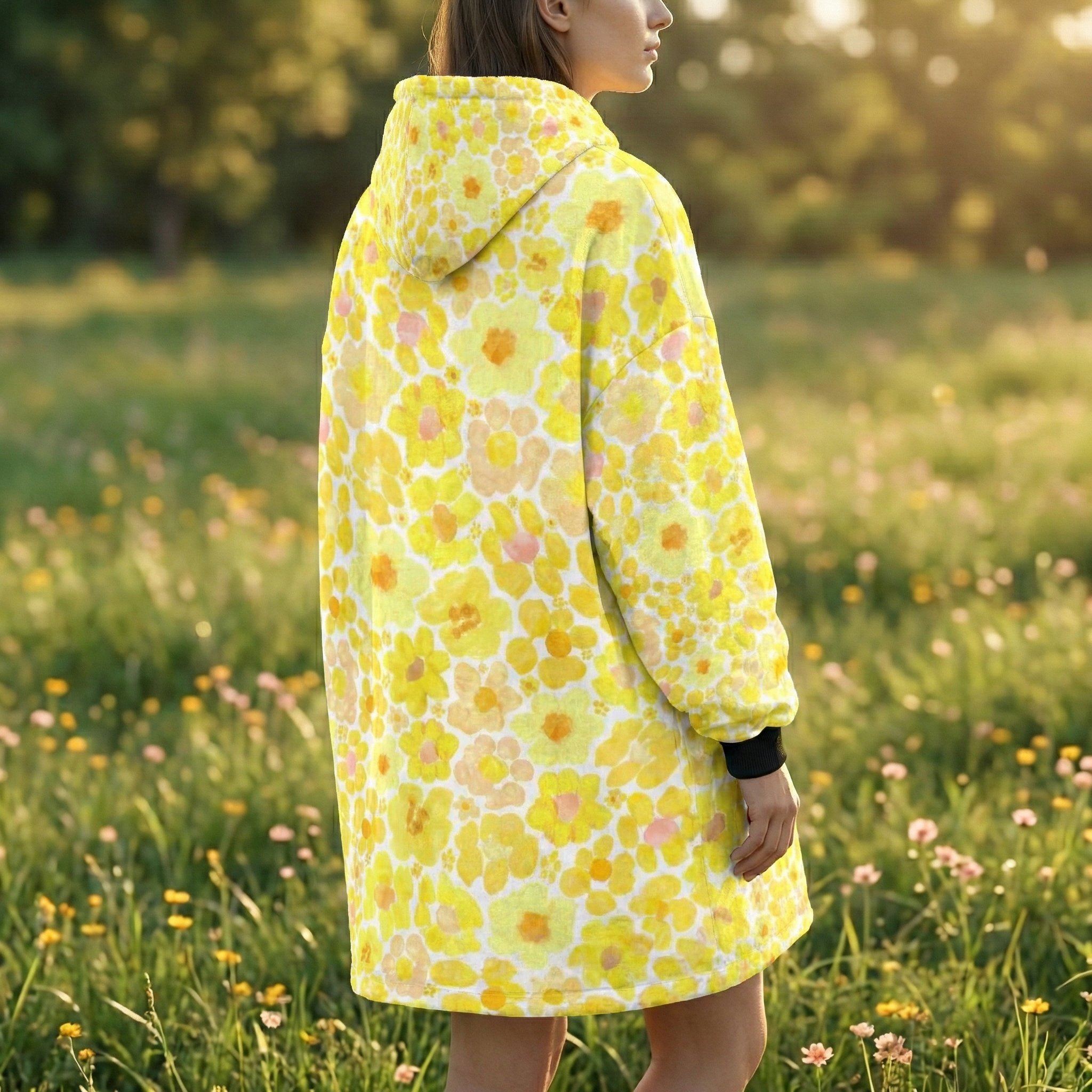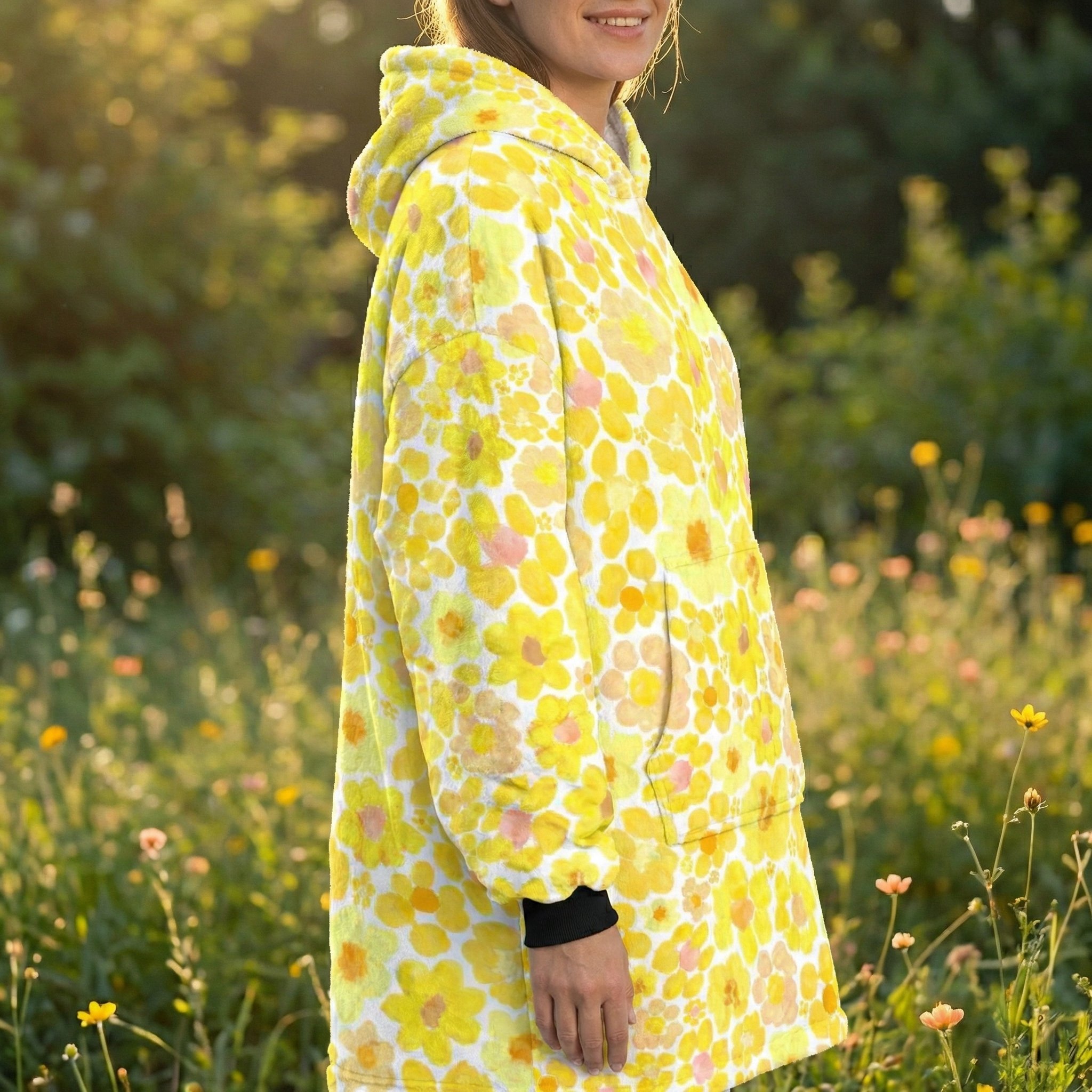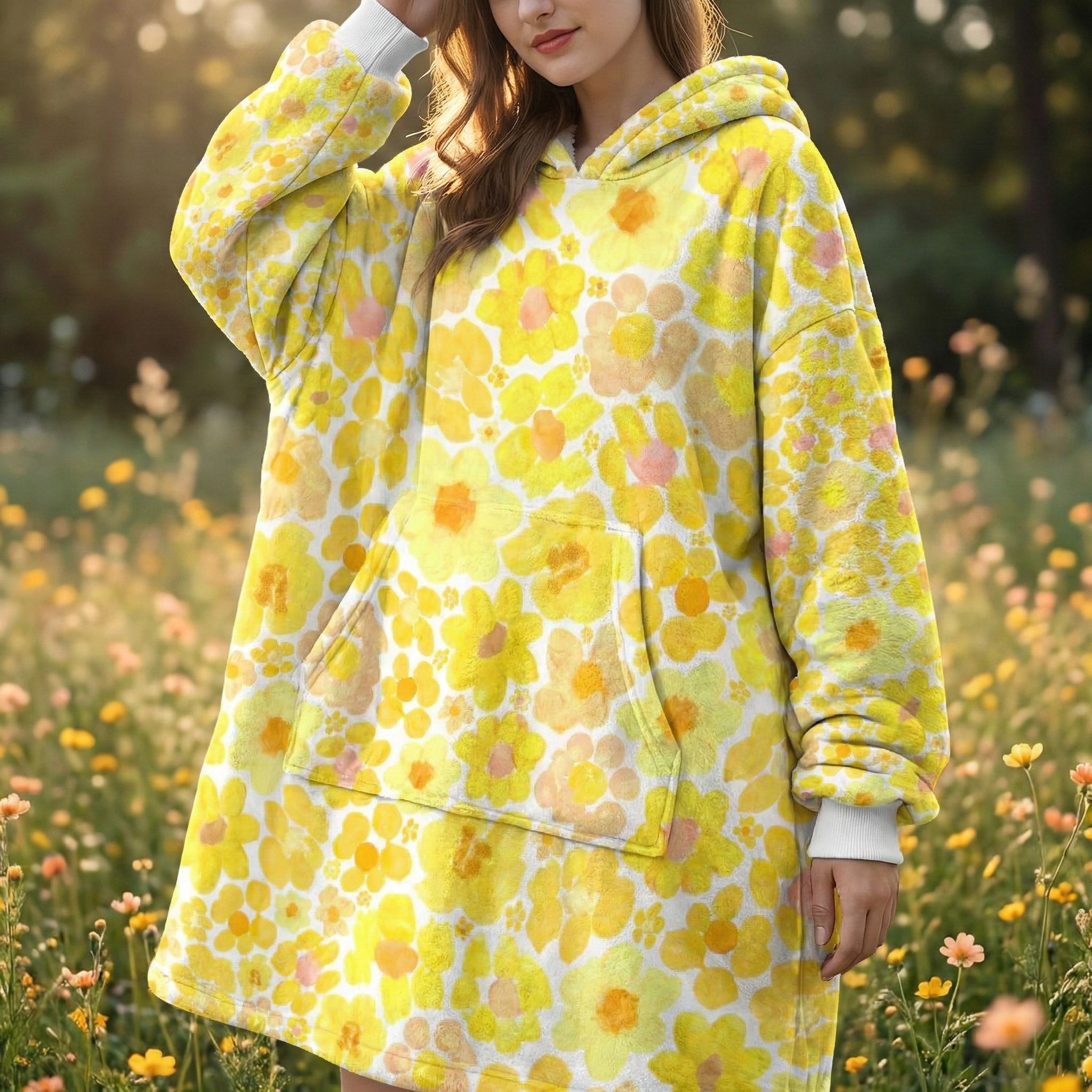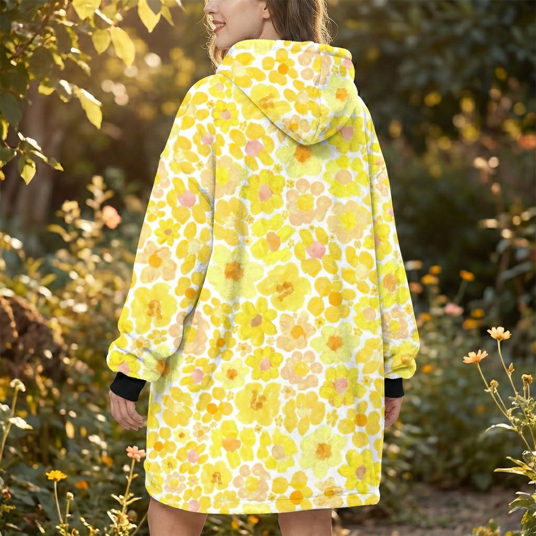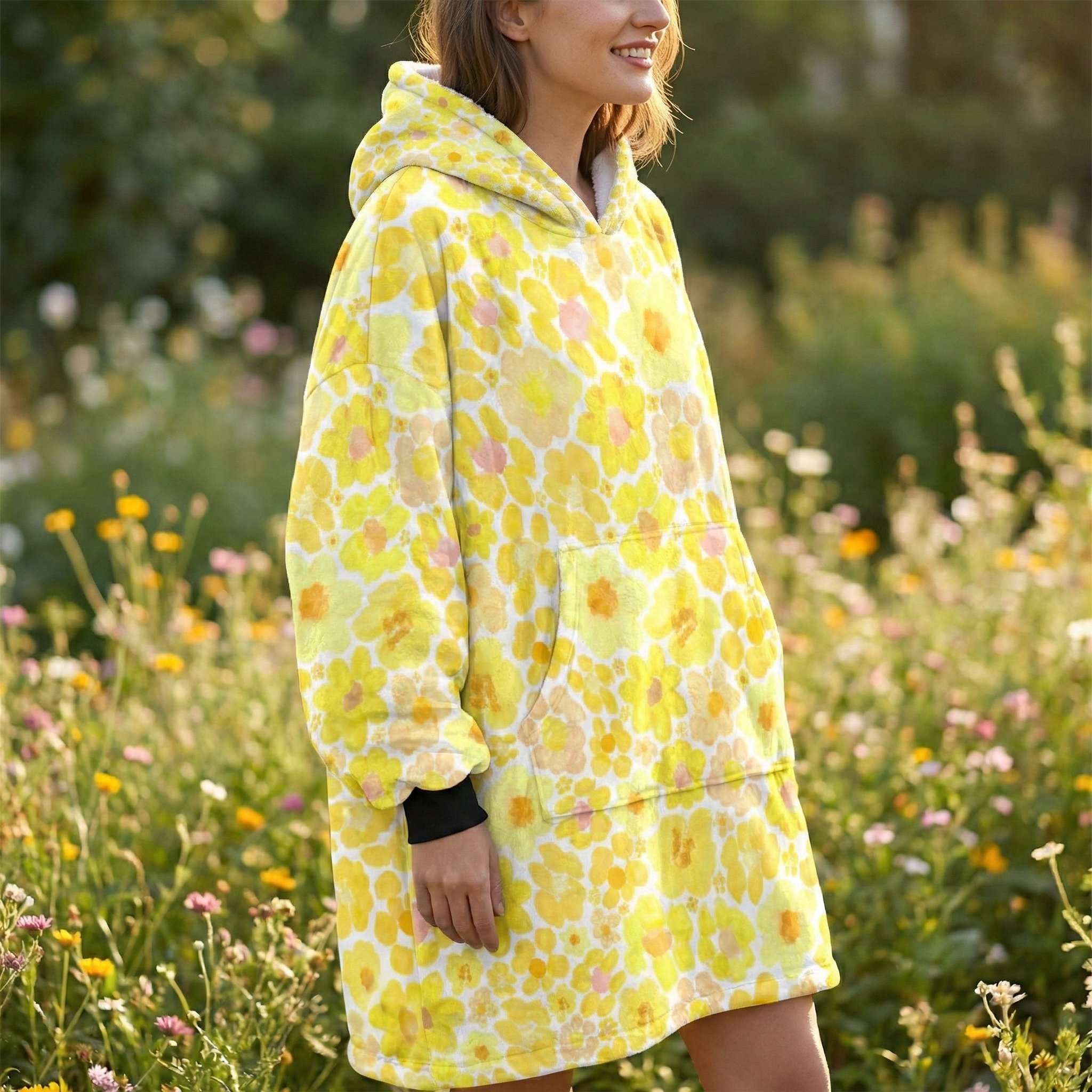 Women's Yellow Flower Hoodie | Oversized Wearable Blanket | Zen Blossom Floral Print Sherpa Fleece