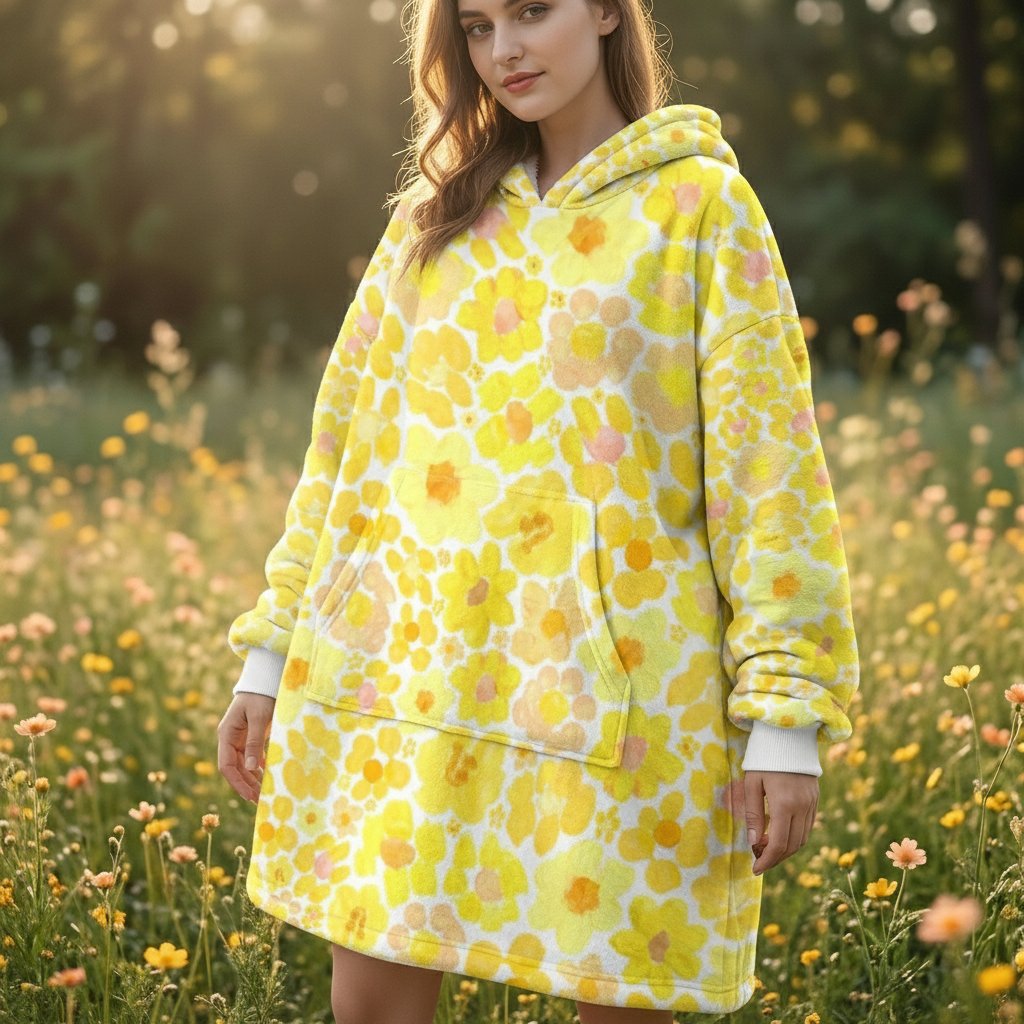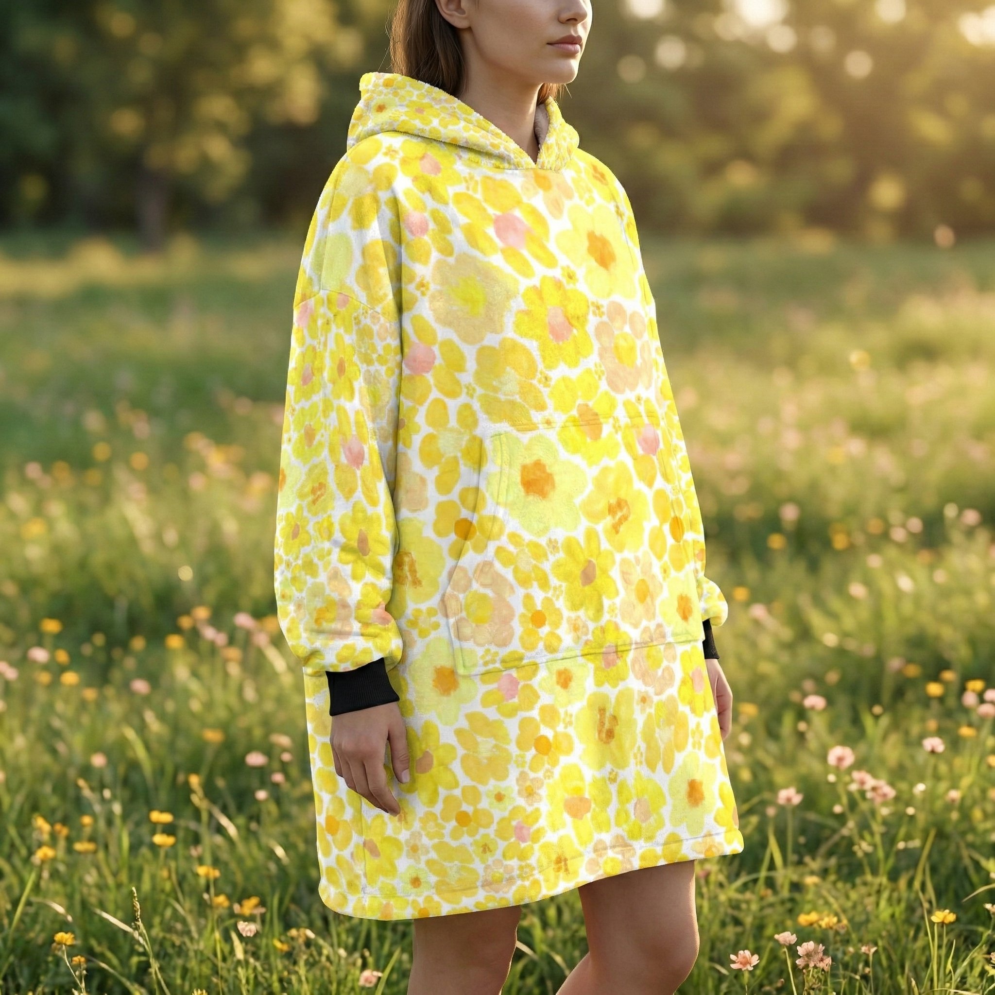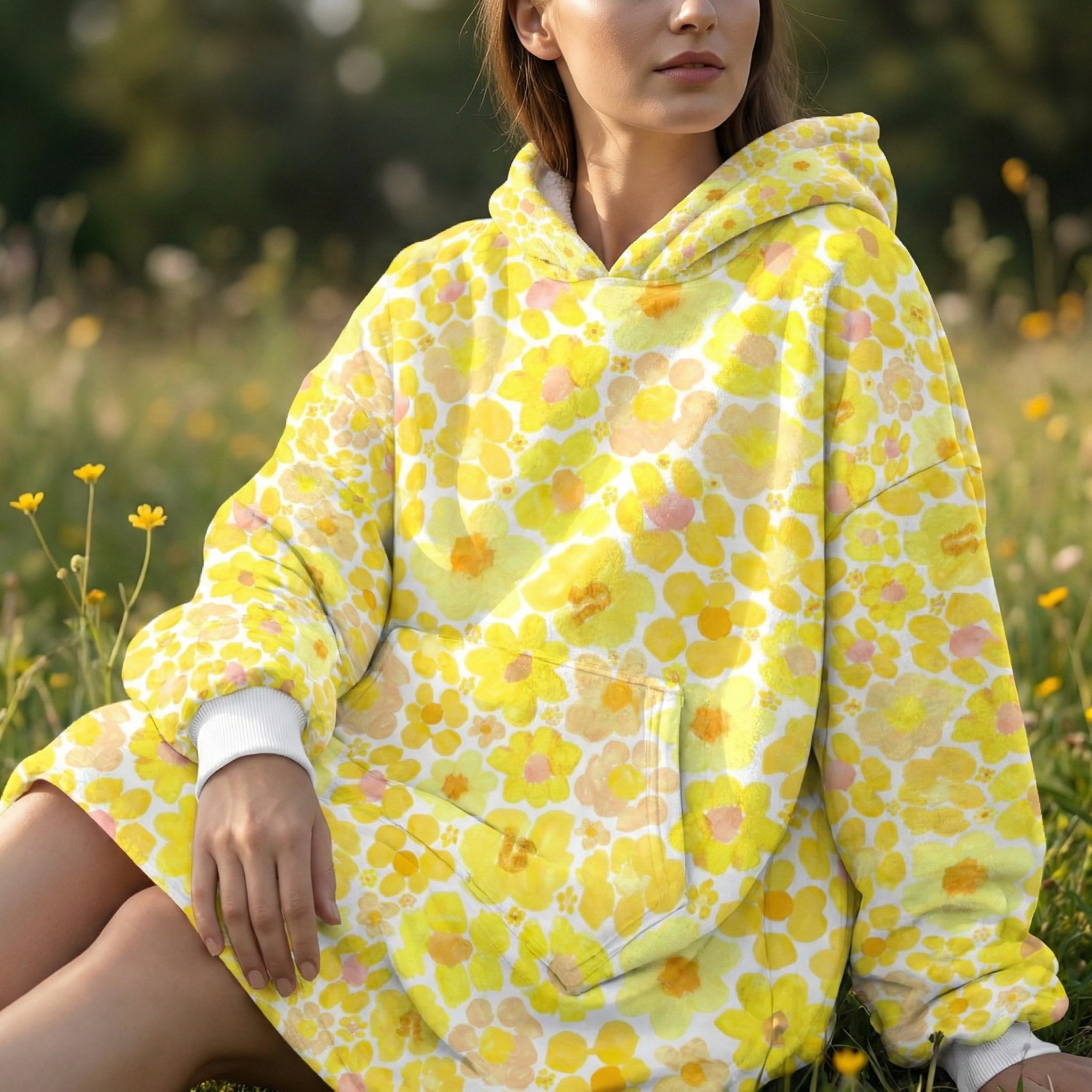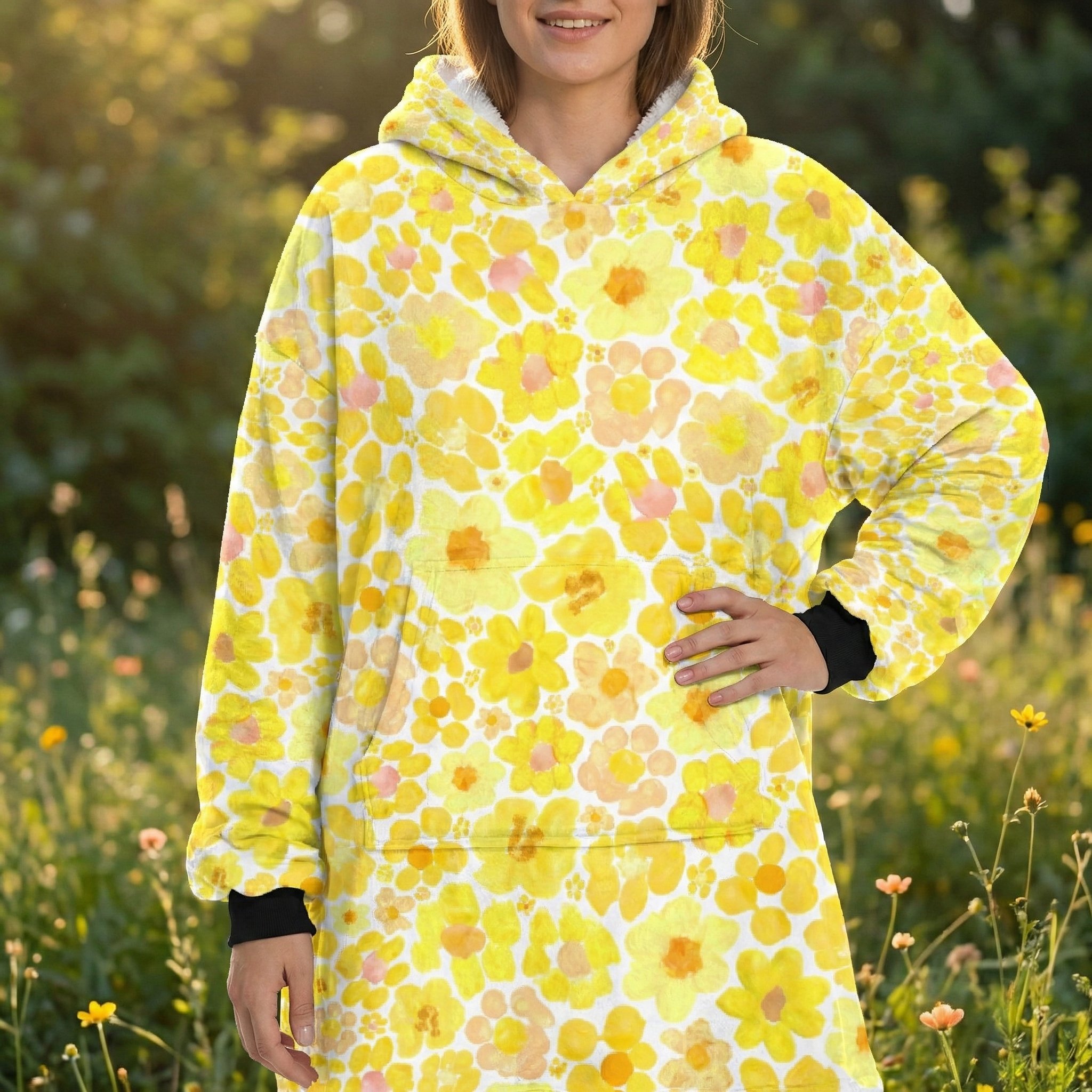 Women's Yellow Flower Hoodie | Oversized Wearable Blanket | Zen Blossom Floral Print Sherpa Fleece