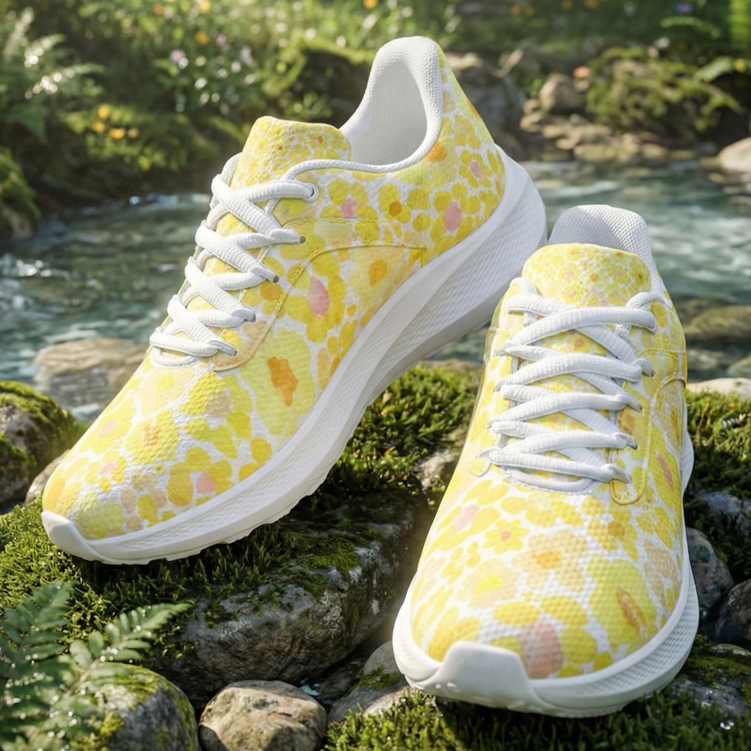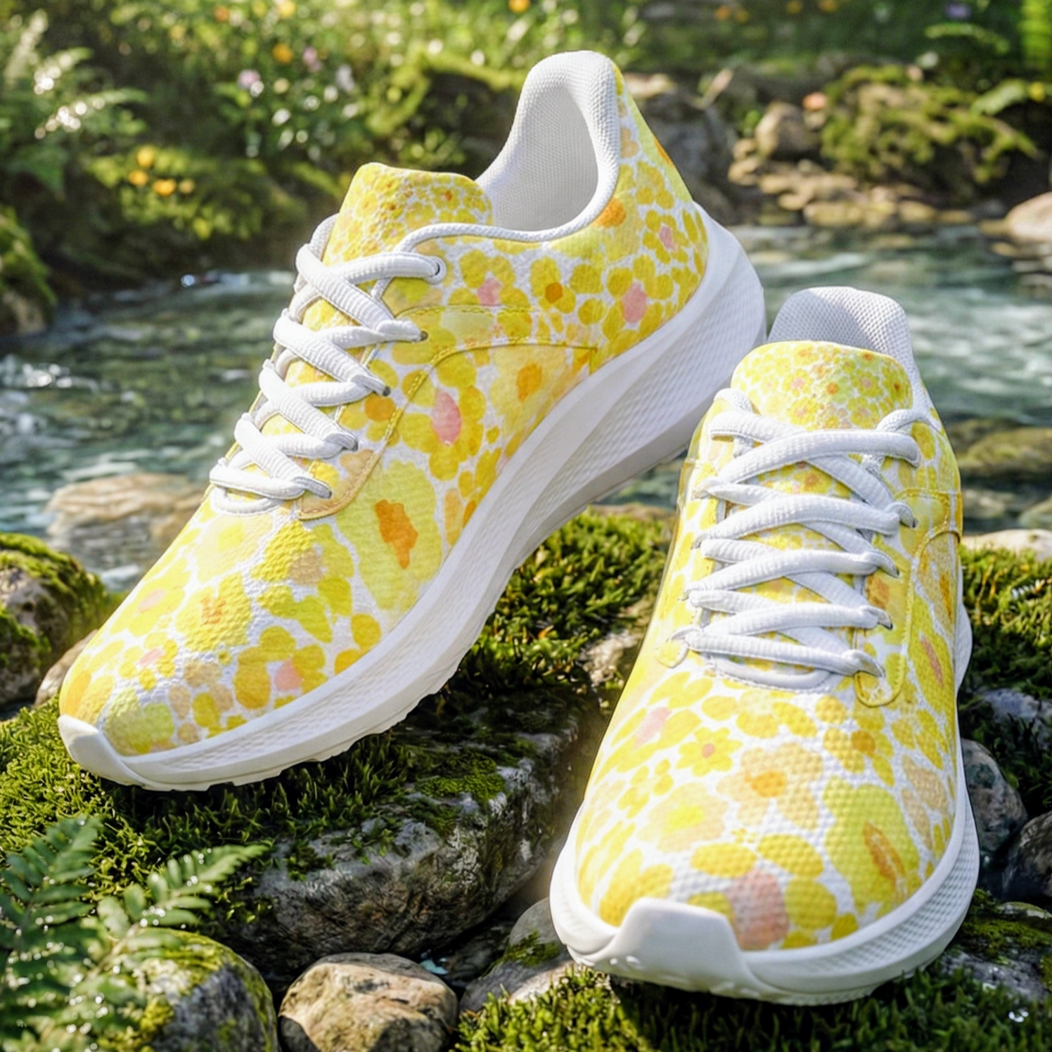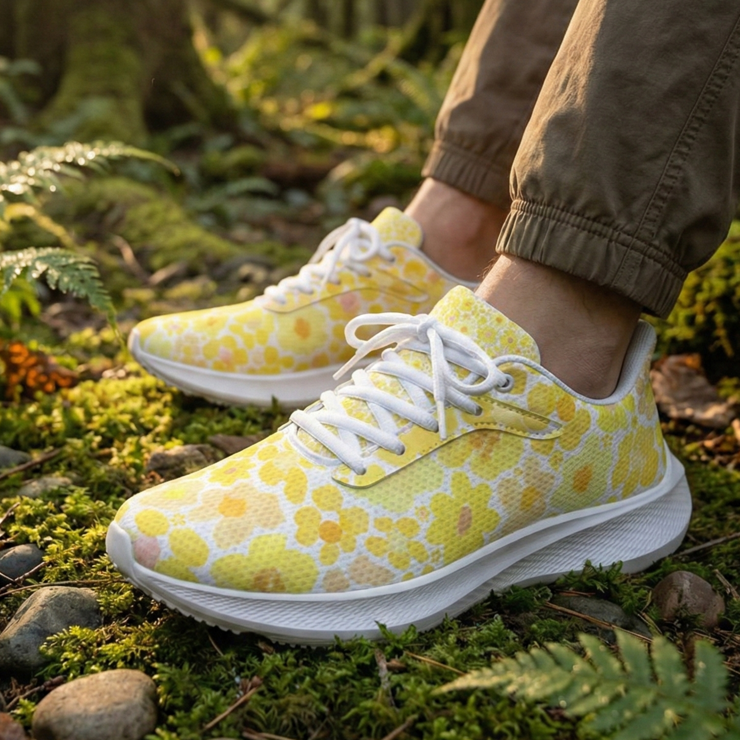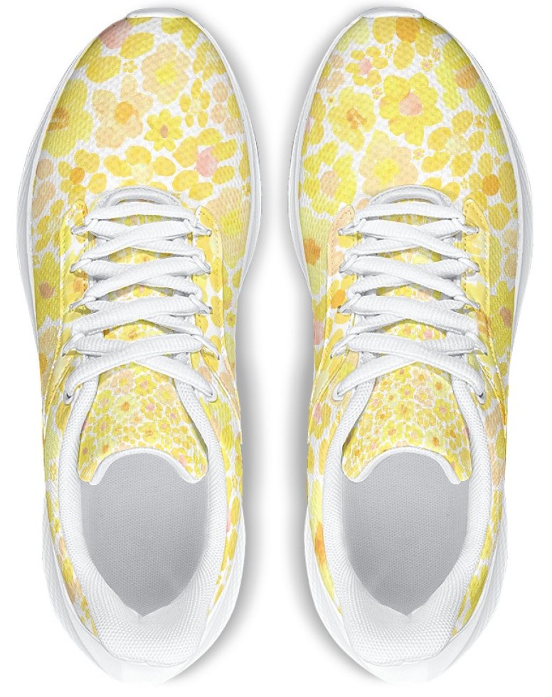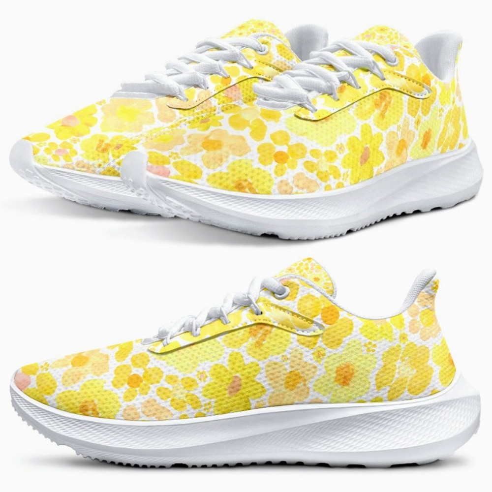 Introducing our yellow floral running shoes, featuring the beautiful "Mountain Bloom" design with painted yellow flower blossoms. Whether you are a runner, a walker, or an art lover, these sneakers are designed to help you feel grounded, free, and more connected to the environment.