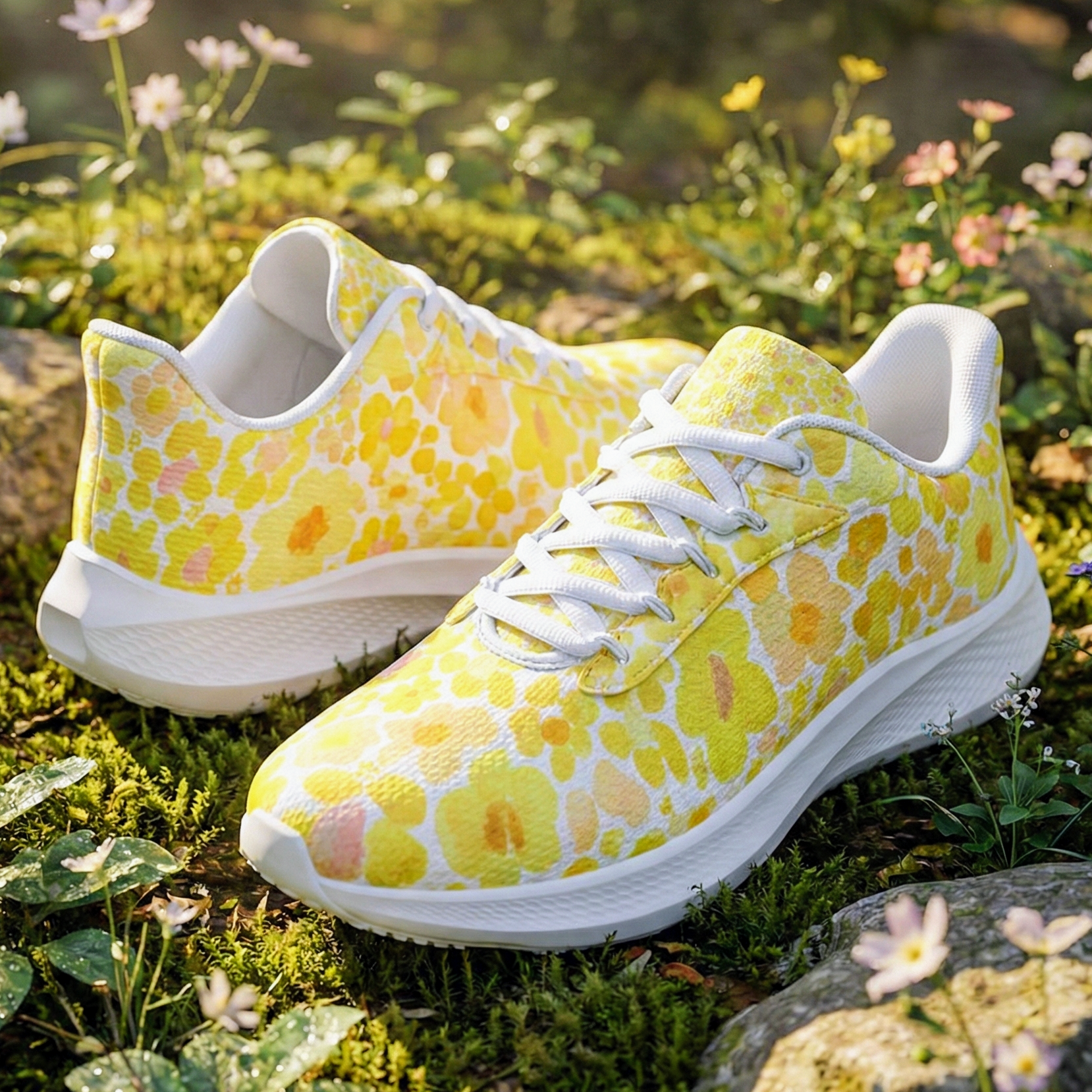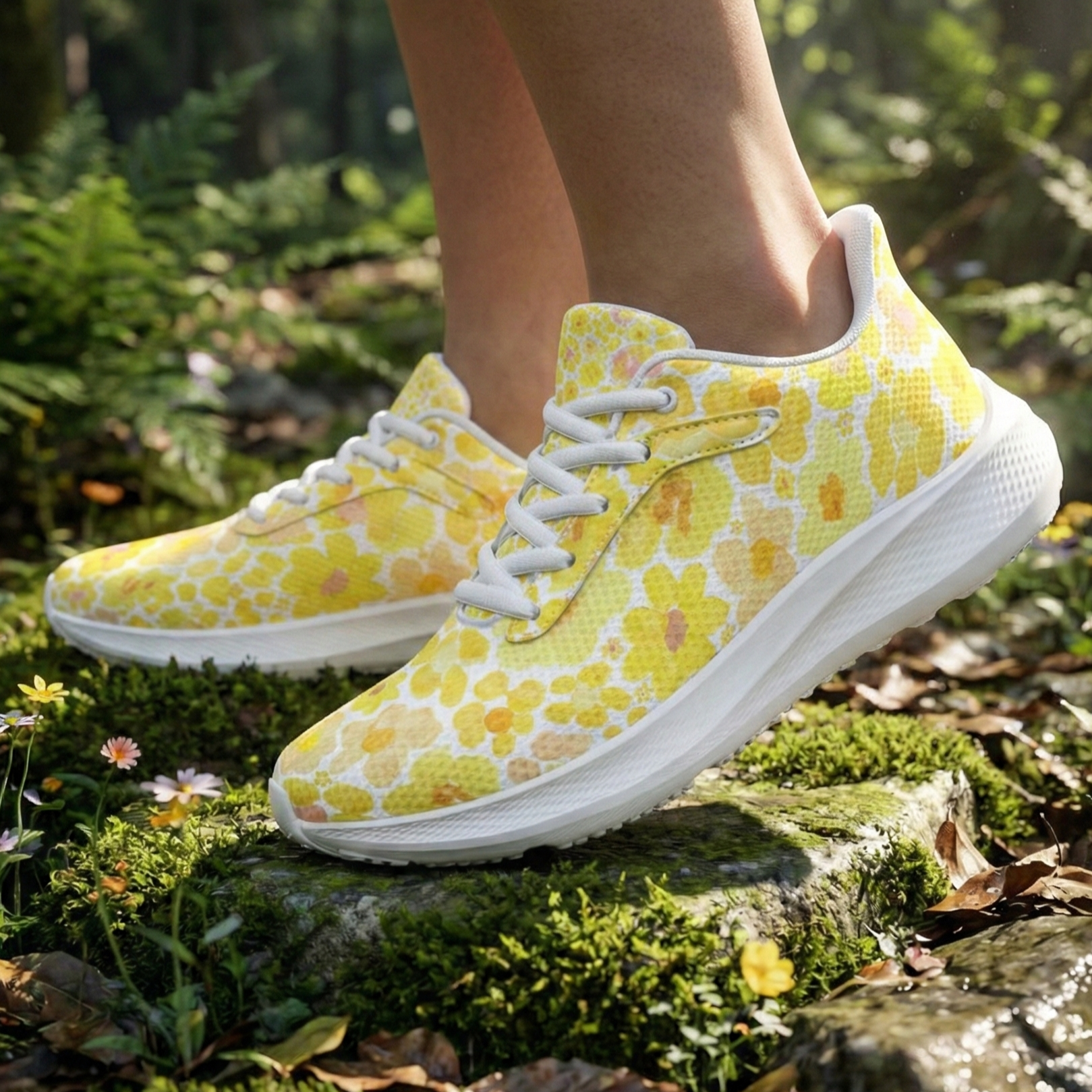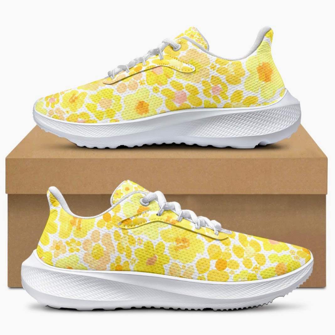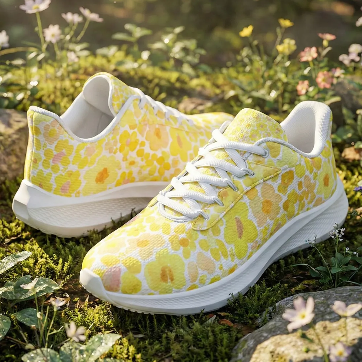 Introducing our yellow floral running shoes, featuring the beautiful "Mountain Bloom" design with painted yellow flower blossoms. Whether you are a runner, a walker, or an art lover, these sneakers are designed to help you feel grounded, free, and more connected to the environment.