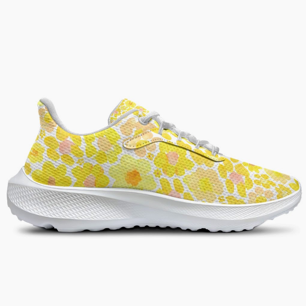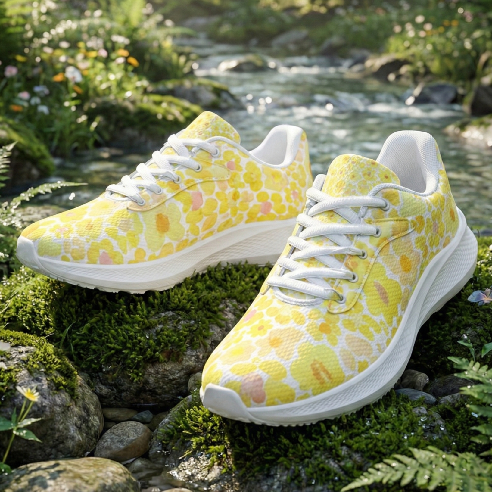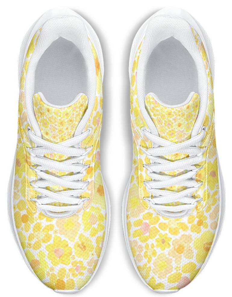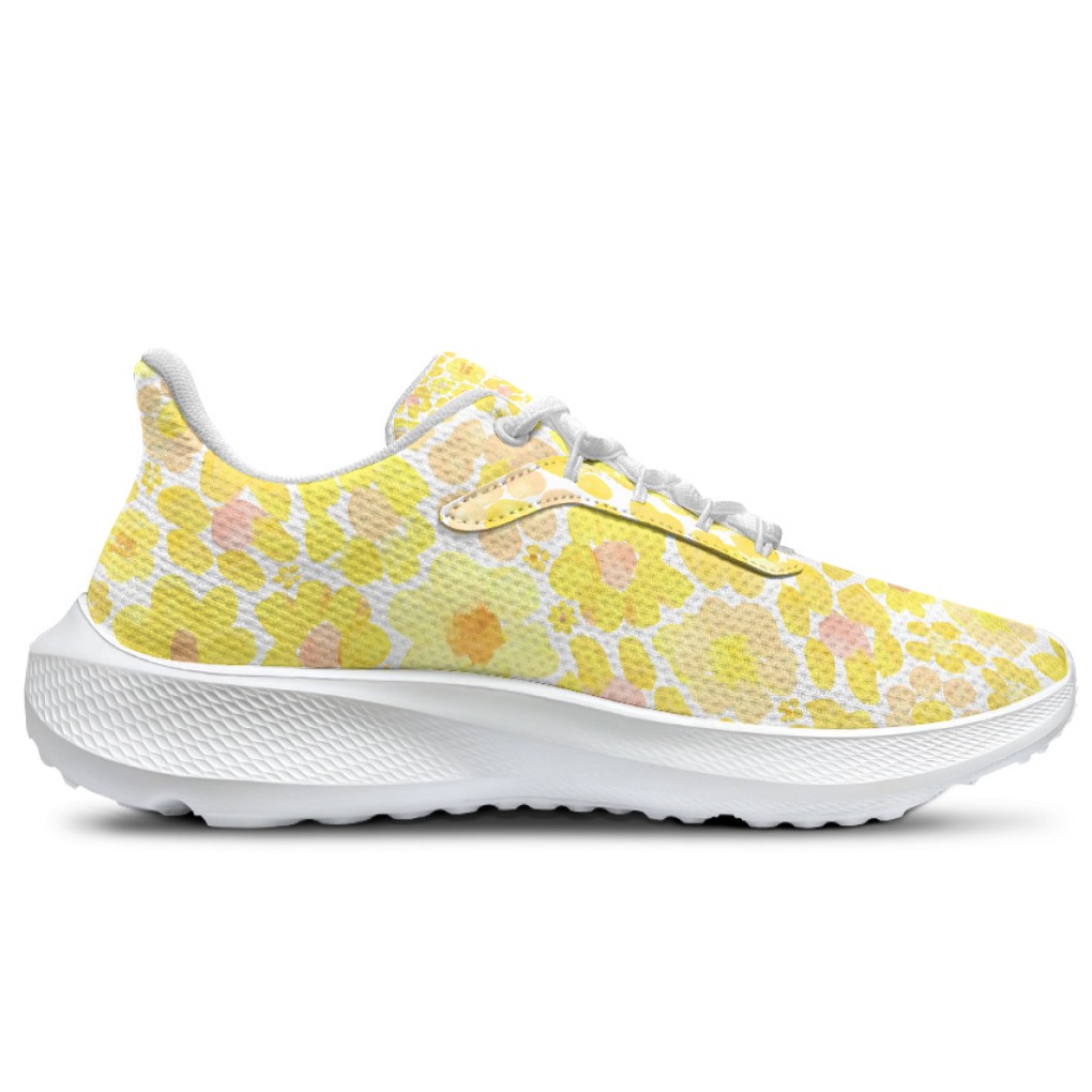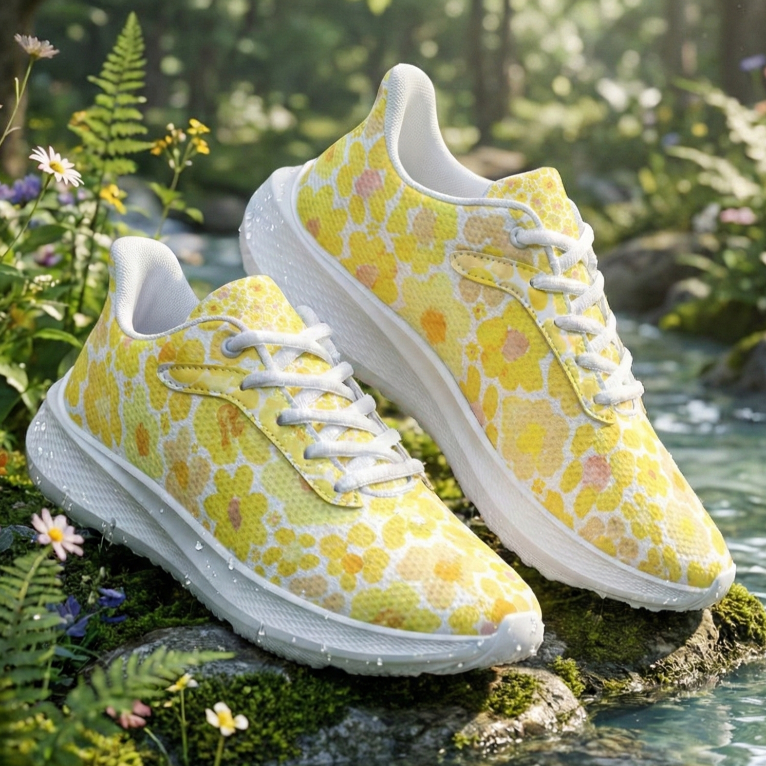 Introducing our yellow floral running shoes, featuring the beautiful "Mountain Bloom" design with painted yellow flower blossoms. Whether you are a runner, a walker, or an art lover, these sneakers are designed to help you feel grounded, free, and more connected to the environment.