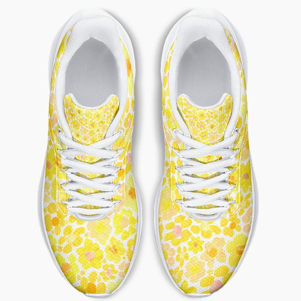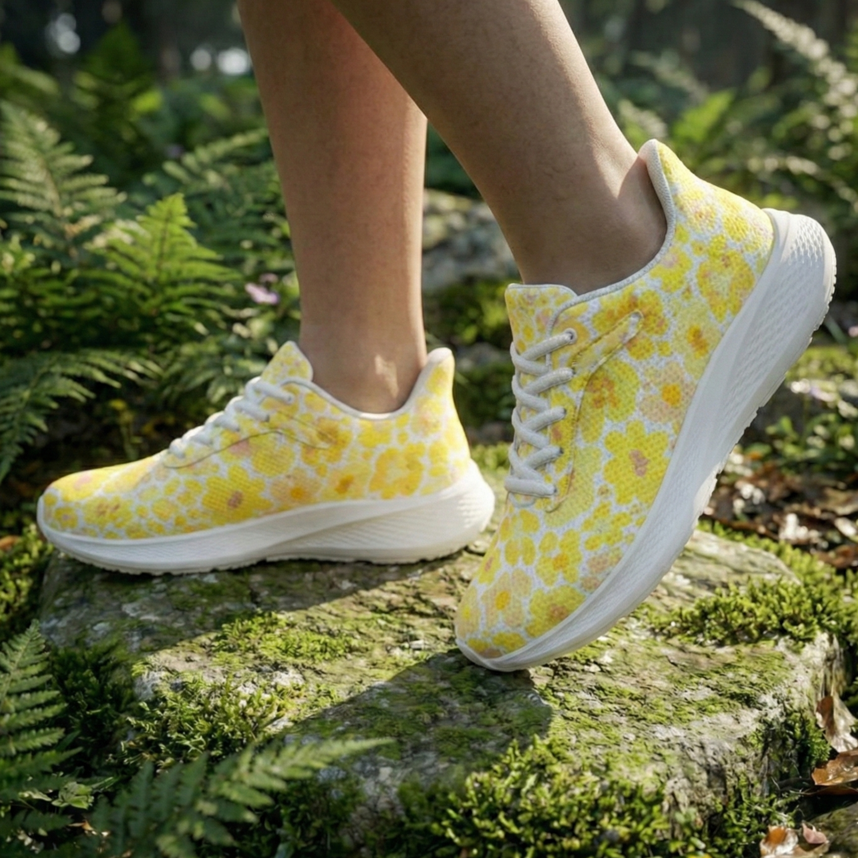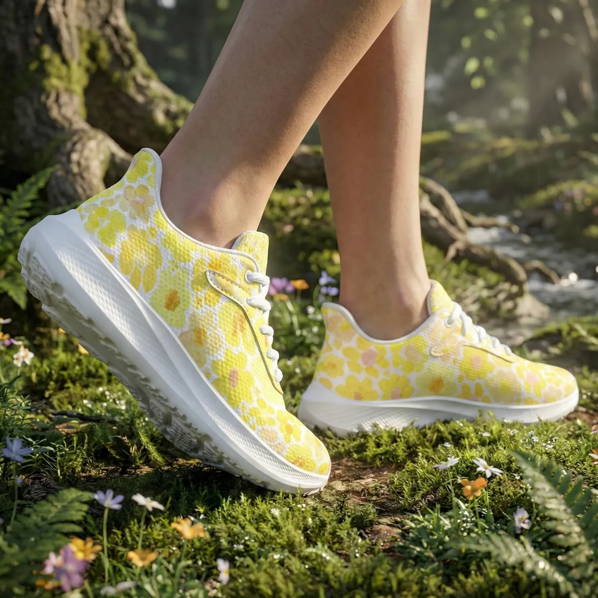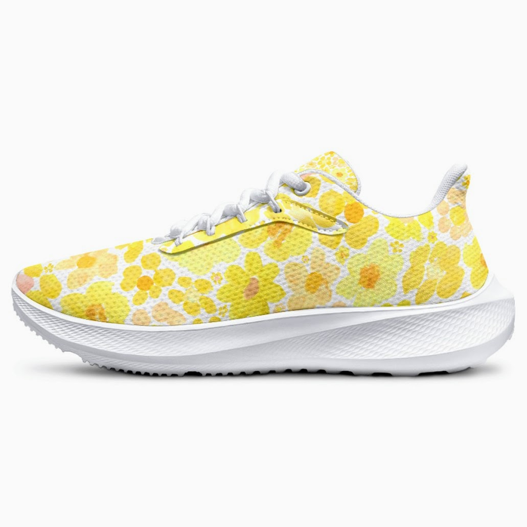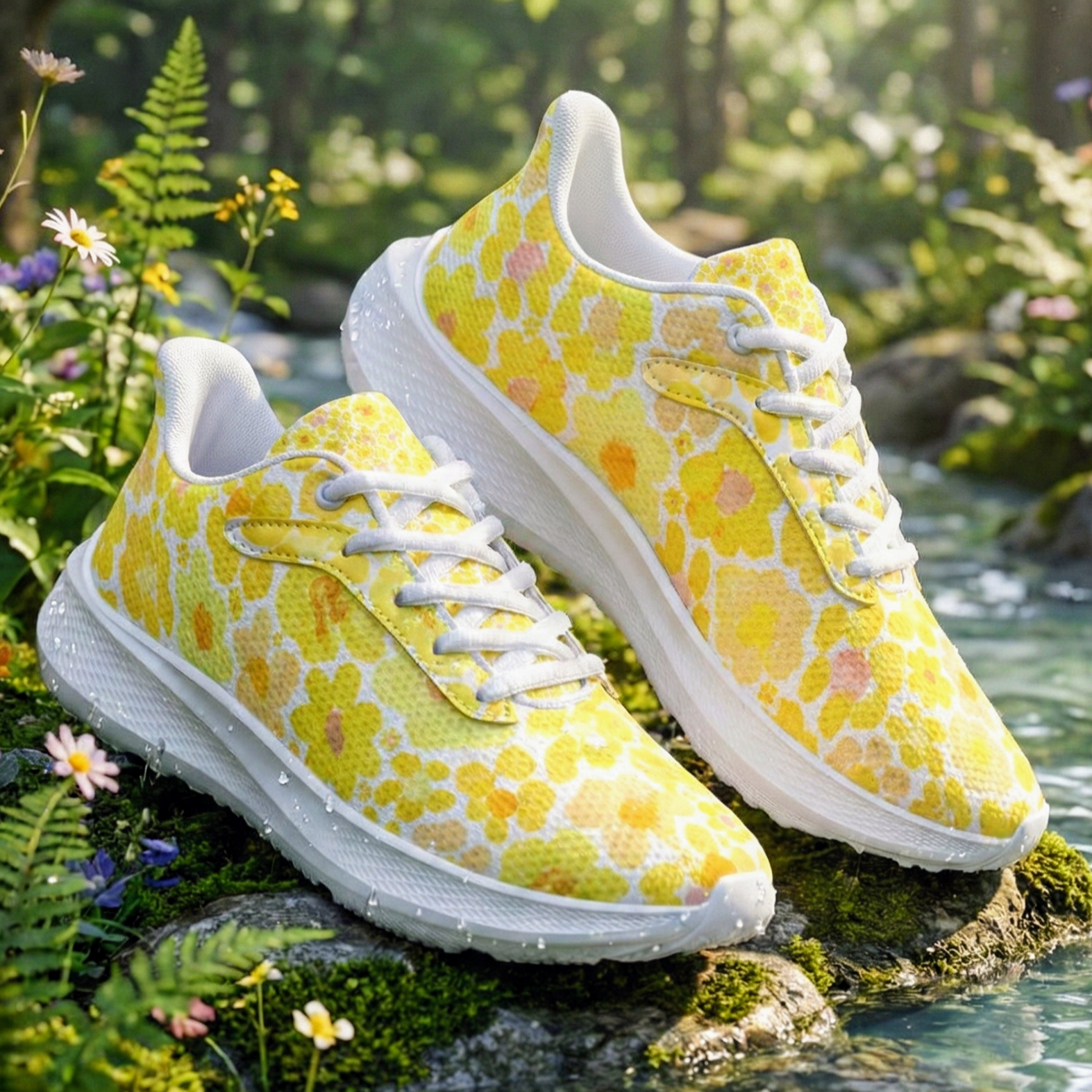 Introducing our yellow floral running shoes, featuring the beautiful "Mountain Bloom" design with painted yellow flower blossoms. Whether you are a runner, a walker, or an art lover, these sneakers are designed to help you feel grounded, free, and more connected to the environment.