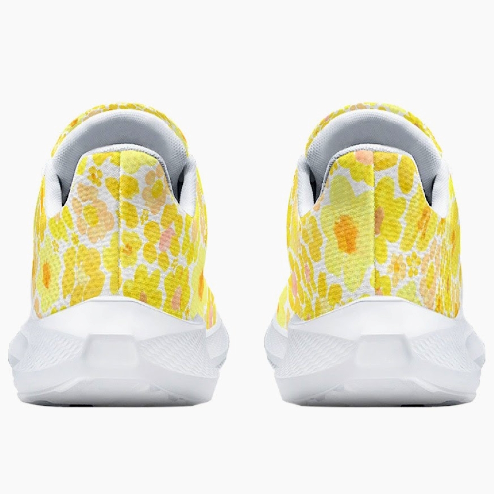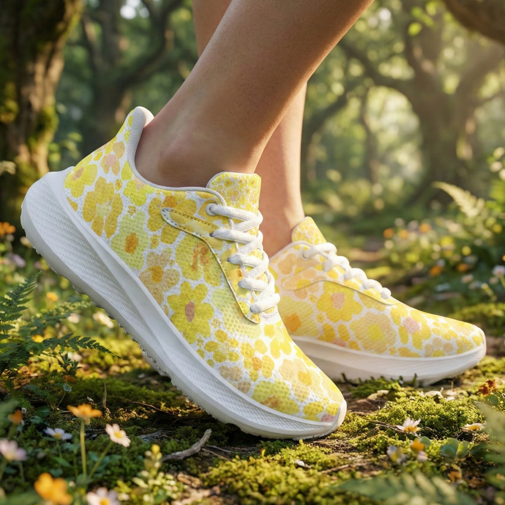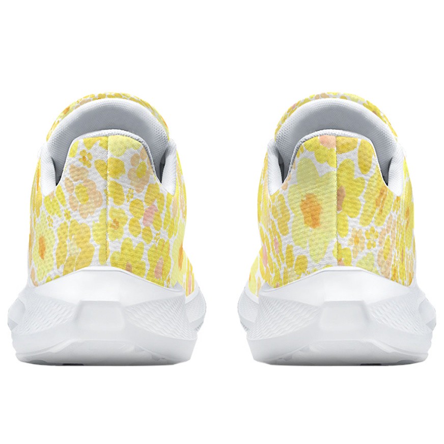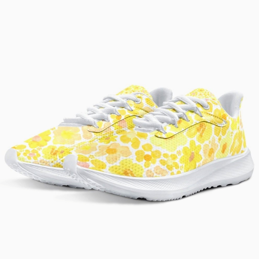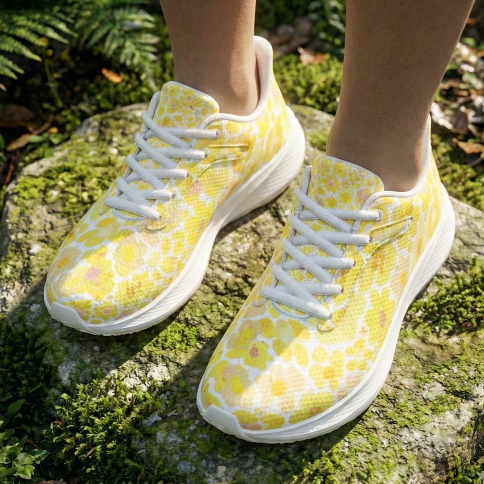Introducing our yellow floral running shoes, featuring the beautiful "Mountain Bloom" design with painted yellow flower blossoms. Whether you are a runner, a walker, or an art lover, these sneakers are designed to help you feel grounded, free, and more connected to the environment.