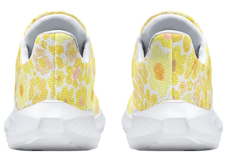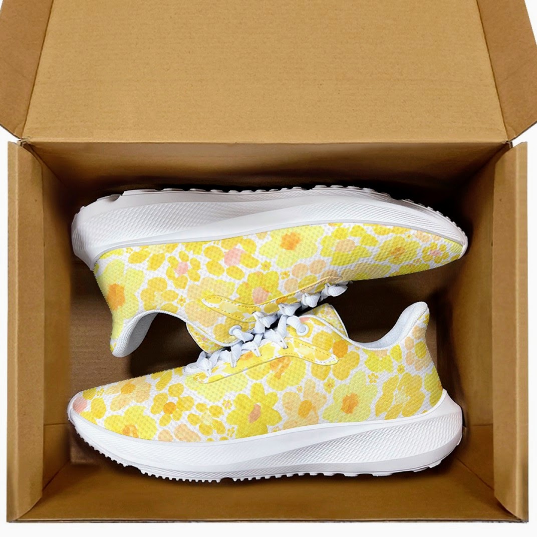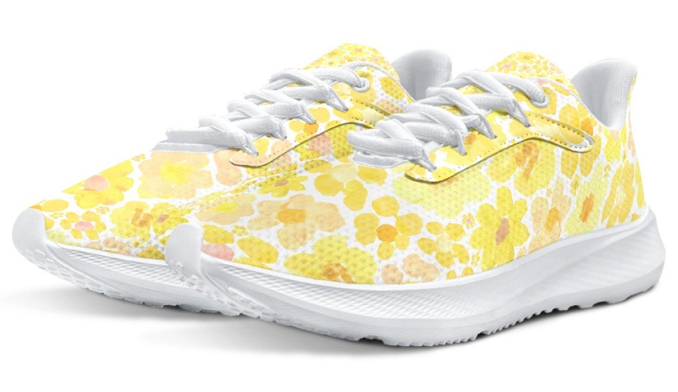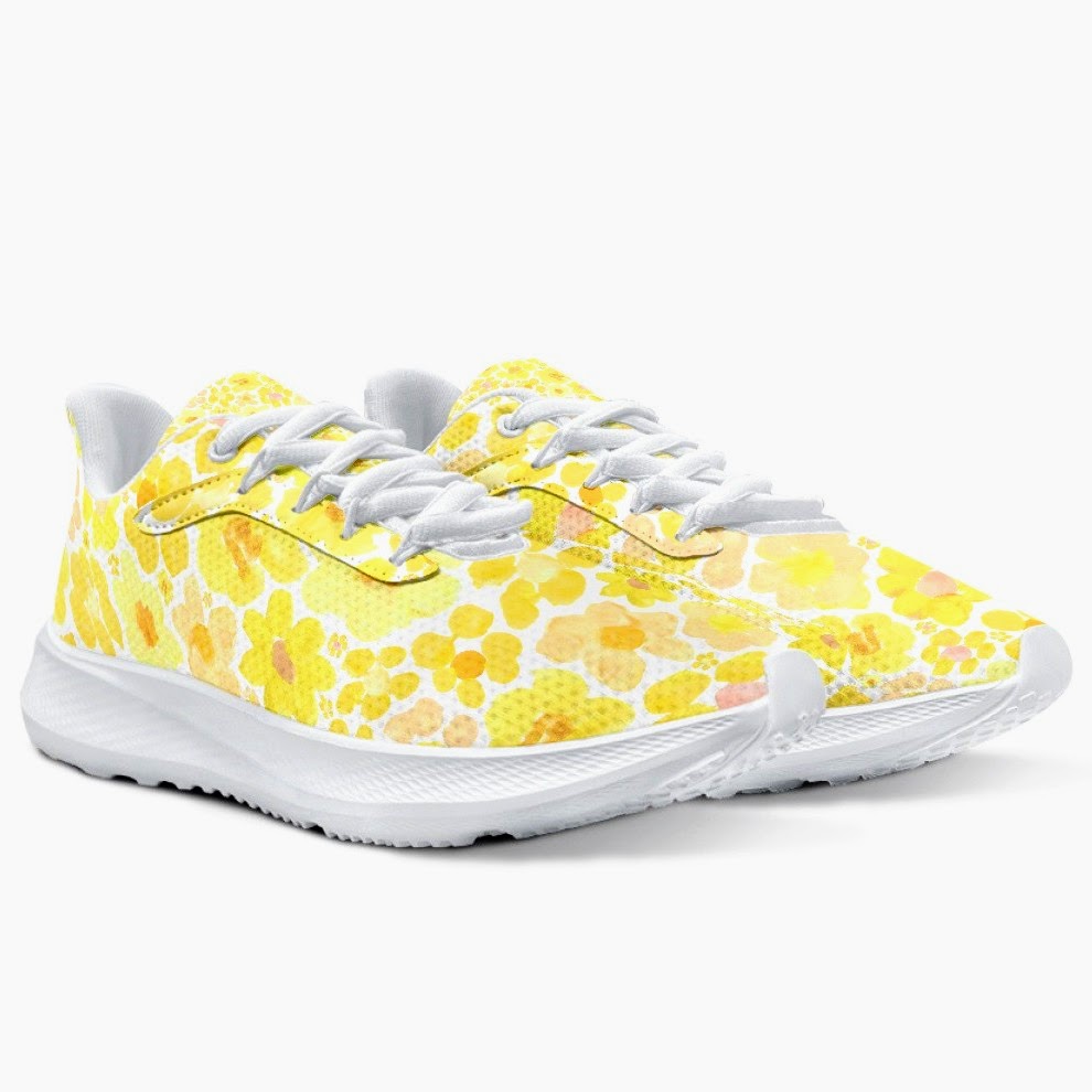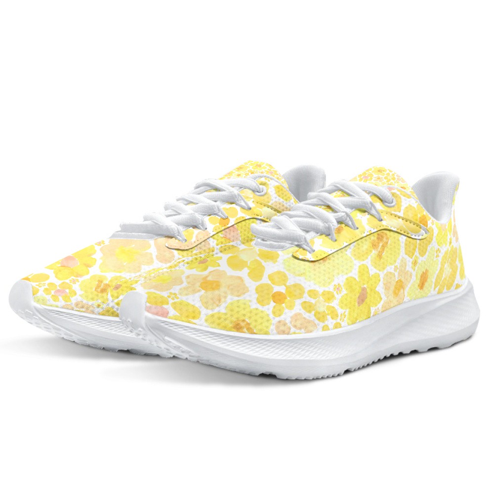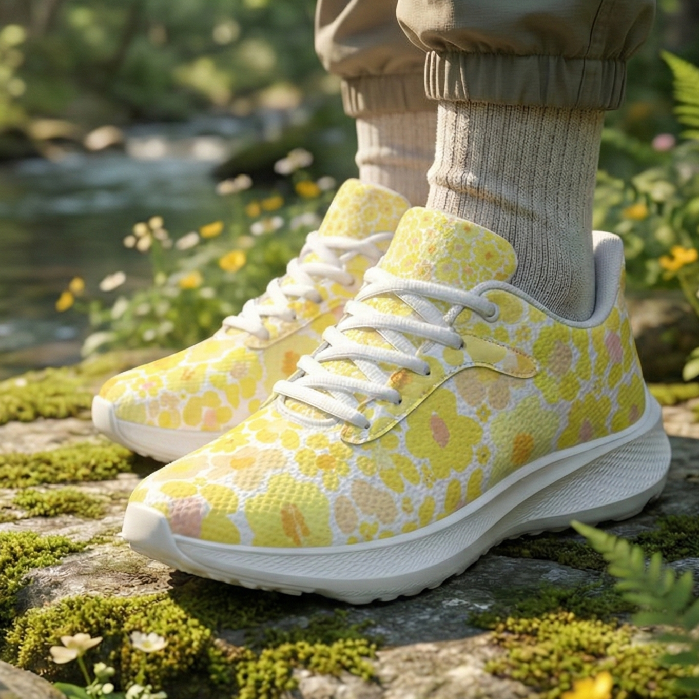 Introducing our yellow floral running shoes, featuring the beautiful "Mountain Bloom" design with painted yellow flower blossoms. Whether you are a runner, a walker, or an art lover, these sneakers are designed to help you feel grounded, free, and more connected to the environment.