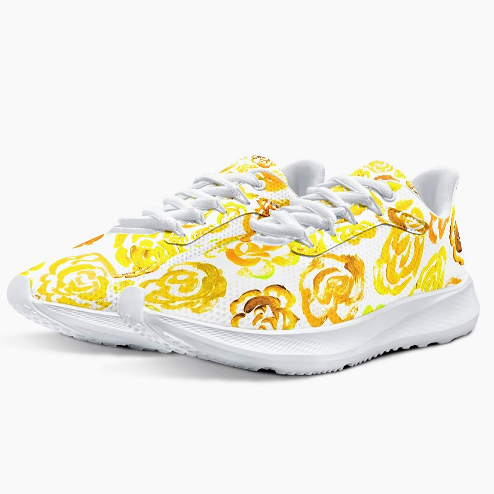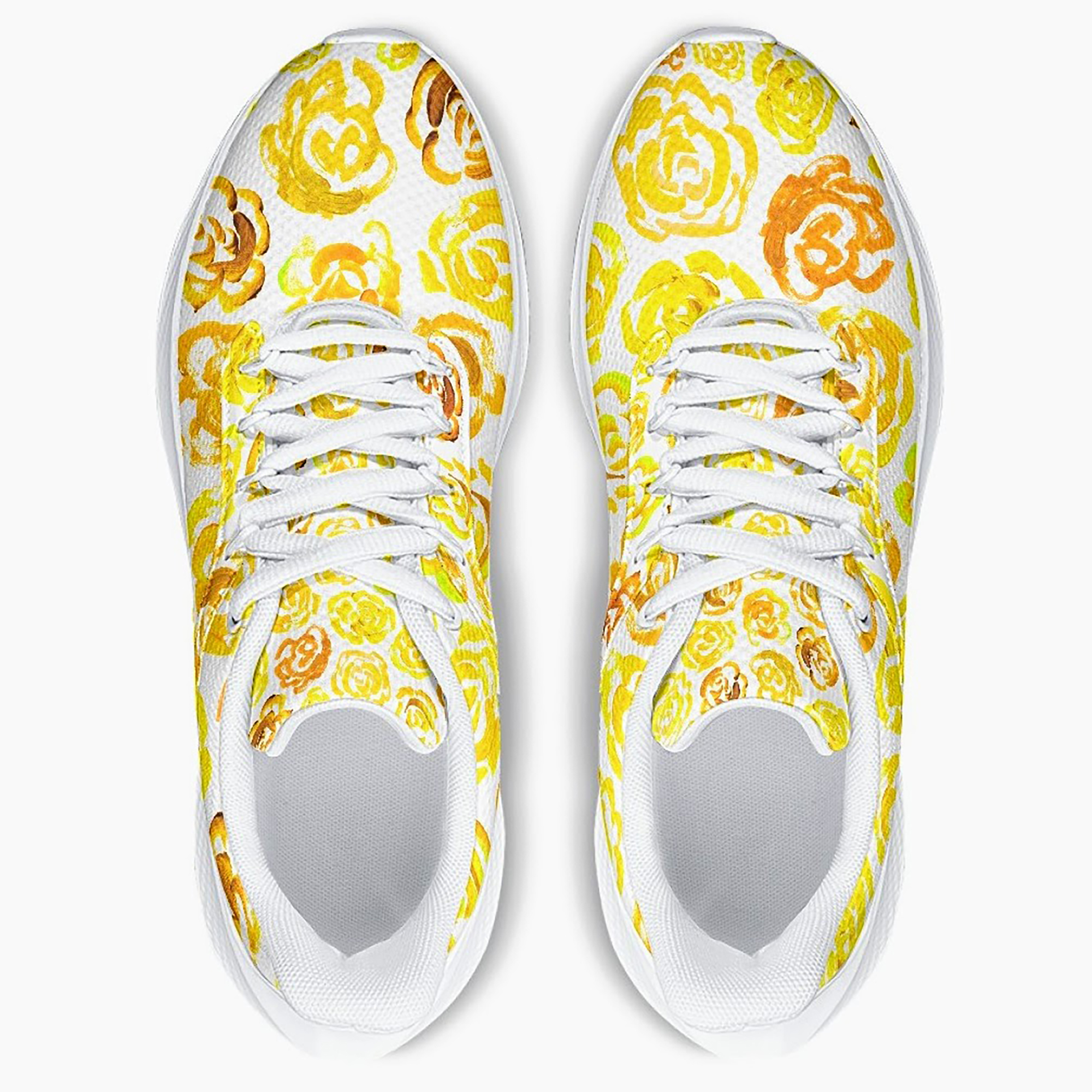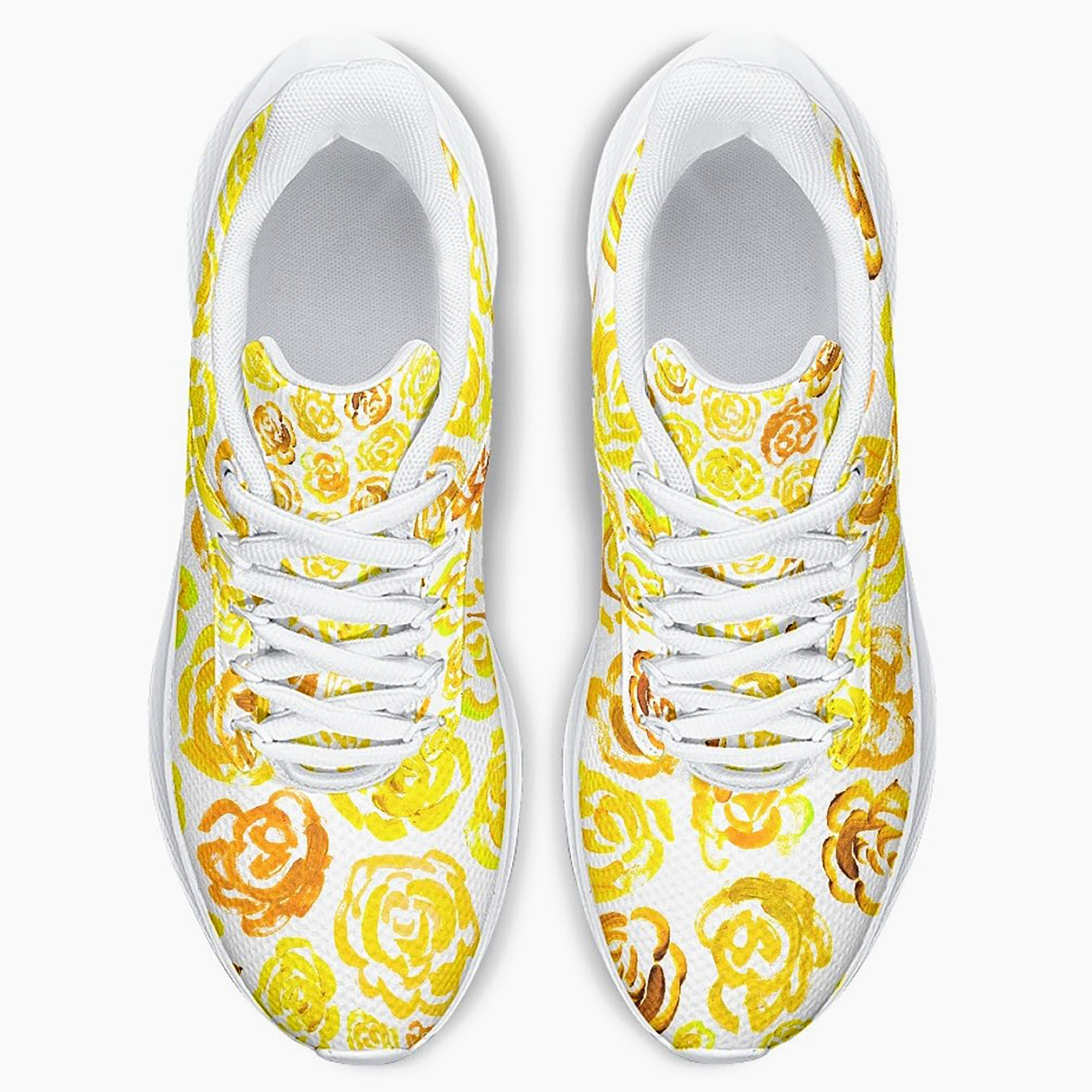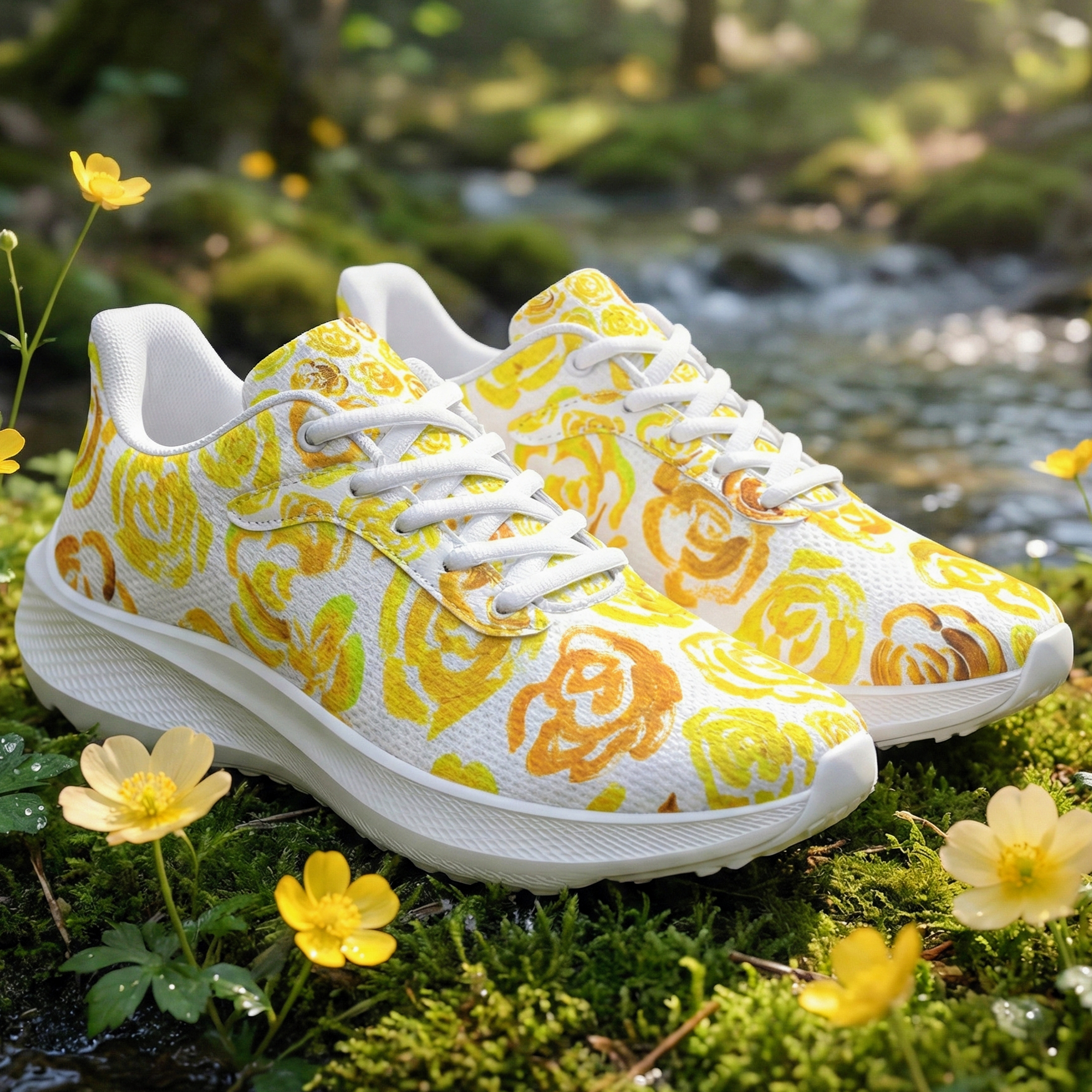 Unisex running shoes with yellow flower blossoms. Women's & men's lightweight sports shoes.