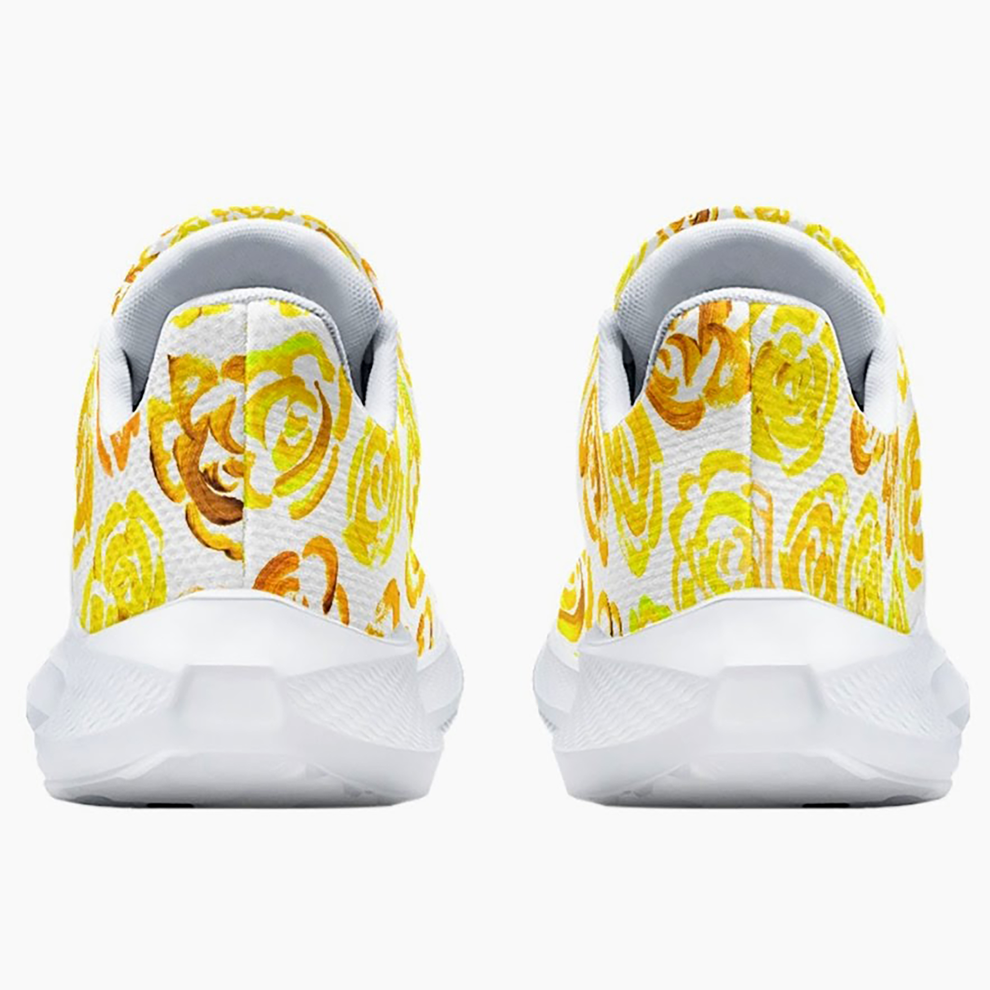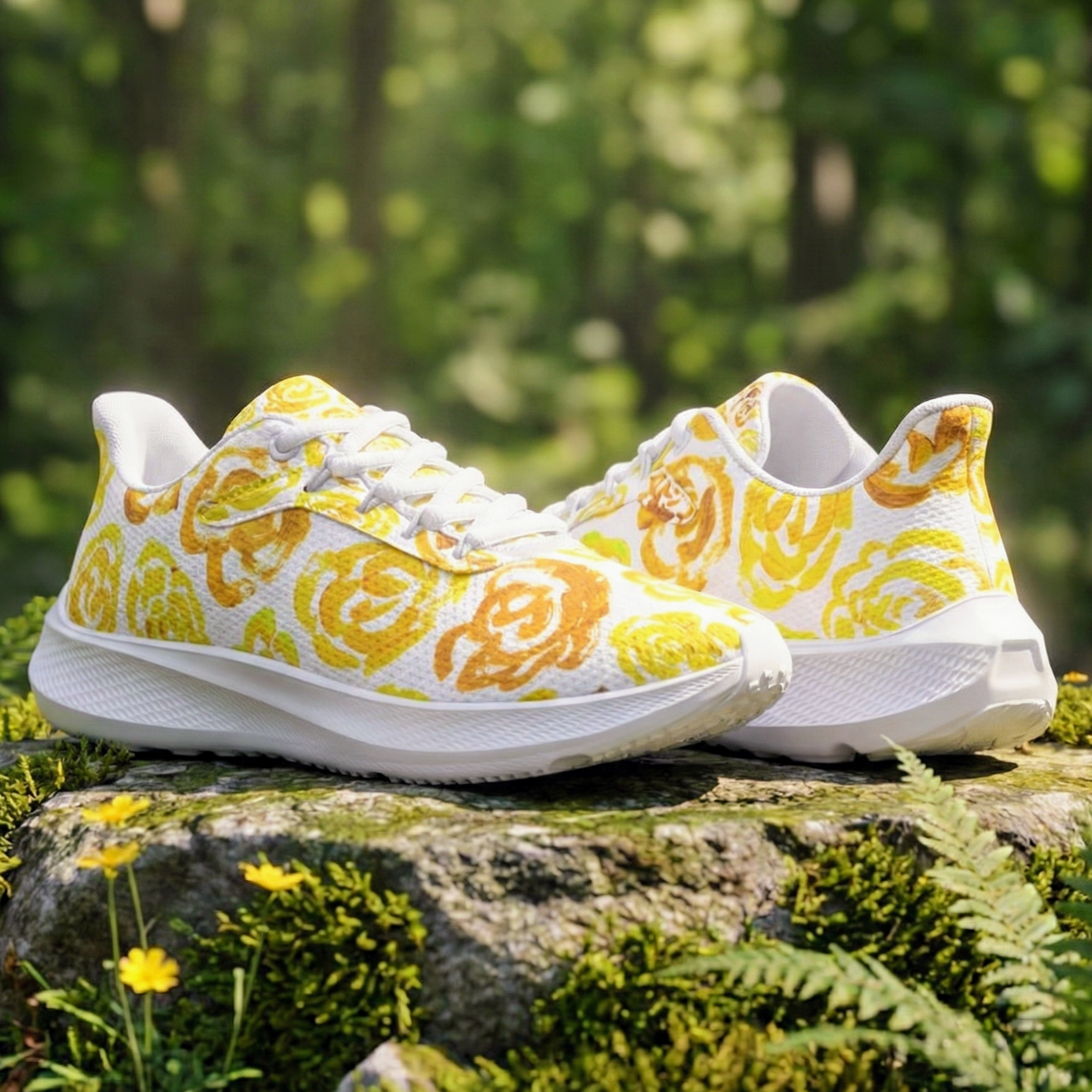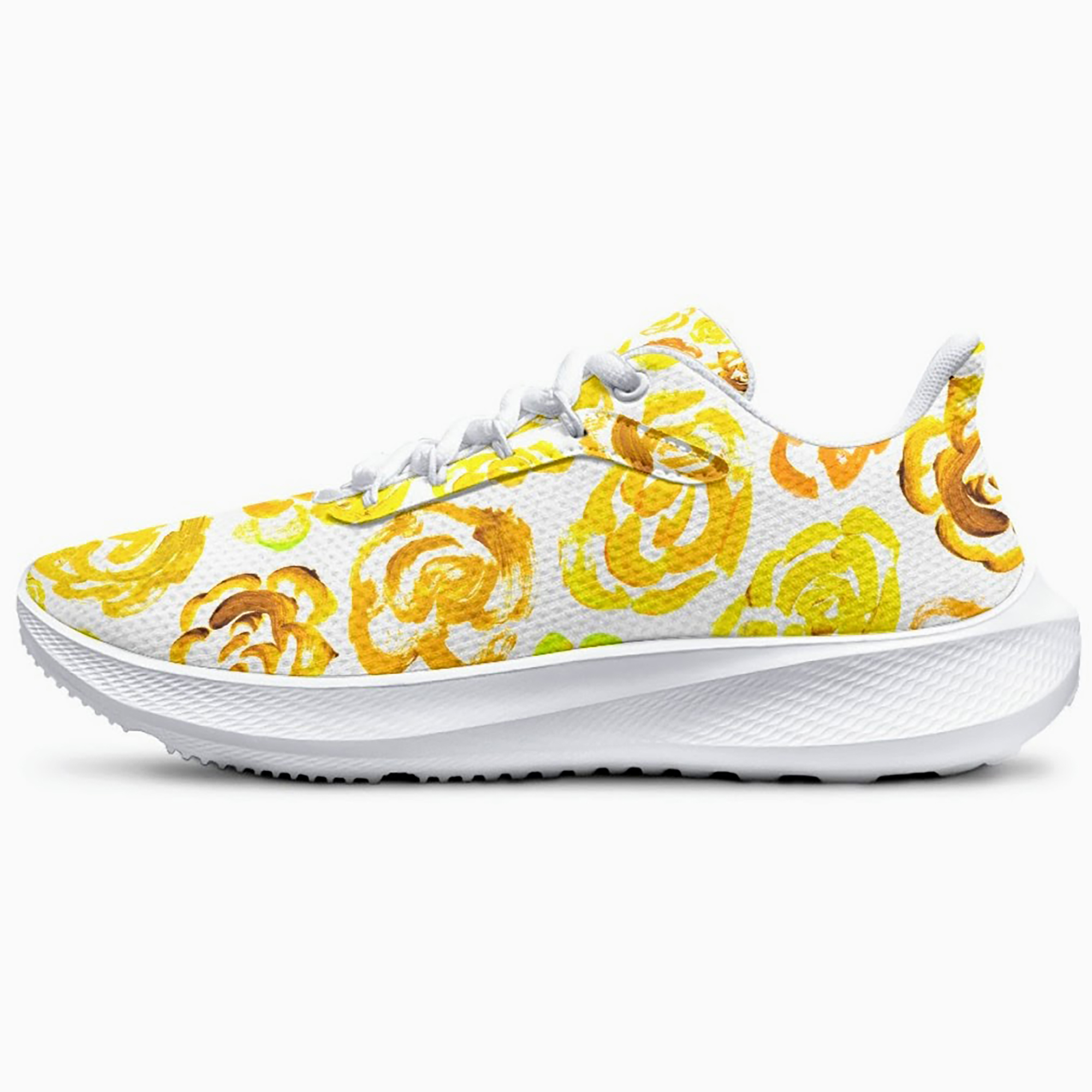 Unisex running shoes with yellow flower blossoms. Women's & men's lightweight sports shoes.