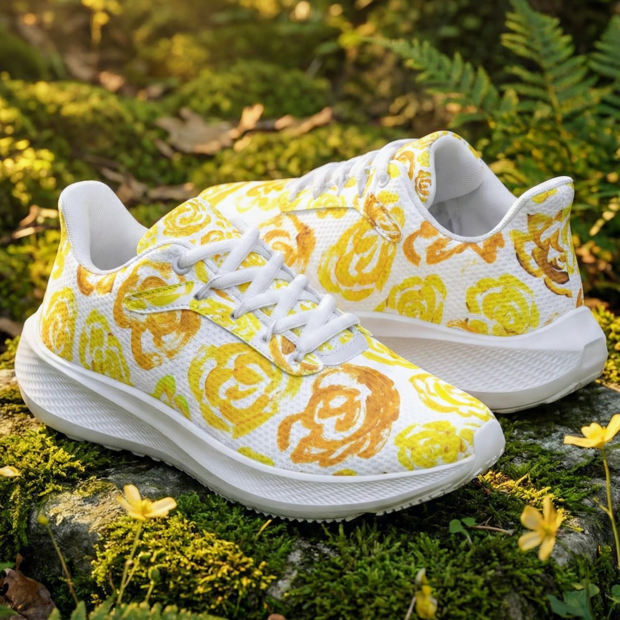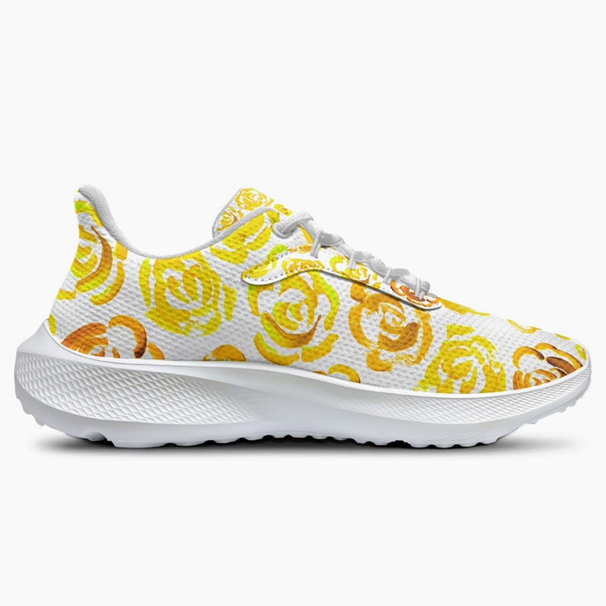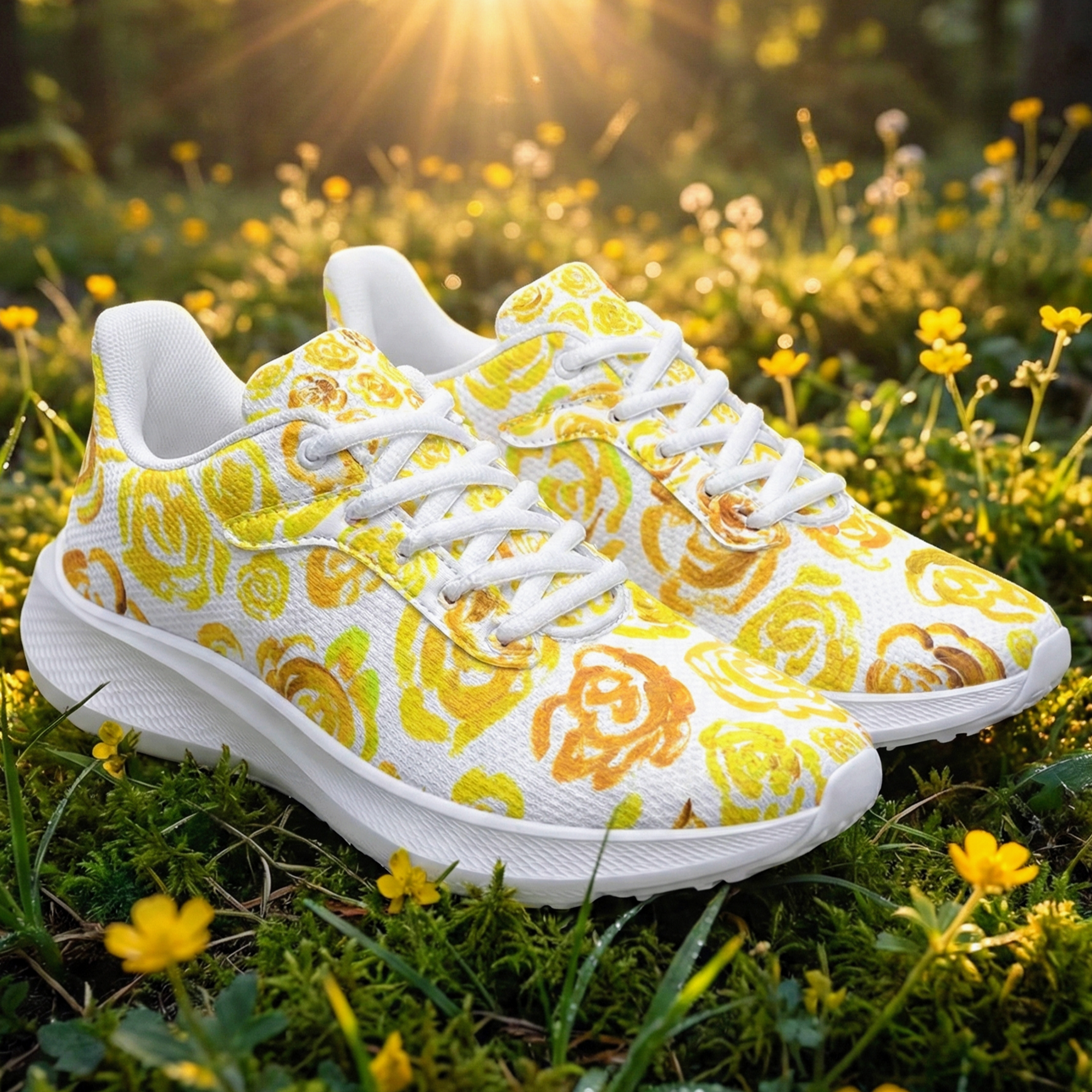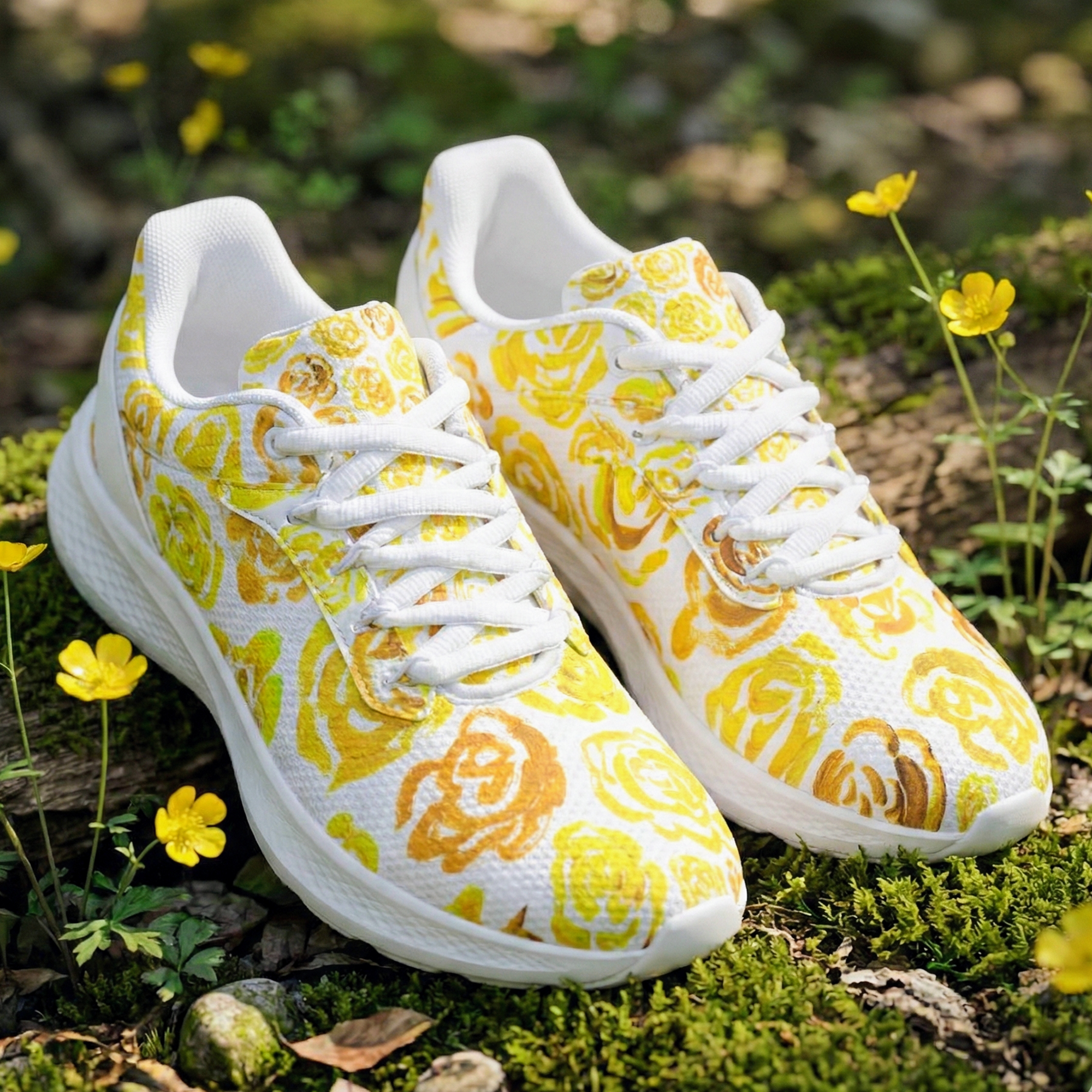 Unisex running shoes with yellow flower blossoms. Women's & men's lightweight sports shoes.